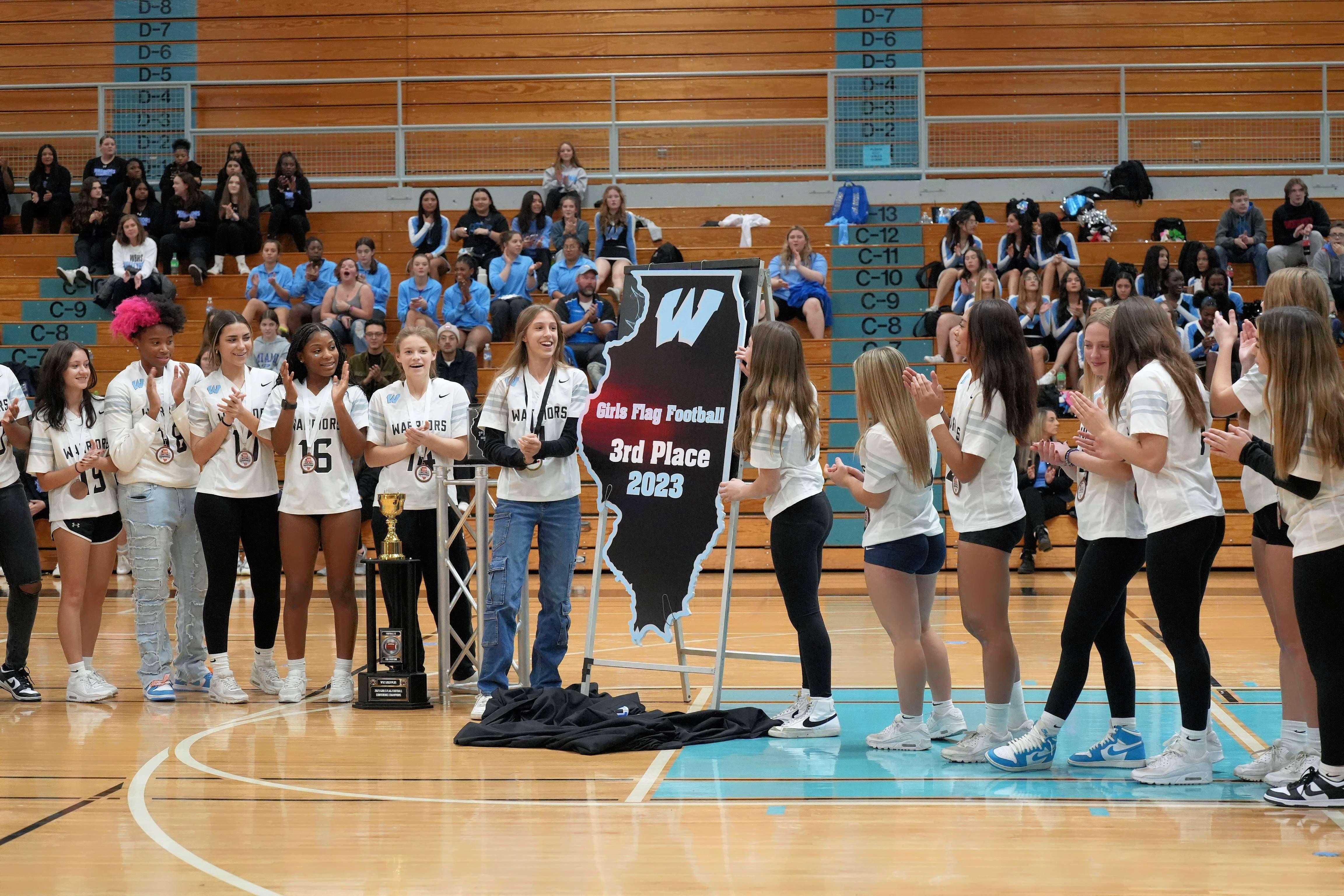 The night also included ceremonies to unveil the state banners for the Flag Football Team and the Girls Volleyball Team. Flag Football placed third in the Chicago Bears Girls Flag State Championship, and Girls Volleyball placed third in the Illinois High School Association (IHSA) Class 4A State Finals.