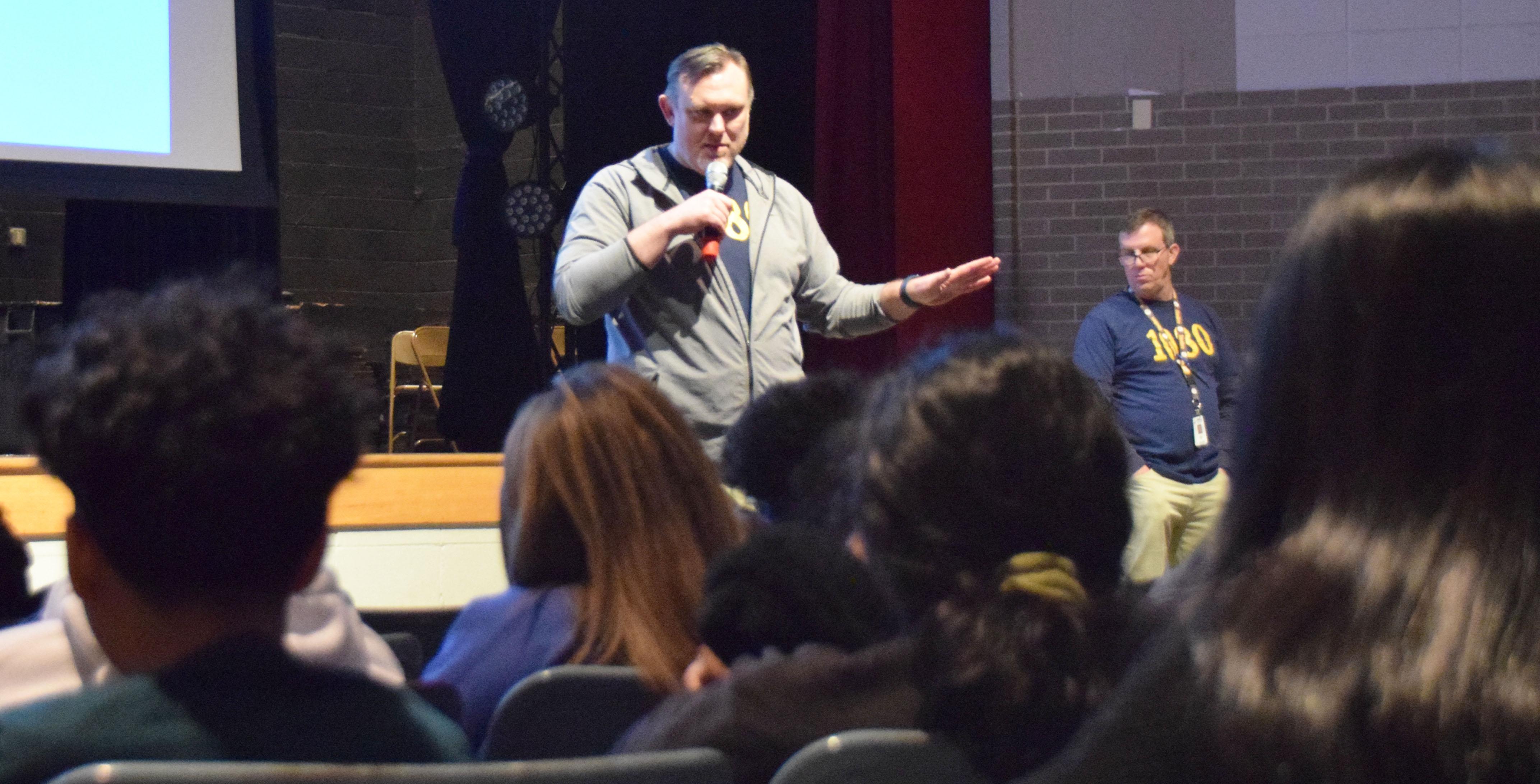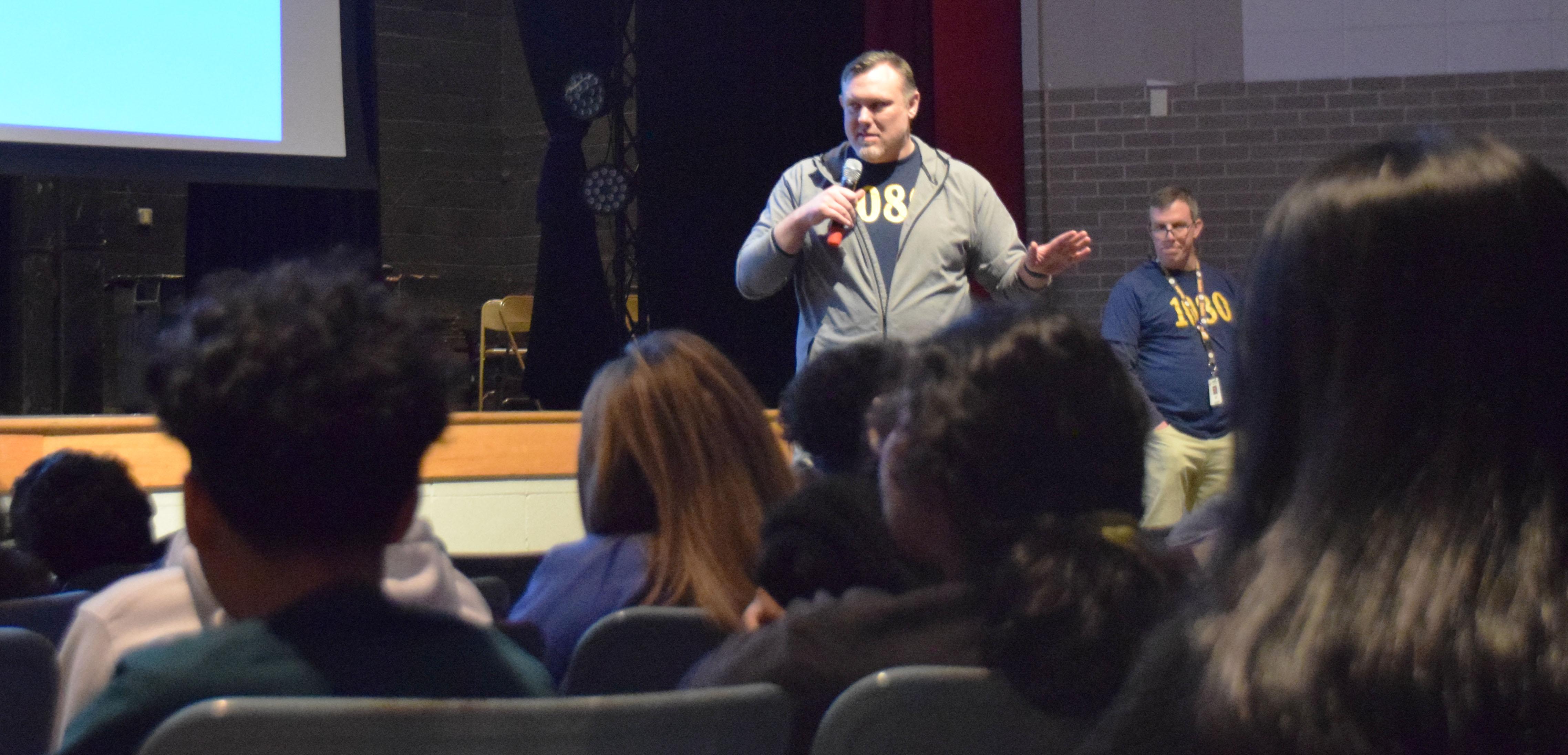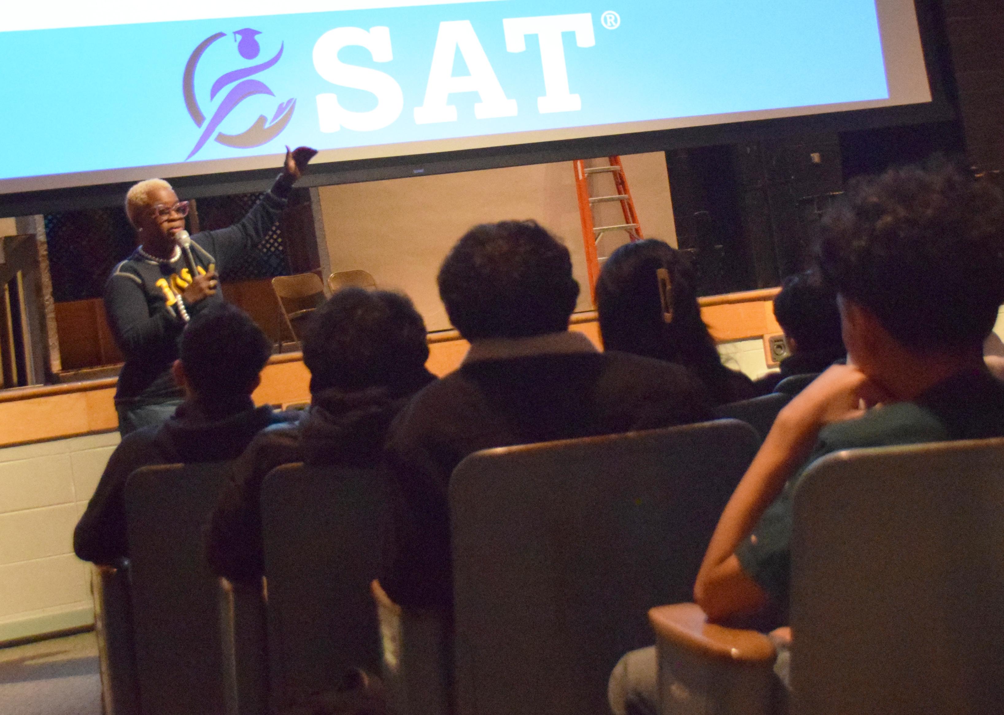The Addison Trail Counseling Department and administration are working with members of the class of 2025 to help them achieve a score of 1080 or higher on the SAT, or improve their score by at least 60 points from the PSAT (pre-exam) they took this past fall. Students who reach or surpass those benchmarks will be entered into a raffle to receive free prom tickets, free homecoming tickets, or a free parking pass. To help share this information, an assembly took place on Jan. 17 (see a photo gallery from the event above, and click on the images for photo captions).