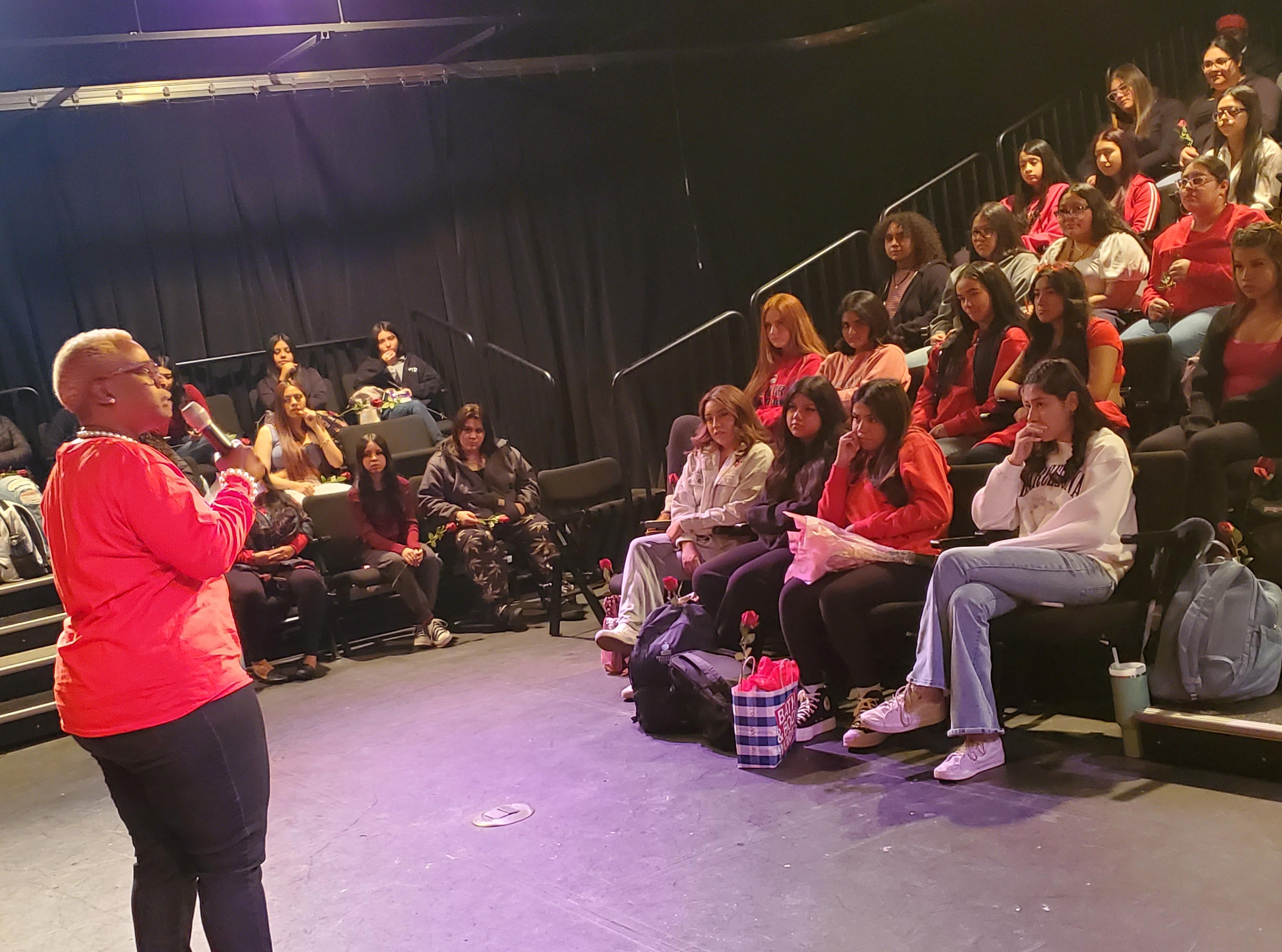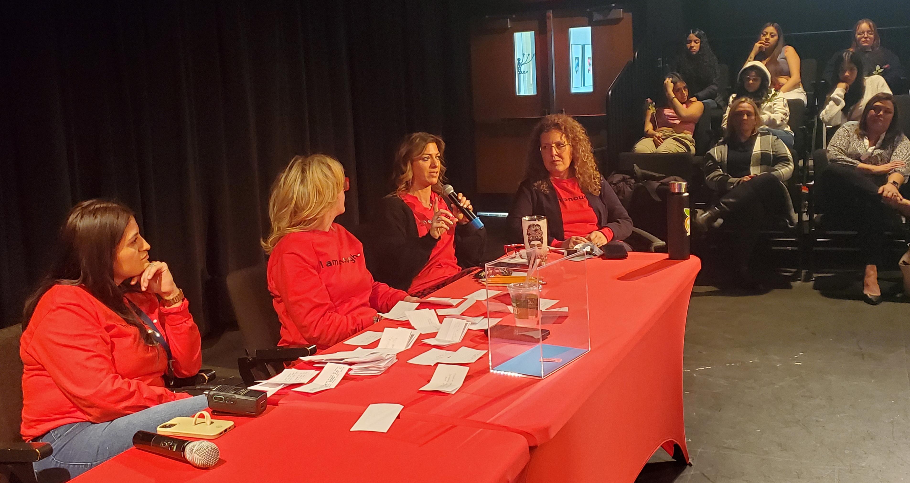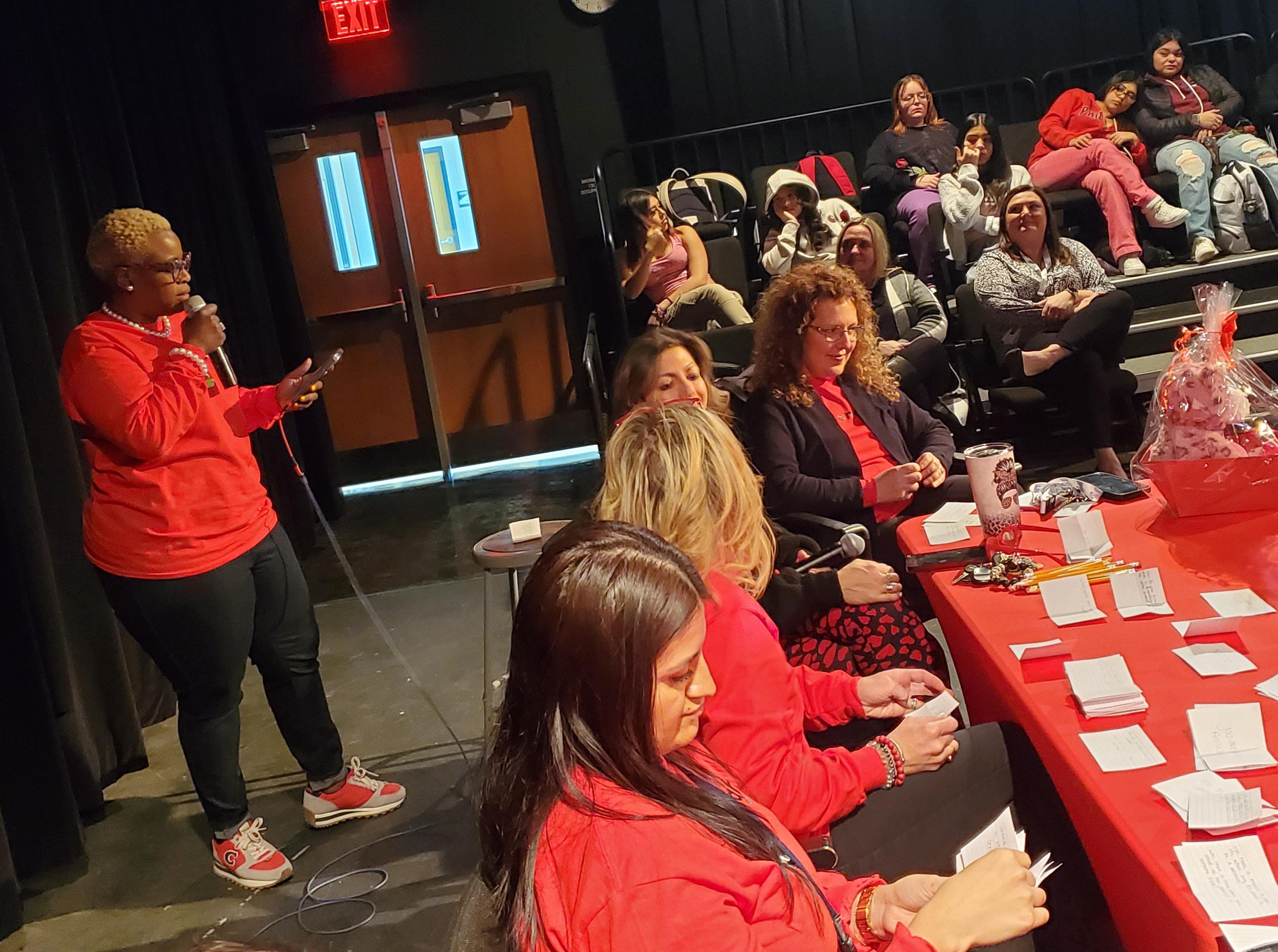 S.H.E. Day is coordinated by Addison Trail Student Success Coordinator VaLarie Humphrey. During the event, Humphrey used a visual demonstration to show how life events and adversity don’t change/define your true inner value. Students then had an opportunity to ask questions and discuss a variety of topics with a “red table” panel of District 88 and Addison Trail administrators and staff members. The panel shared thoughts about relationships and respect, offered advice with regard to believing that “you are enough” and more.