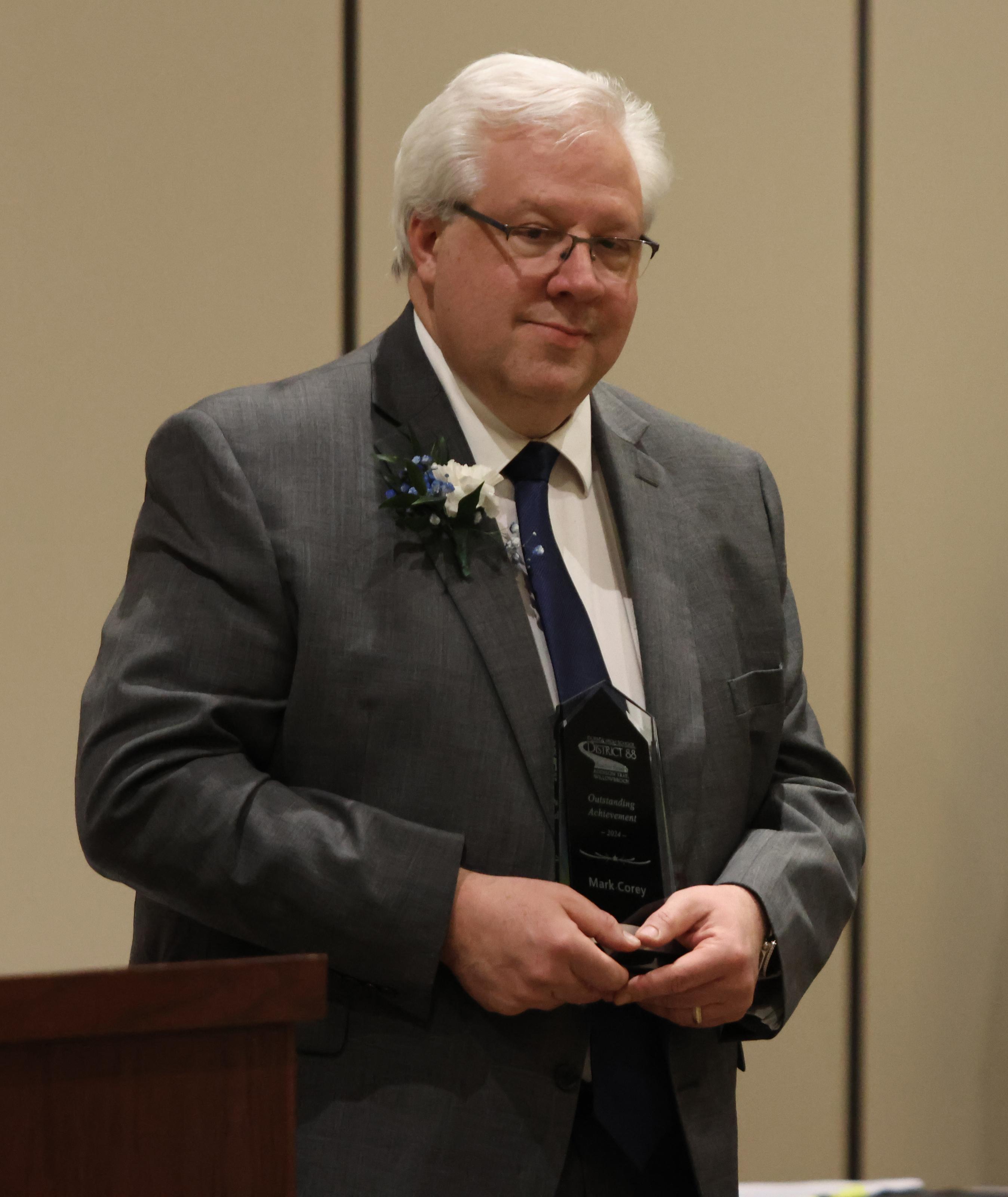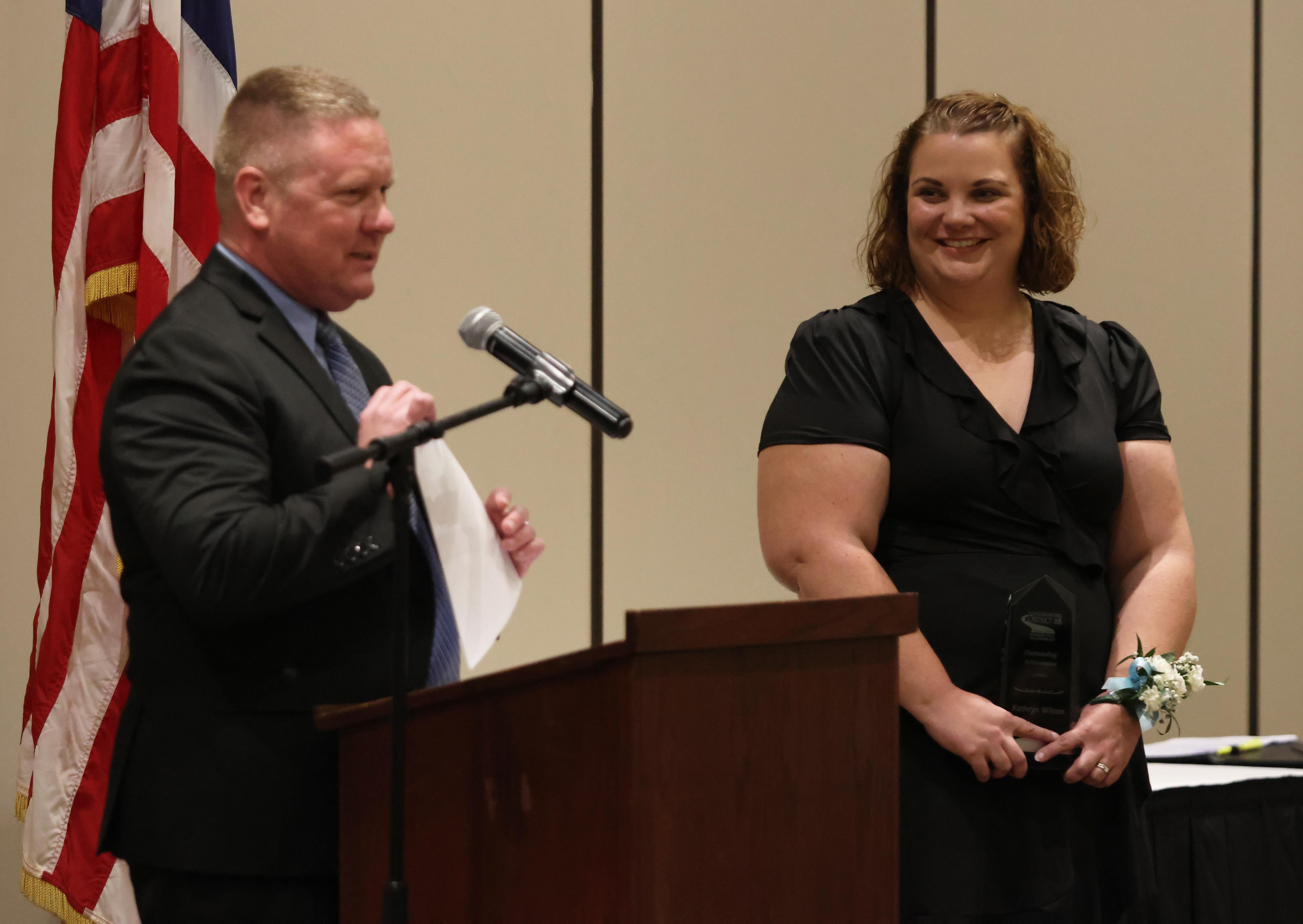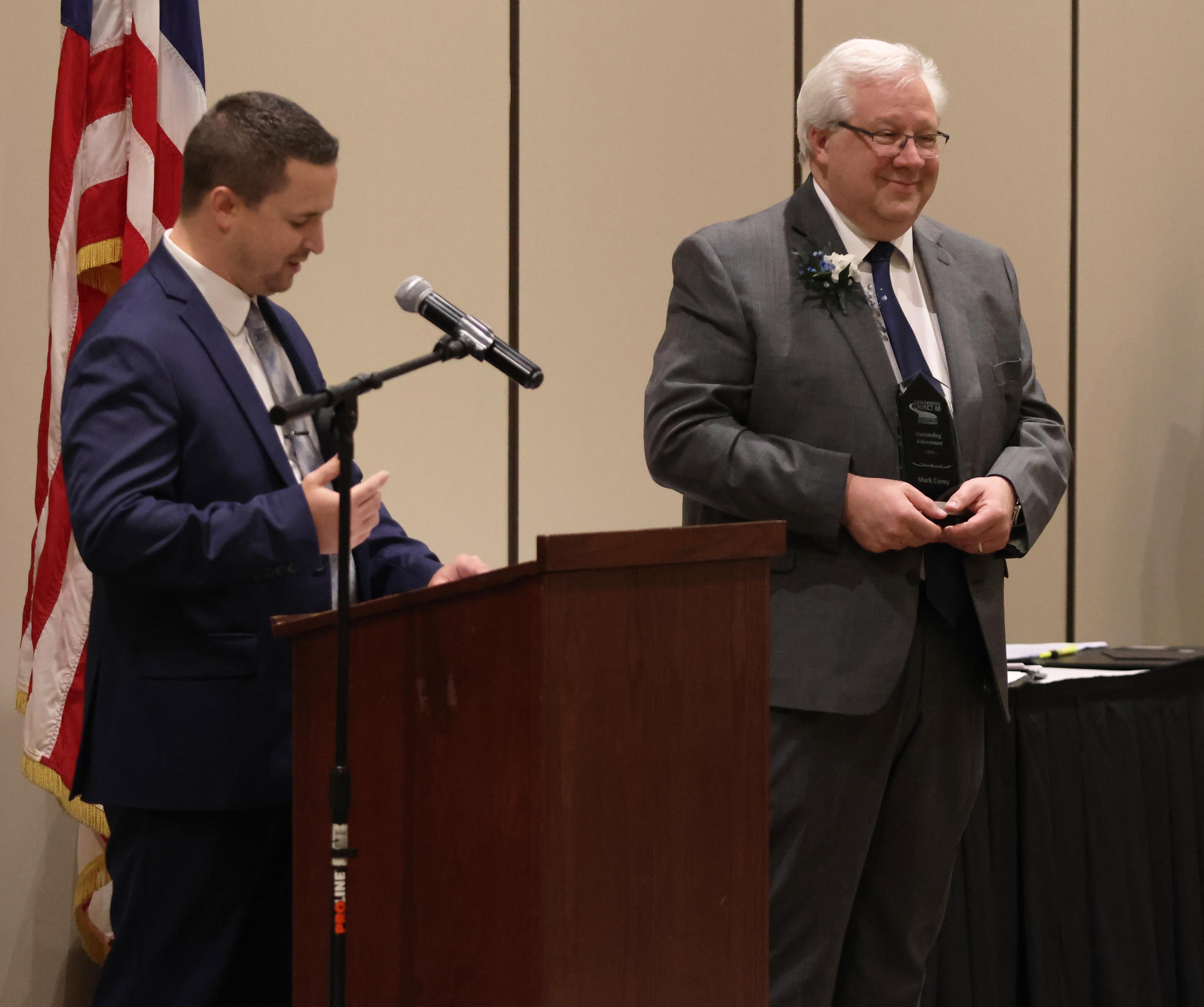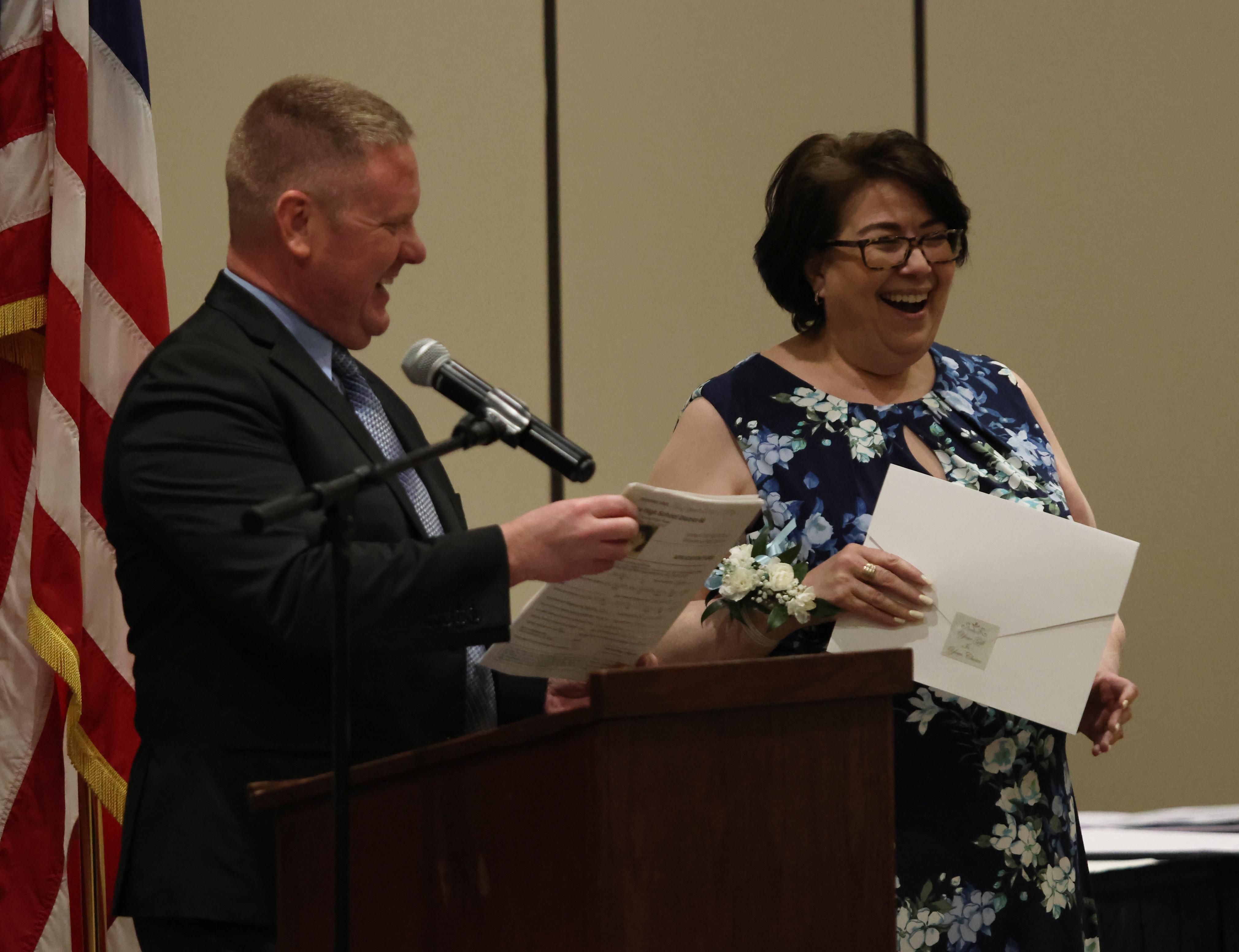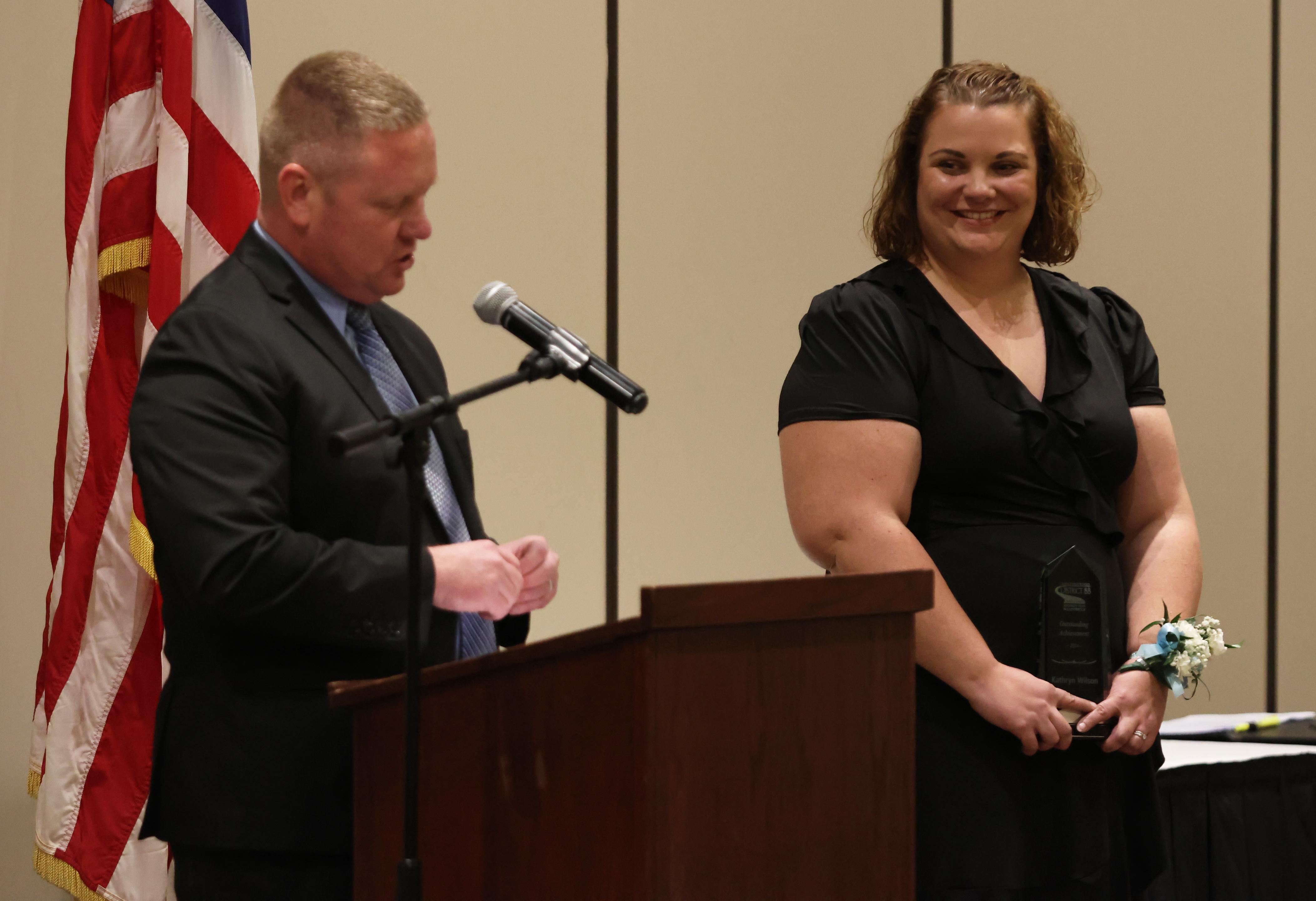 The Outstanding Achievement Awards went to Mark Corey (retiring Music Department Head and Band Director) for Addison Trail and Kathryn Wilson (English teacher and Warrior Resource Center Coordinator) for Willowbrook.