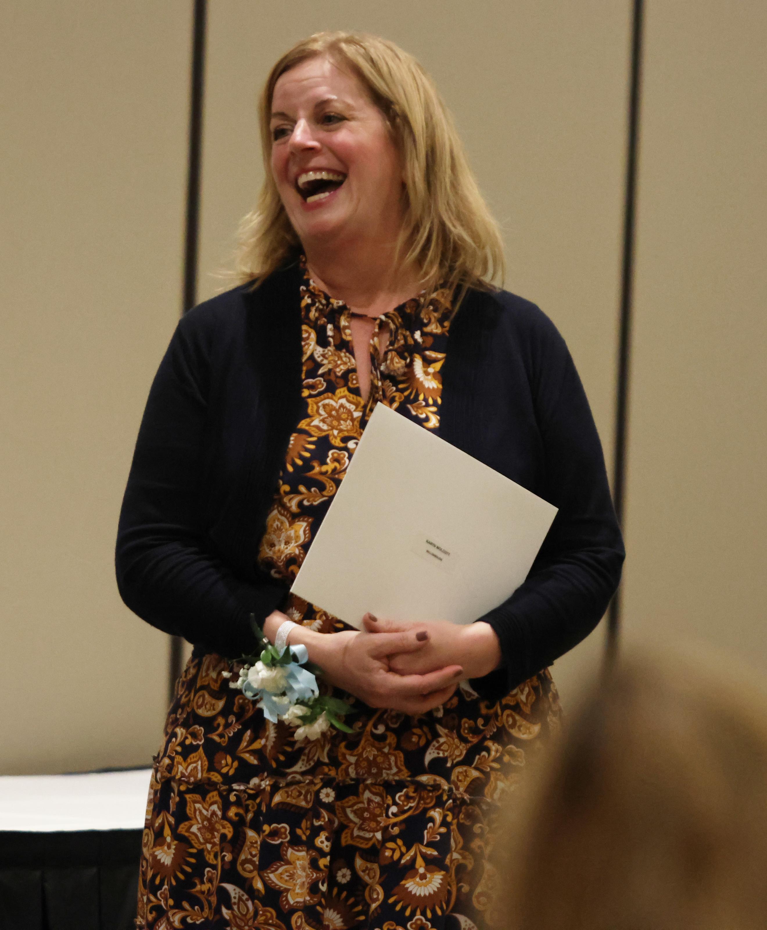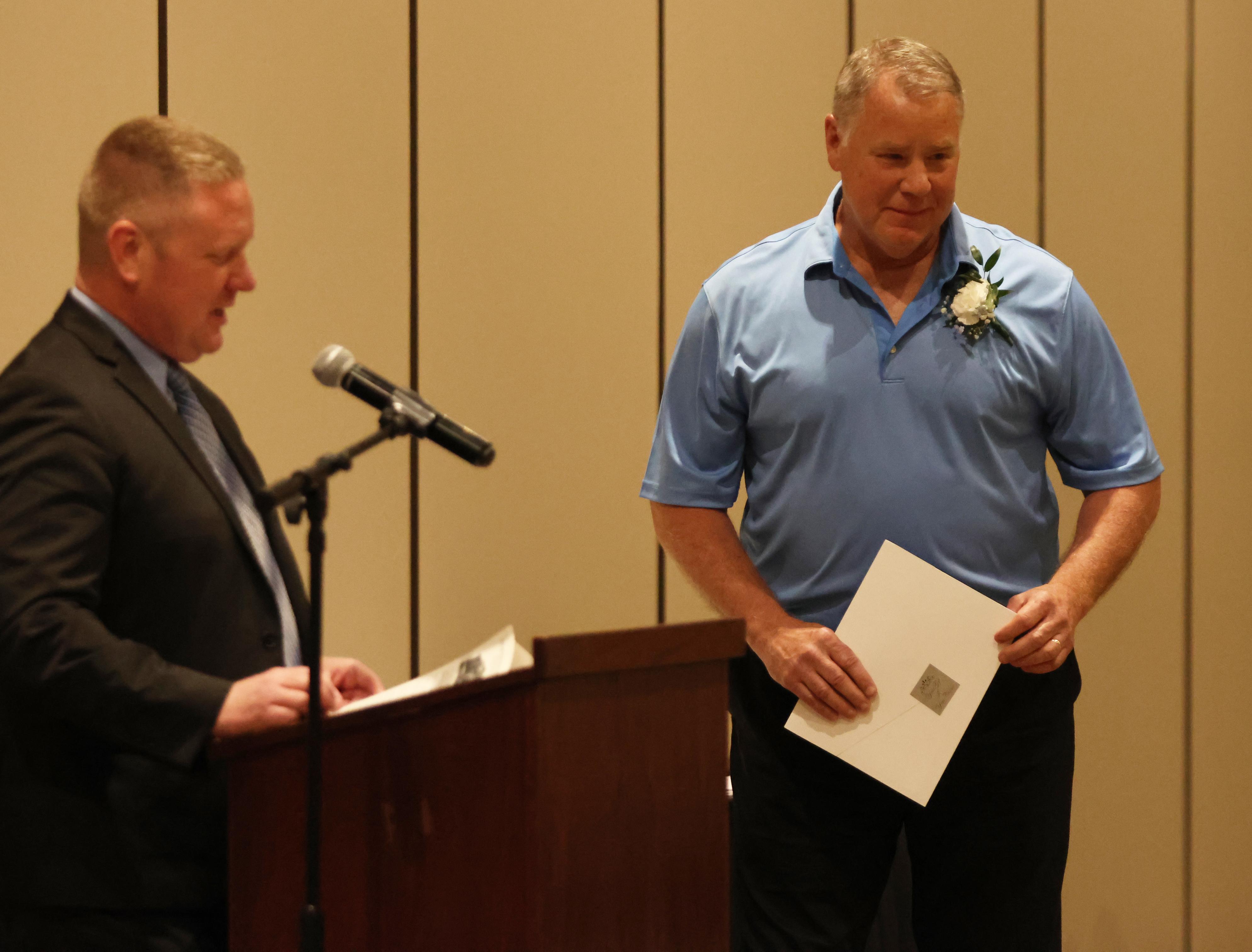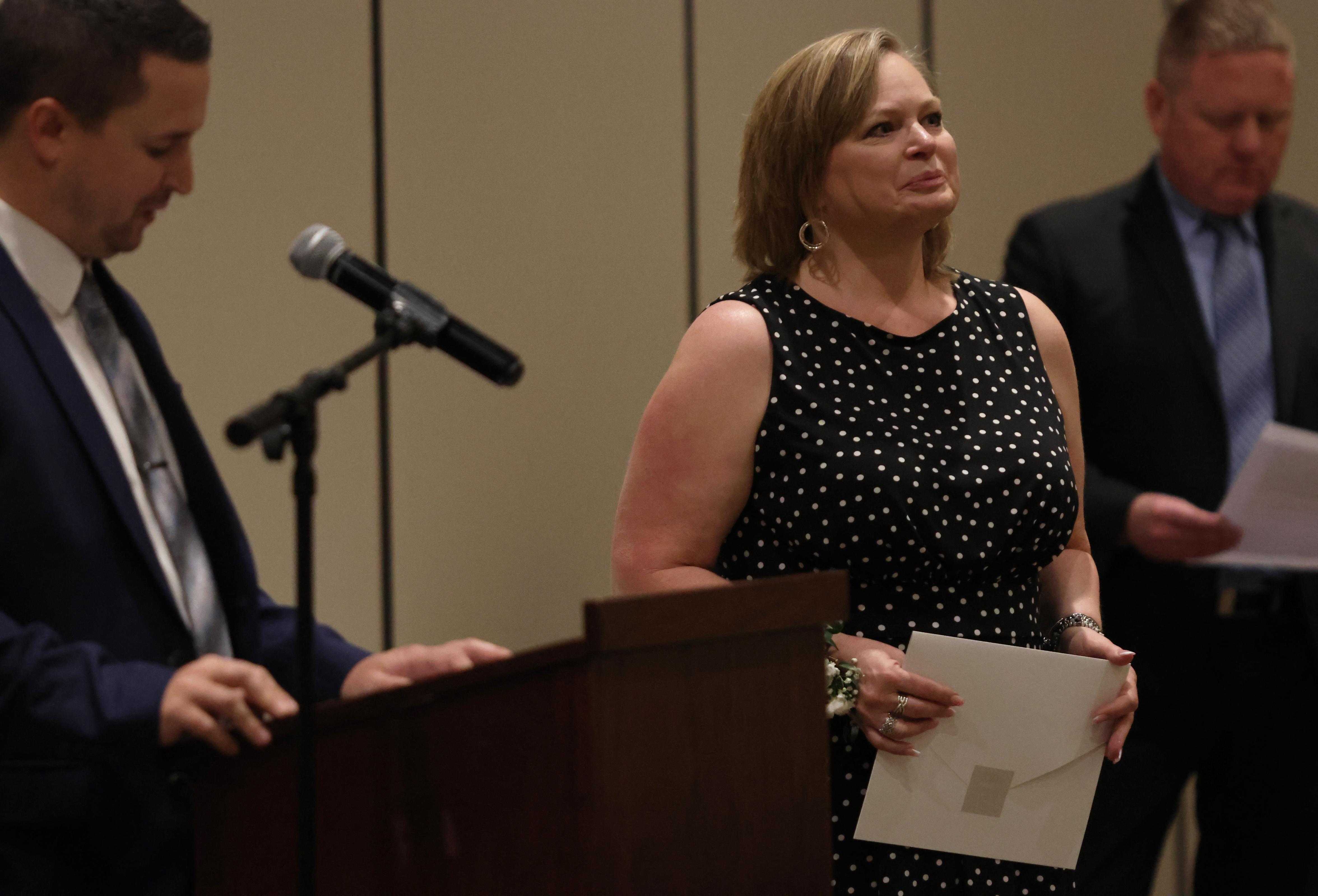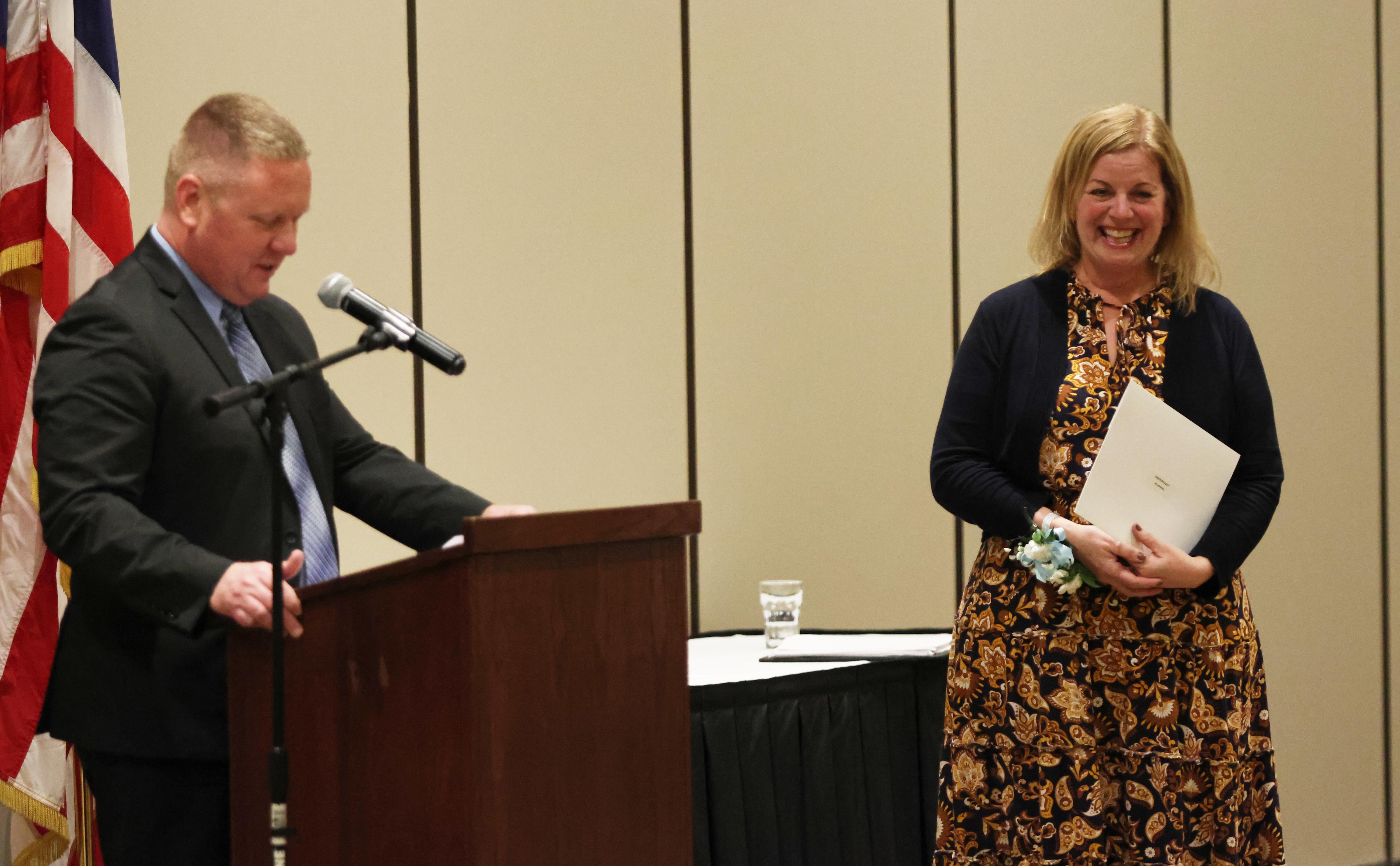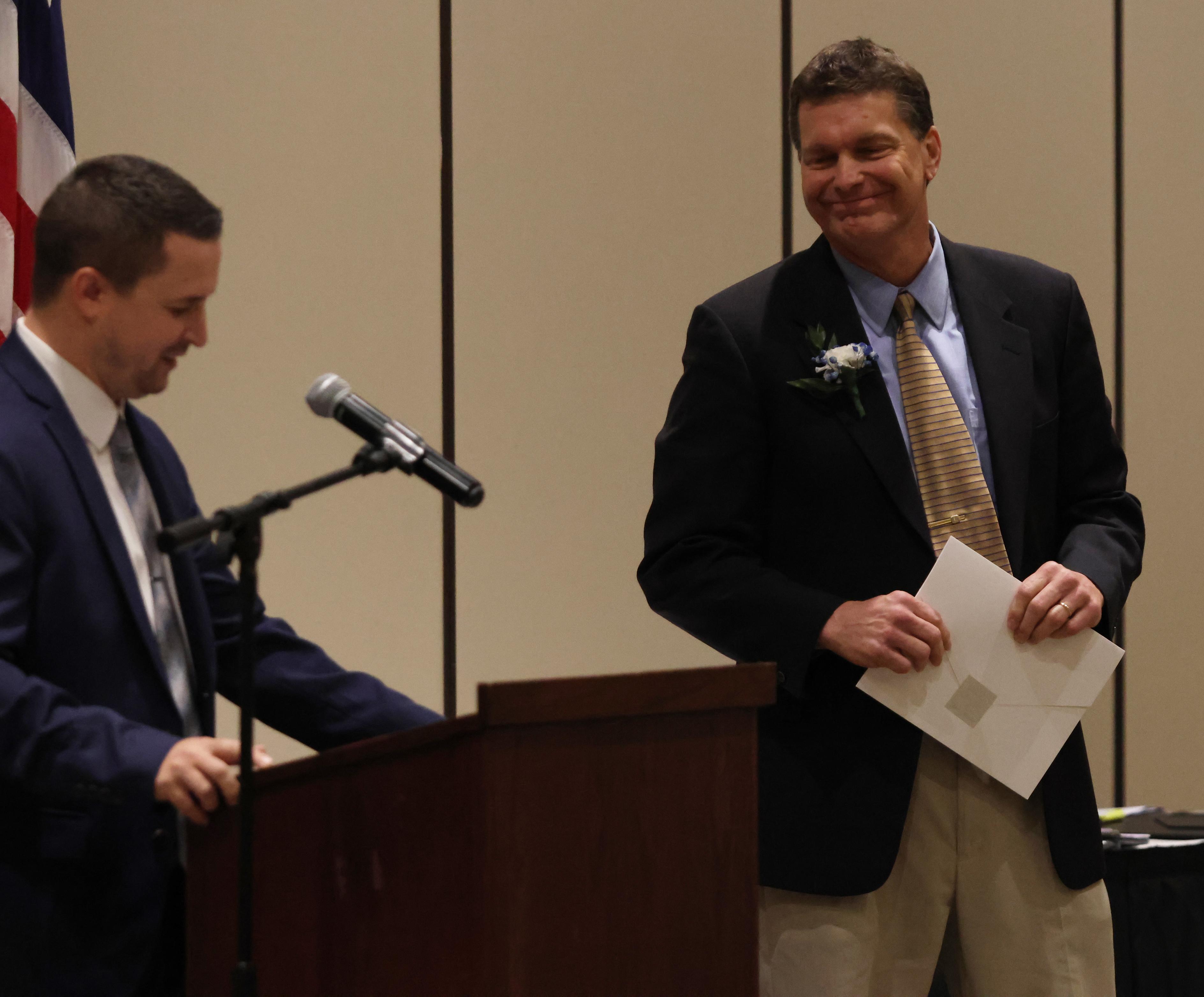 The Outstanding Achievement Awards went to Mark Corey (retiring Music Department Head and Band Director) for Addison Trail and Kathryn Wilson (English teacher and Warrior Resource Center Coordinator) for Willowbrook.