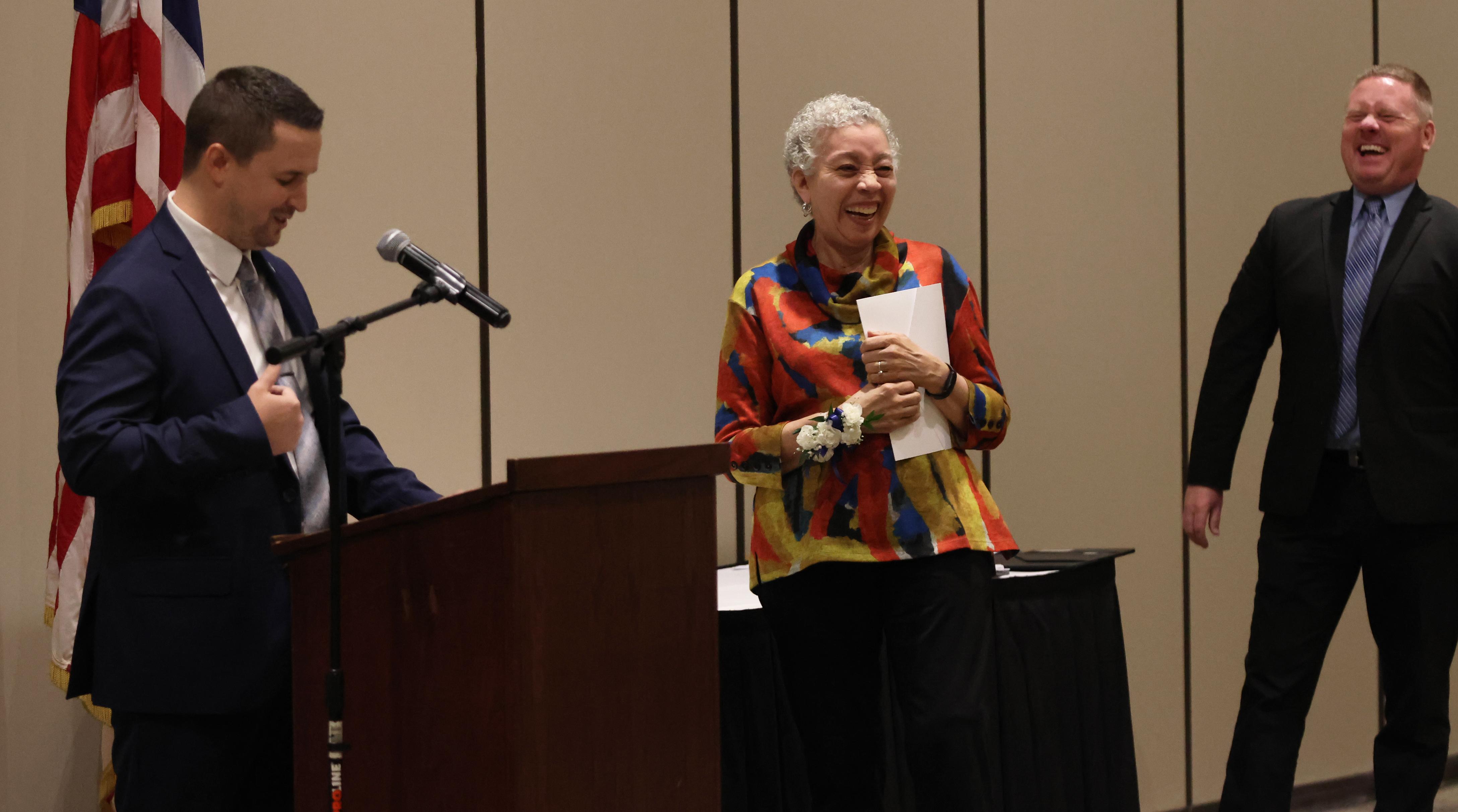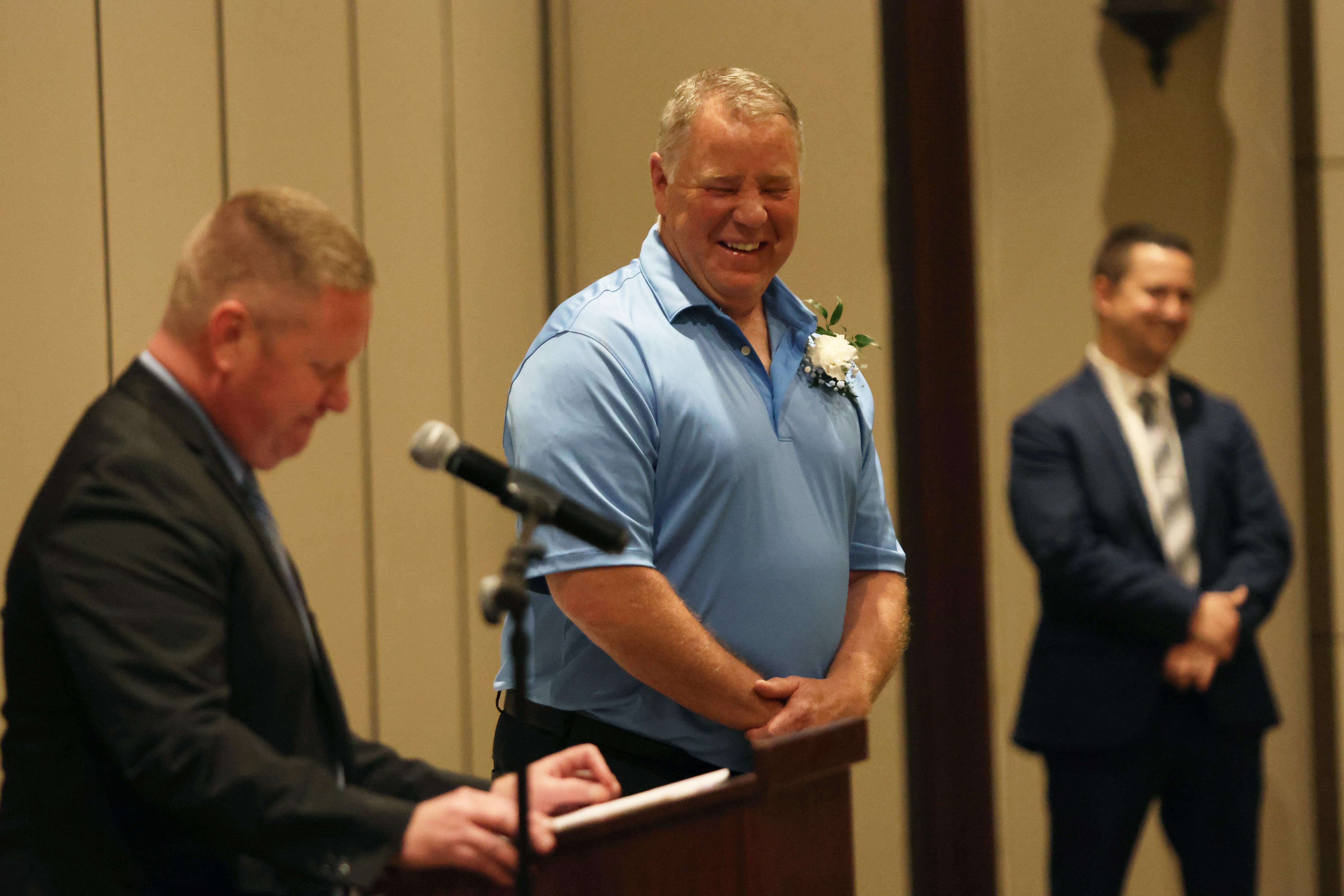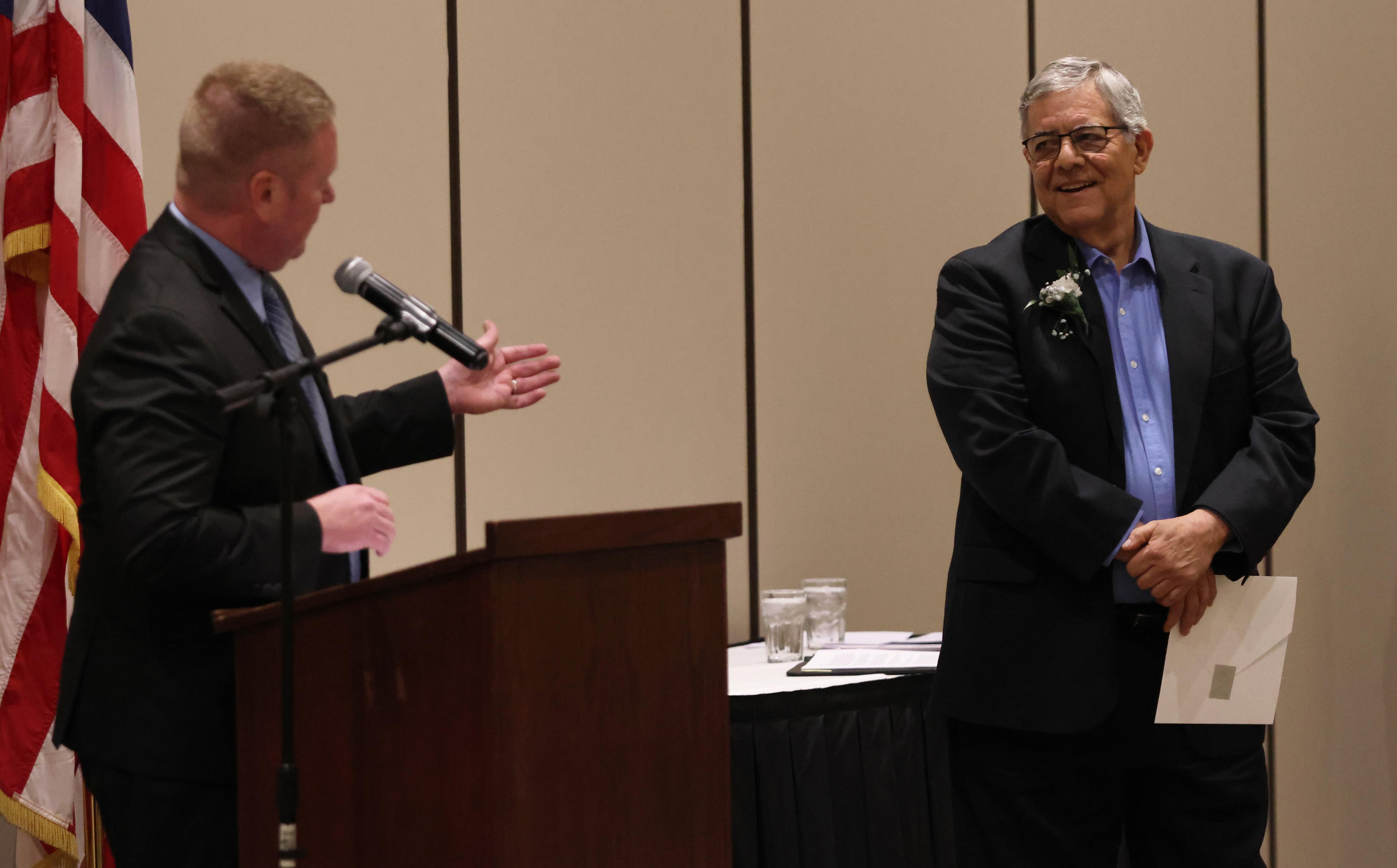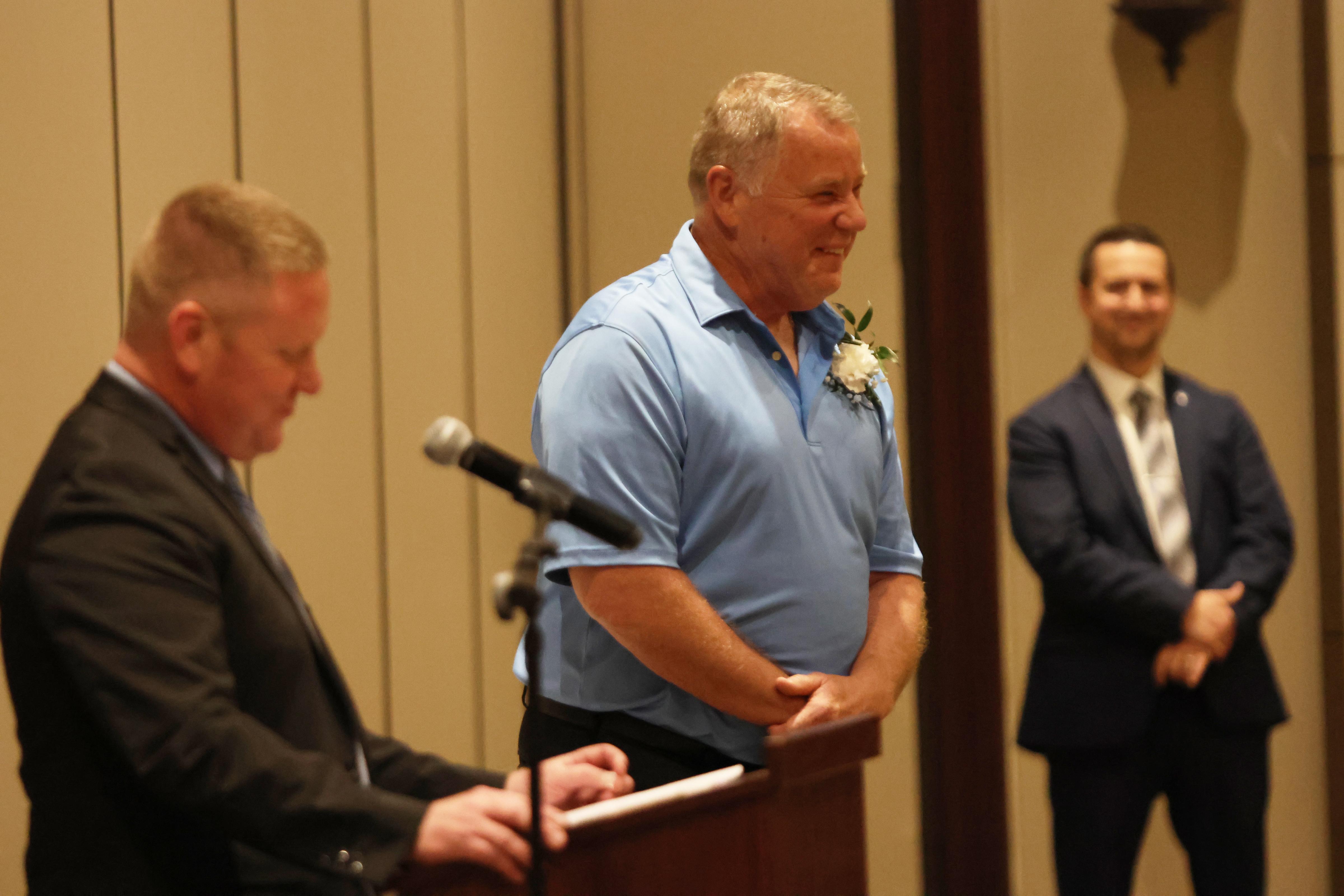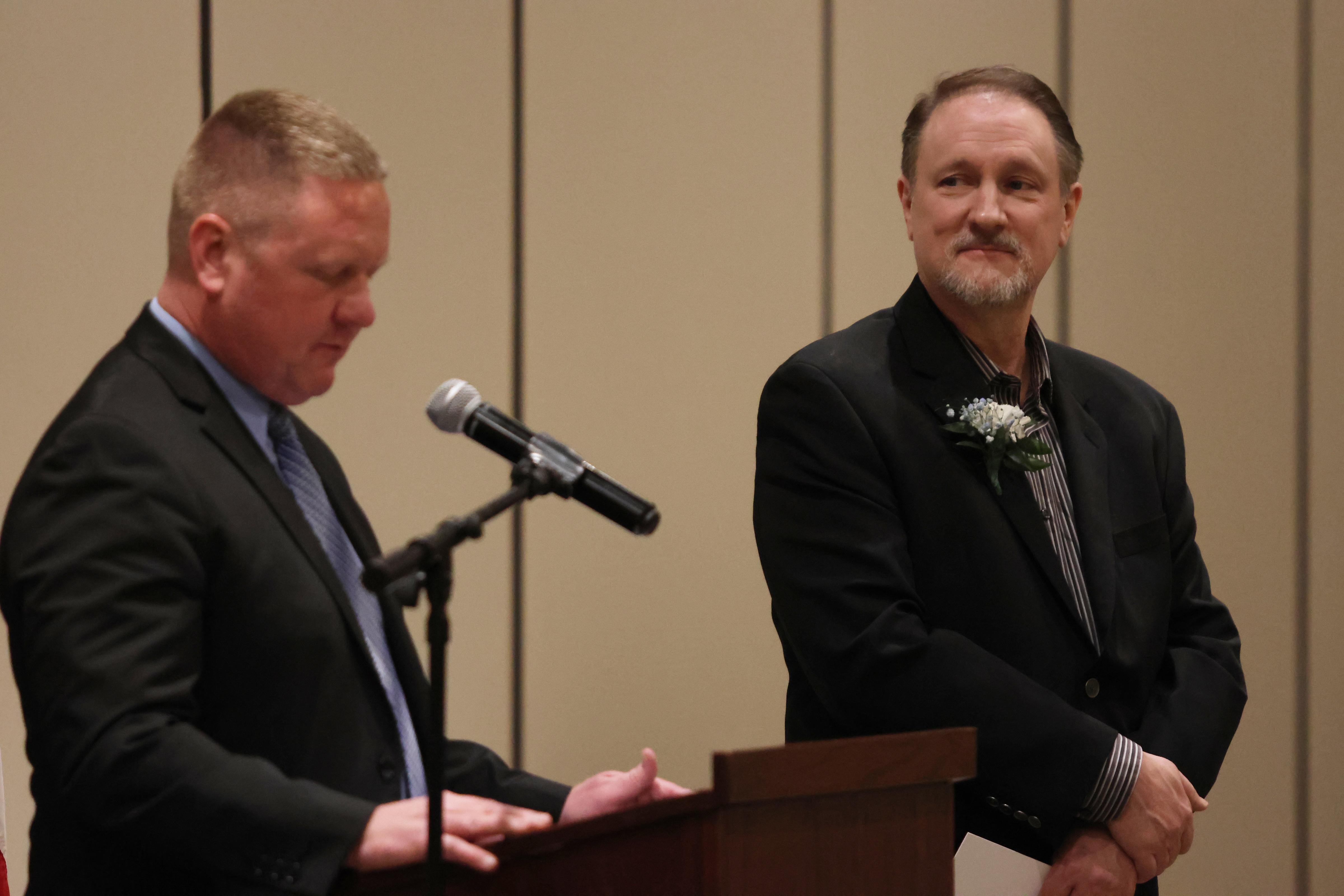 The Outstanding Achievement Awards went to Mark Corey (retiring Music Department Head and Band Director) for Addison Trail and Kathryn Wilson (English teacher and Warrior Resource Center Coordinator) for Willowbrook.