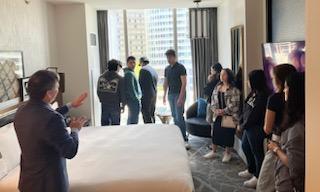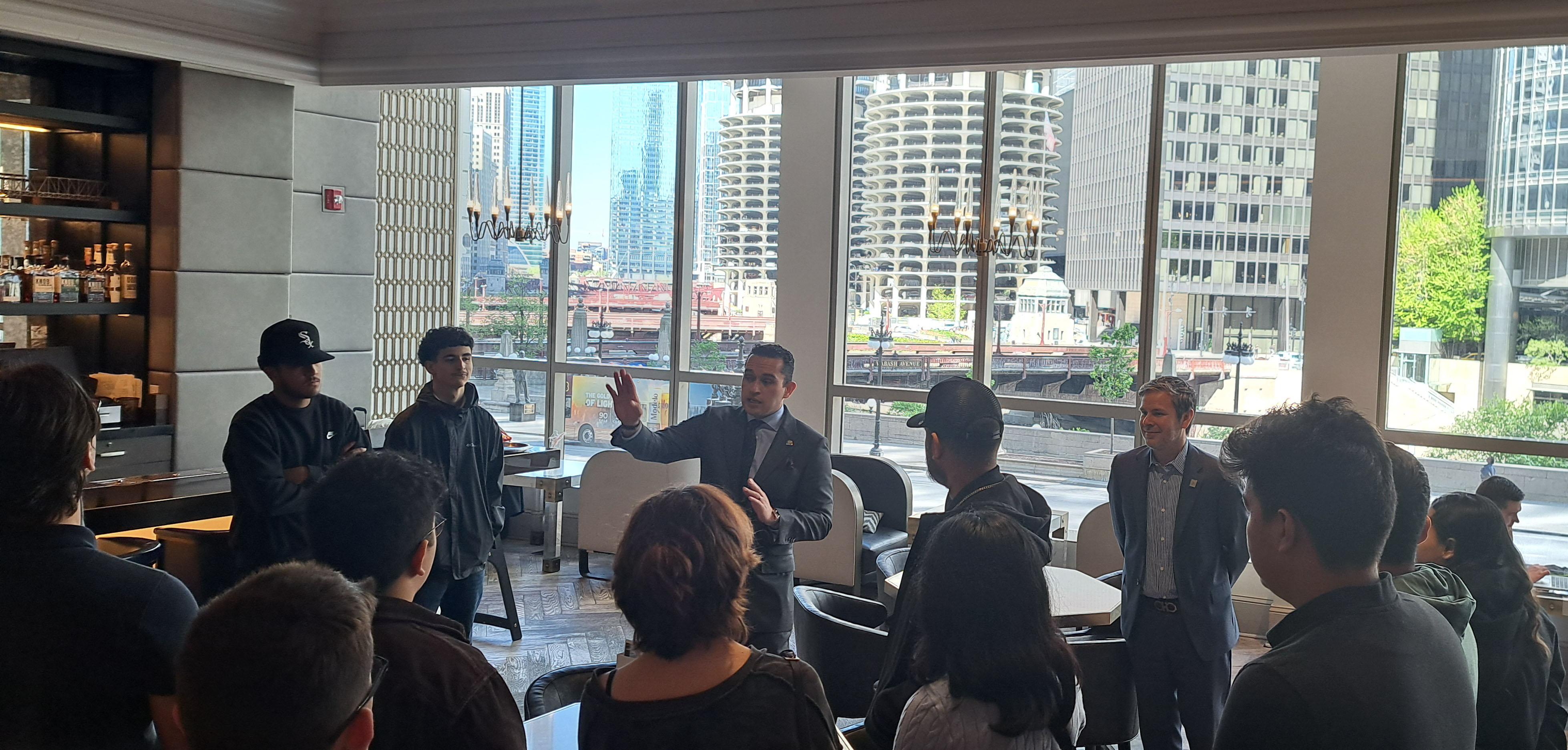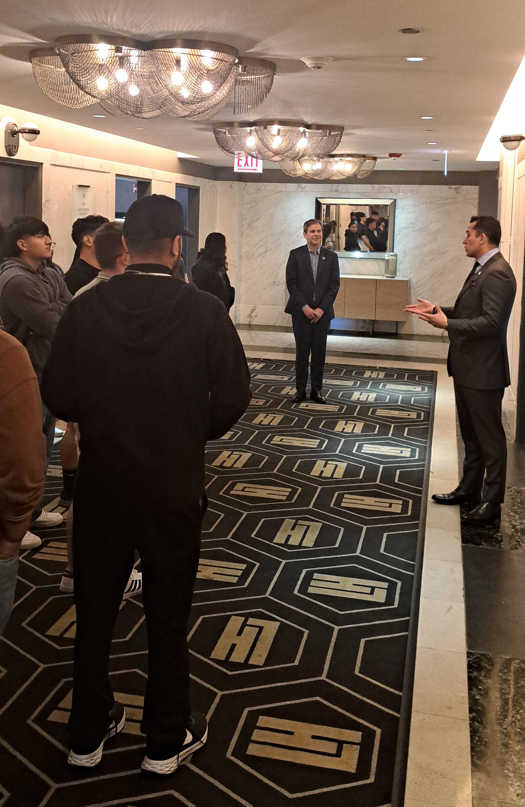 During their visit, students participated in a behind-the-scenes tour of LondonHouse Chicago (a luxury hotel in the city) with General Manager Juan Leyva and Director of Operations Jeovanny Arellano. They also learned about job opportunities in the hospitality industry, including housekeeping, food and beverage, guest relations, valet, finance, human resources, social media, spa services, event planning and more.