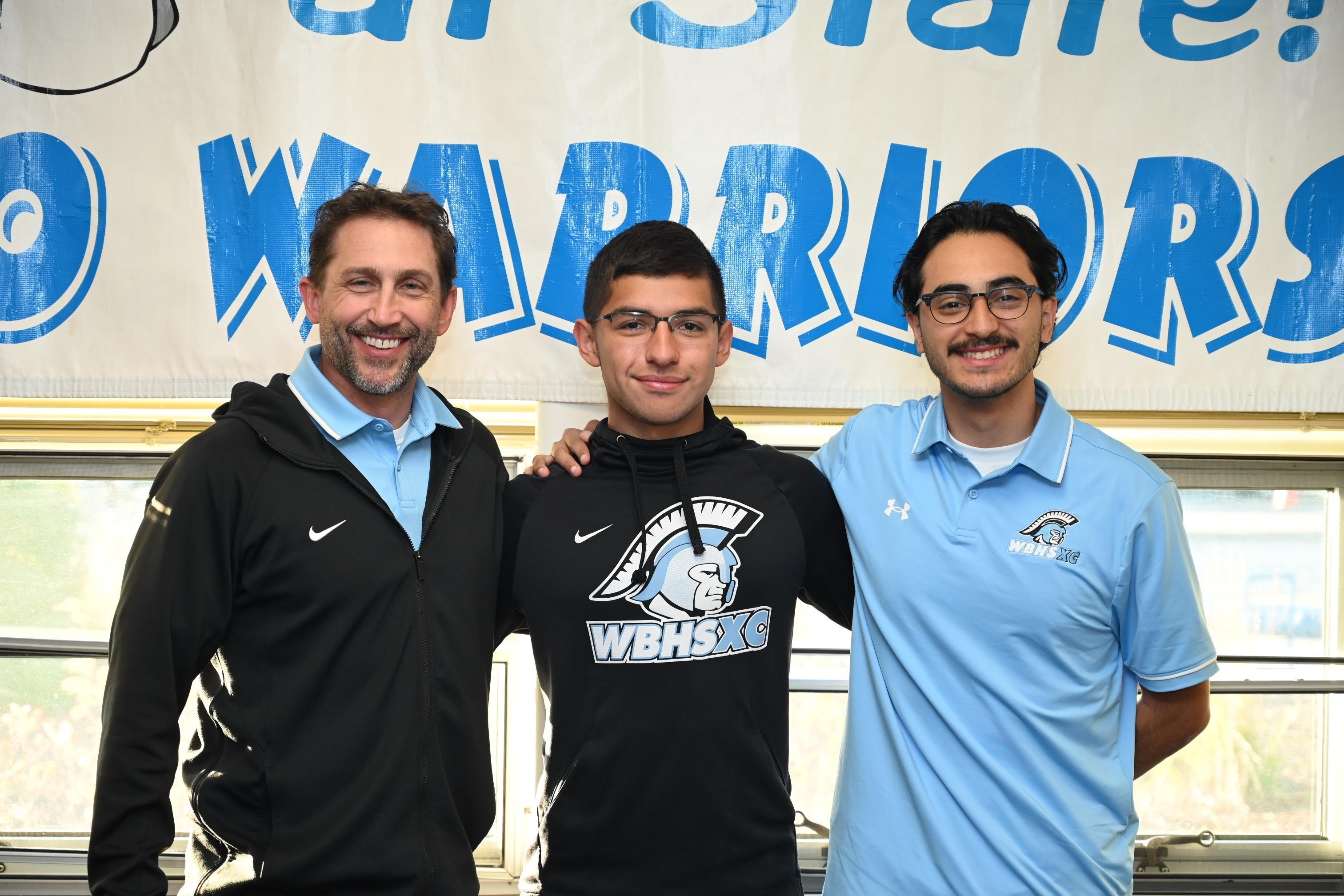 On Nov. 8, Willowbrook hosted a State send-off celebration for senior Adriano Quintero (pictured above, center, with coaches T.J. Artman, left, and Alex Miller, right), who competed in the Illinois High School Association (IHSA) Boys Cross-Country State Meet.