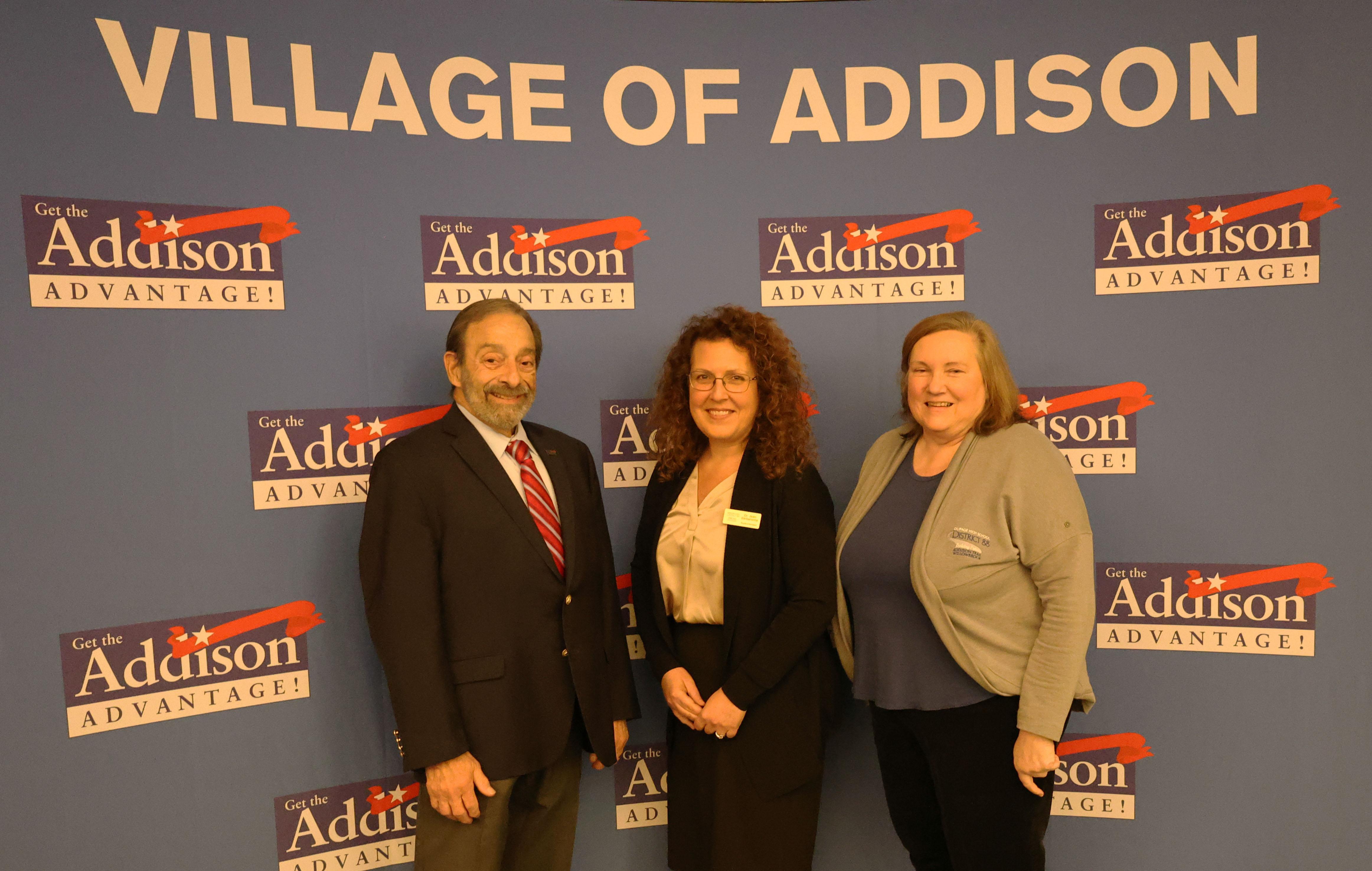 (From left) Village of Addison Mayor Rich Veenstra, District 88 Superintendent Dr. Jean Barbanente and District 88 Board of Education President Donna Craft Cain participate in the 18th Annual Shape of Addison Town Hall Meeting on Jan. 29.