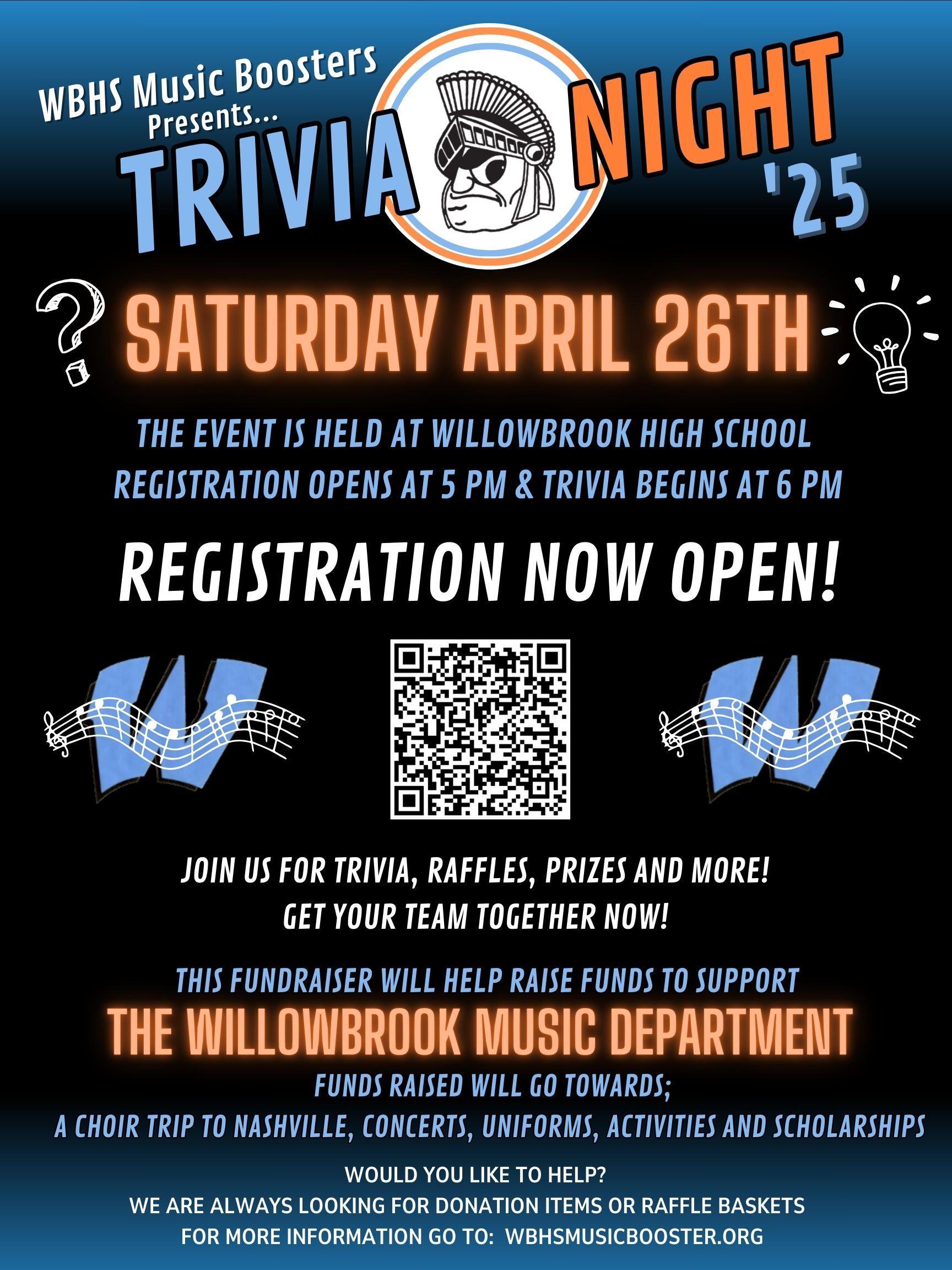 Be sure to sign up by April 21 for the Willowbrook Music Booster Club’s Trivia Night!