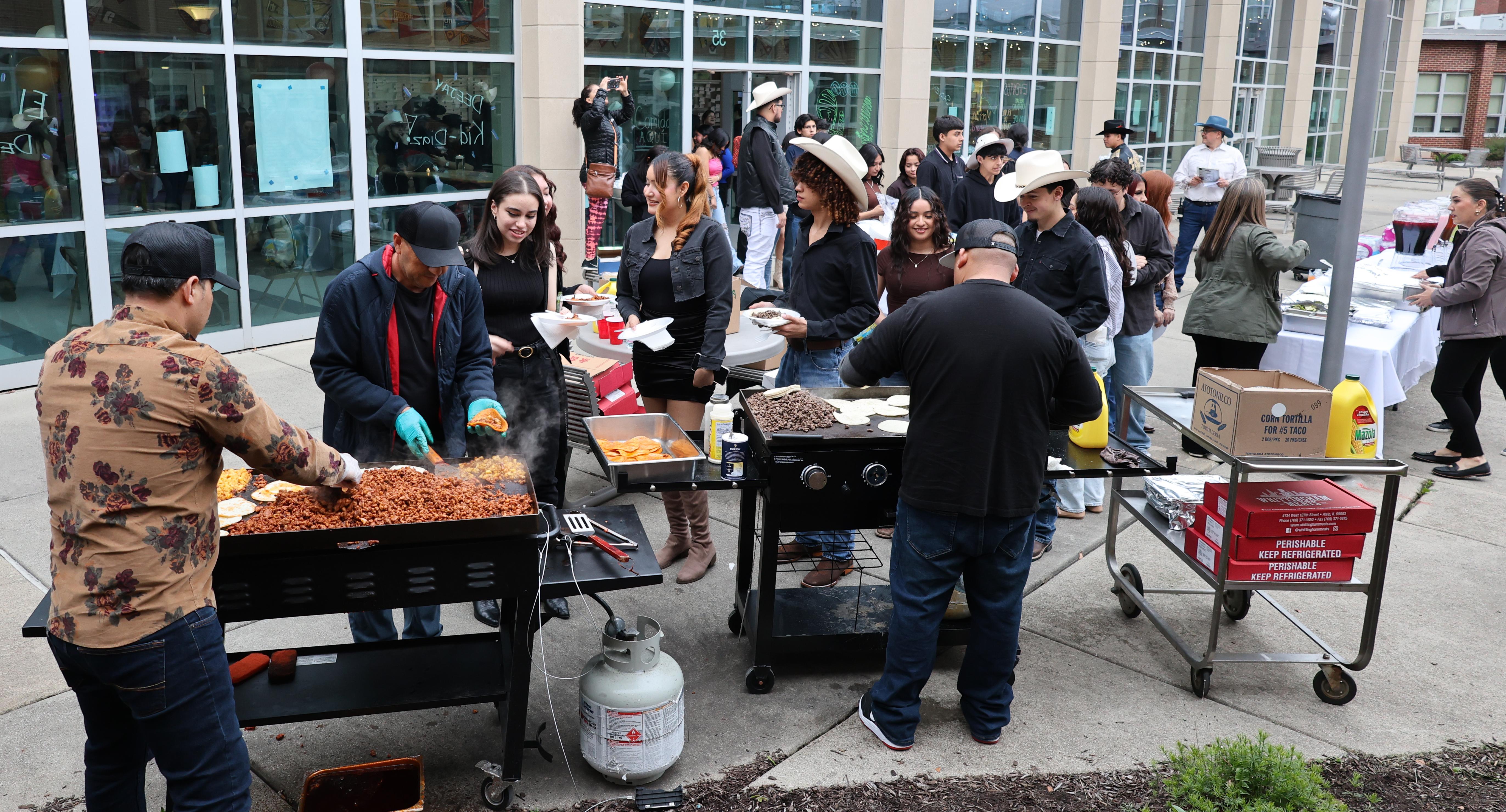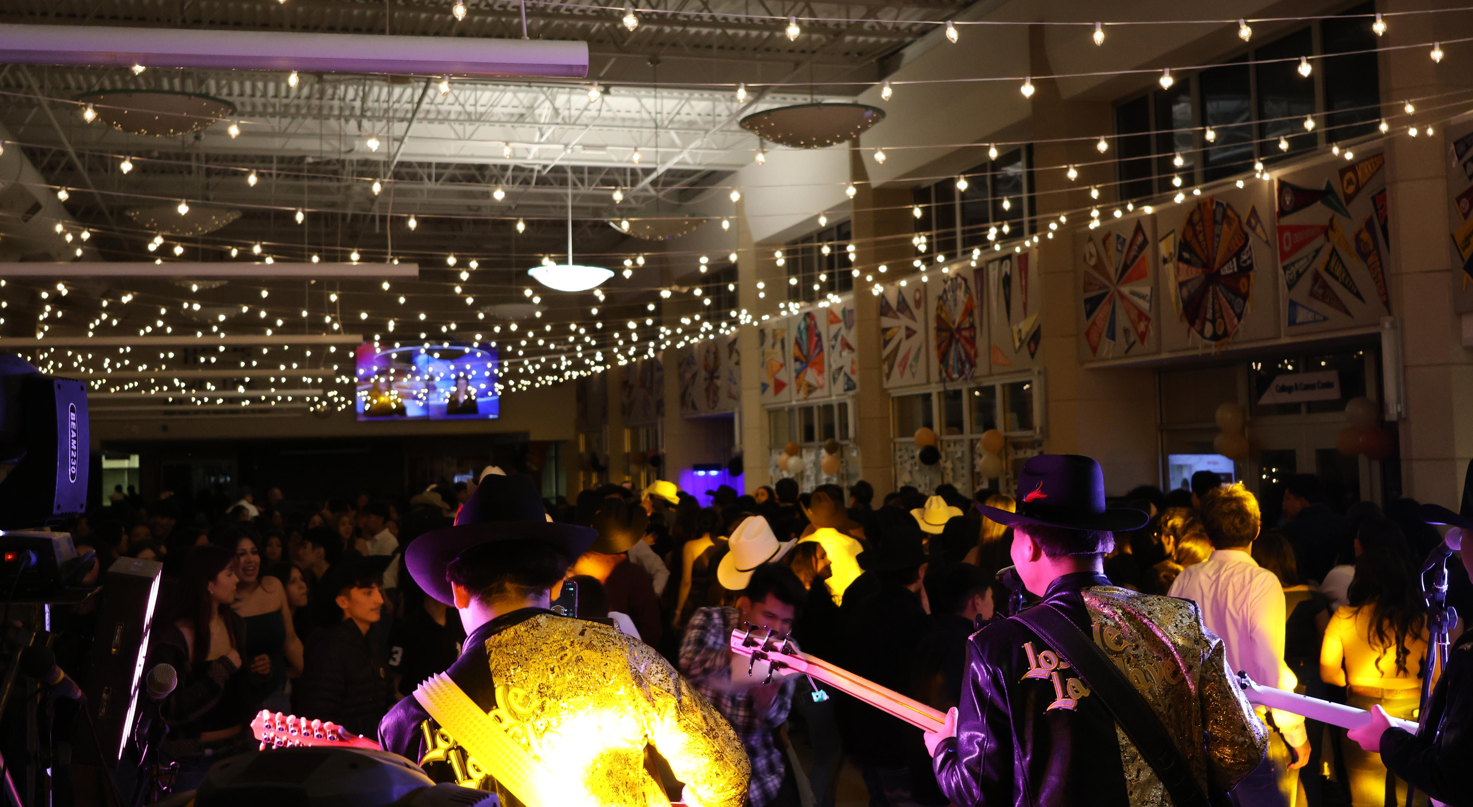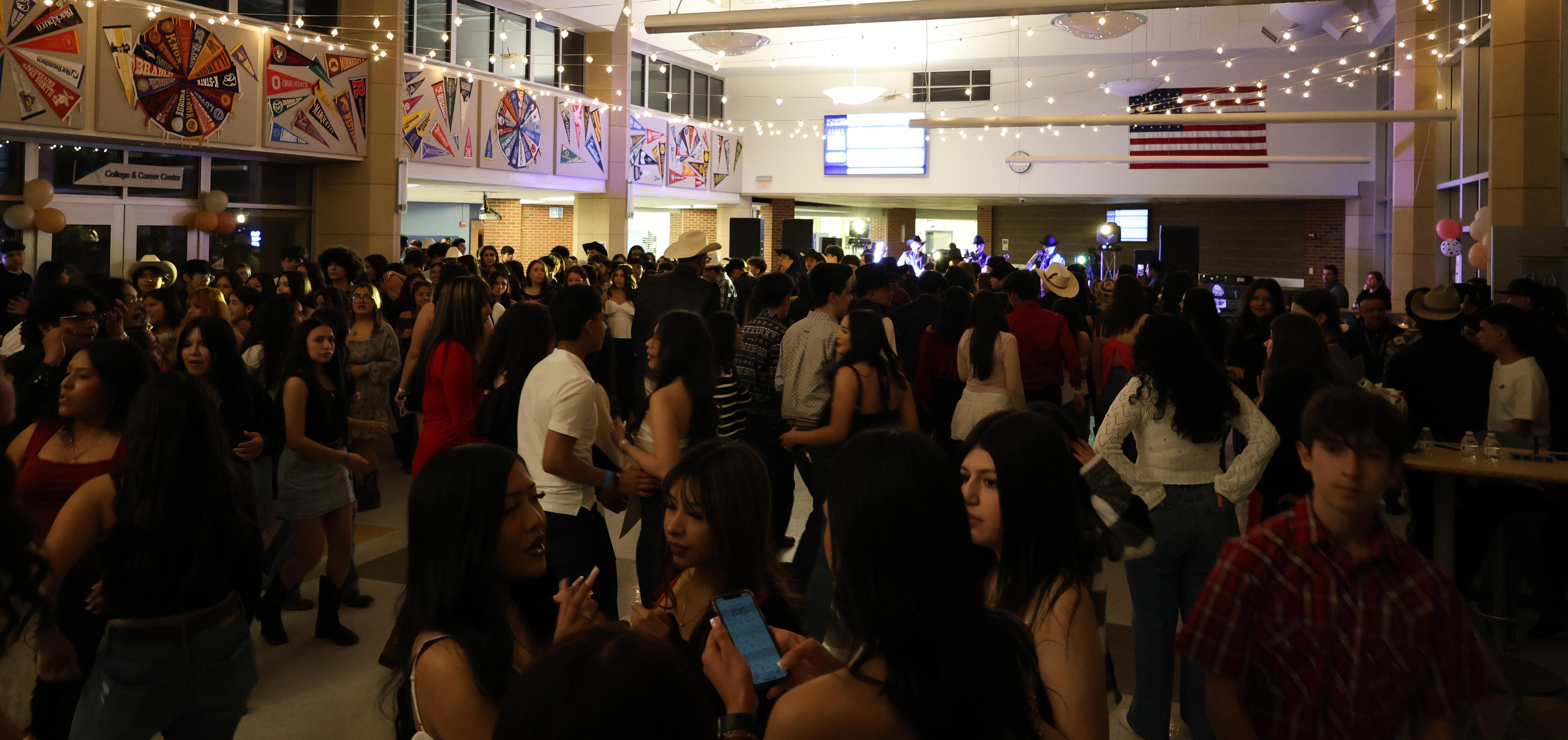 During the Baile, about 500 students from Addison Trail, Glenbard, Fenton, Morton East and Willowbrook enjoyed a mix of music from various genres in Spanish, provided by three live bands and a DJ. The event also featured tacos, aguas frescas and a Western theme. Staff members from Addison Trail and Willowbrook, as well as parents who are part of Addison Trail's Padres Latinos en Acción (Latino Parents in Action) group, volunteered to help.