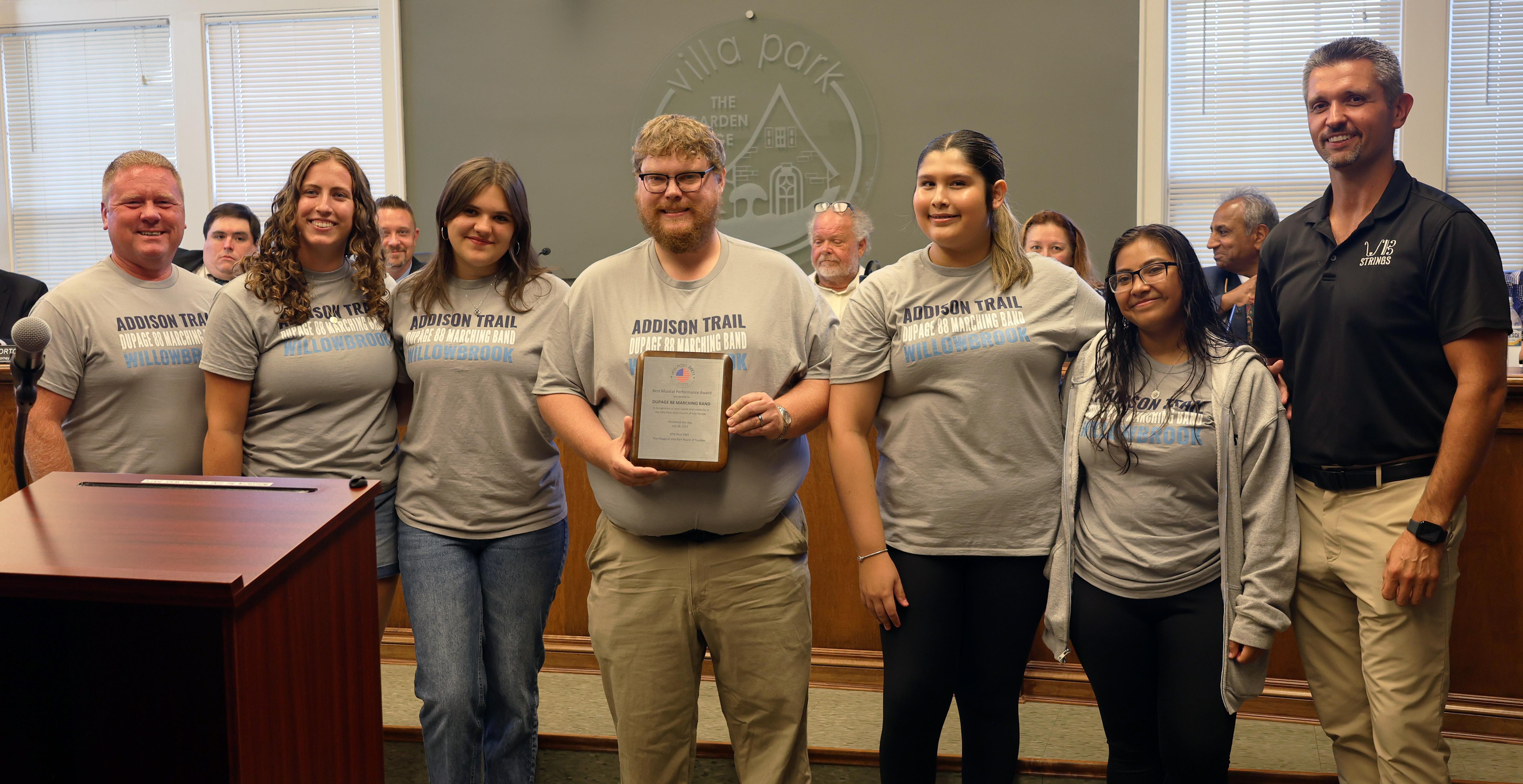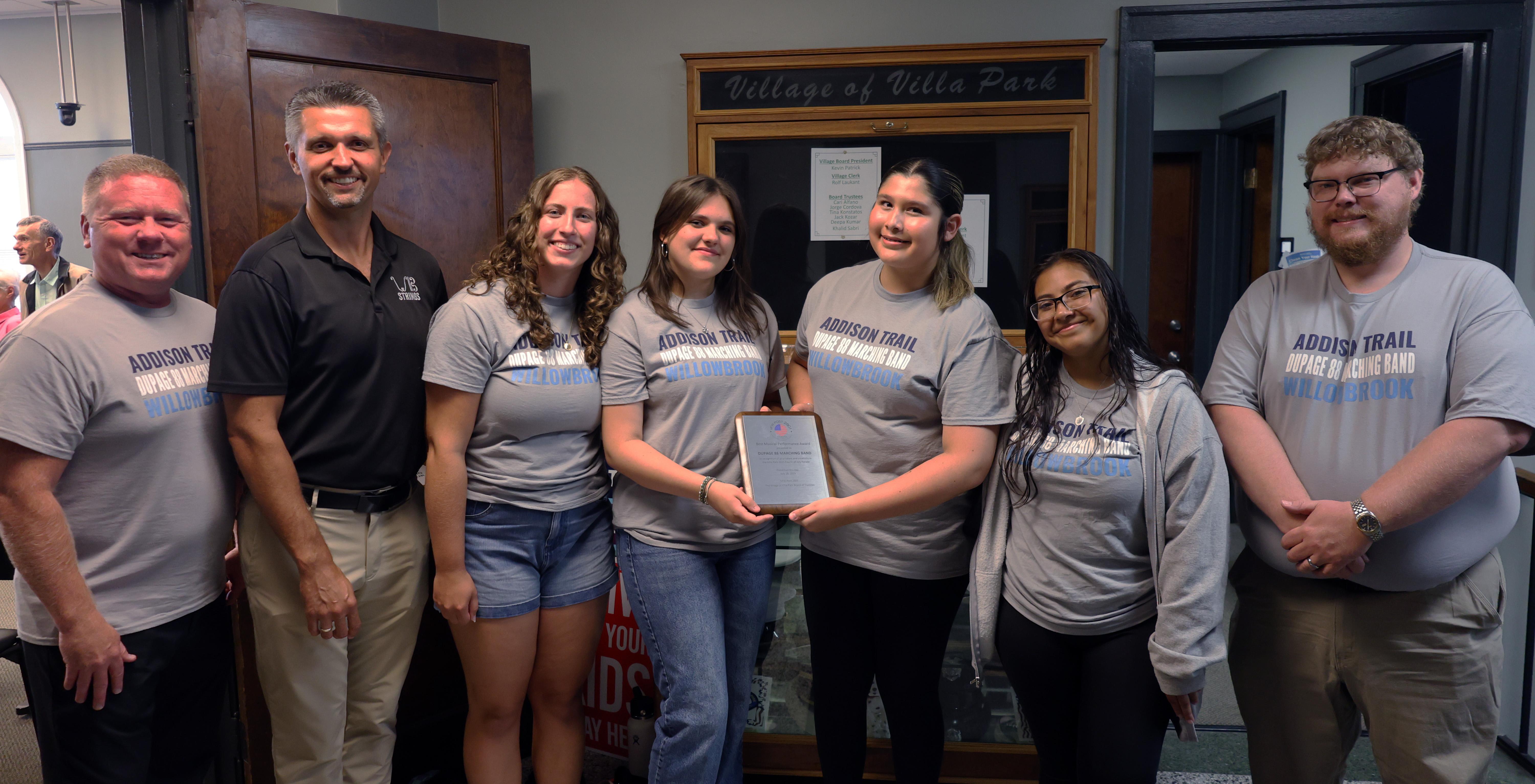 The band is composed of Addison Trail and Willowbrook student-musicians, and the schools joined together for the first time this summer. The group members were honored during the July 28 Village Board of Trustees Meeting for their talent and creativity in the Independence Day Parade, which was hosted by the Villa Park VFW Post 2801 on July 4.