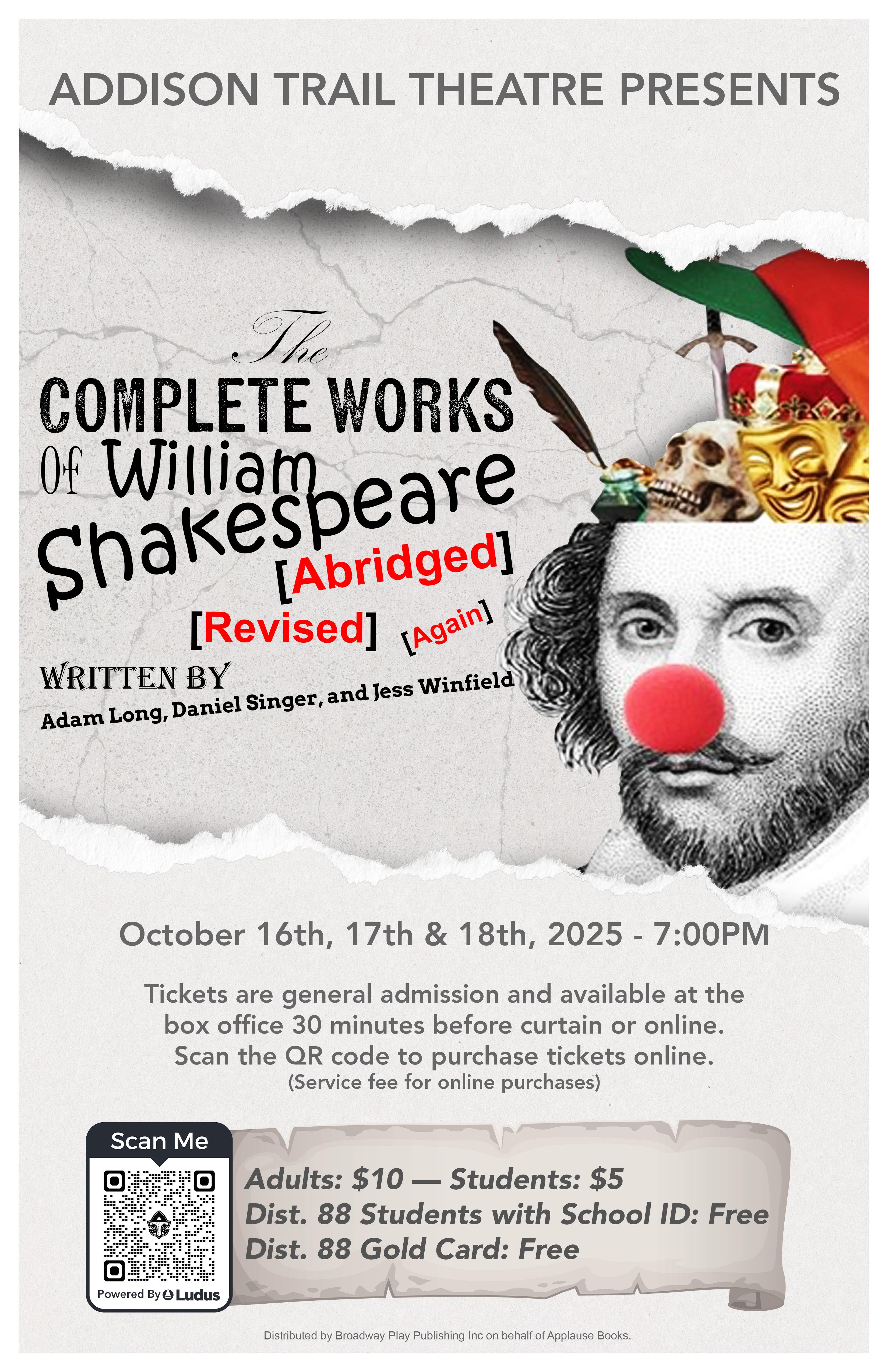 Addison Trail Theatre invites all students, parents/guardians, alumni, staff, community members and friends to enjoy an evening of entertainment and fun, as the school presents its fall play, “The Complete Works of William Shakespeare (abridged) [revised] [again],” on Oct. 16, 17 and 18.