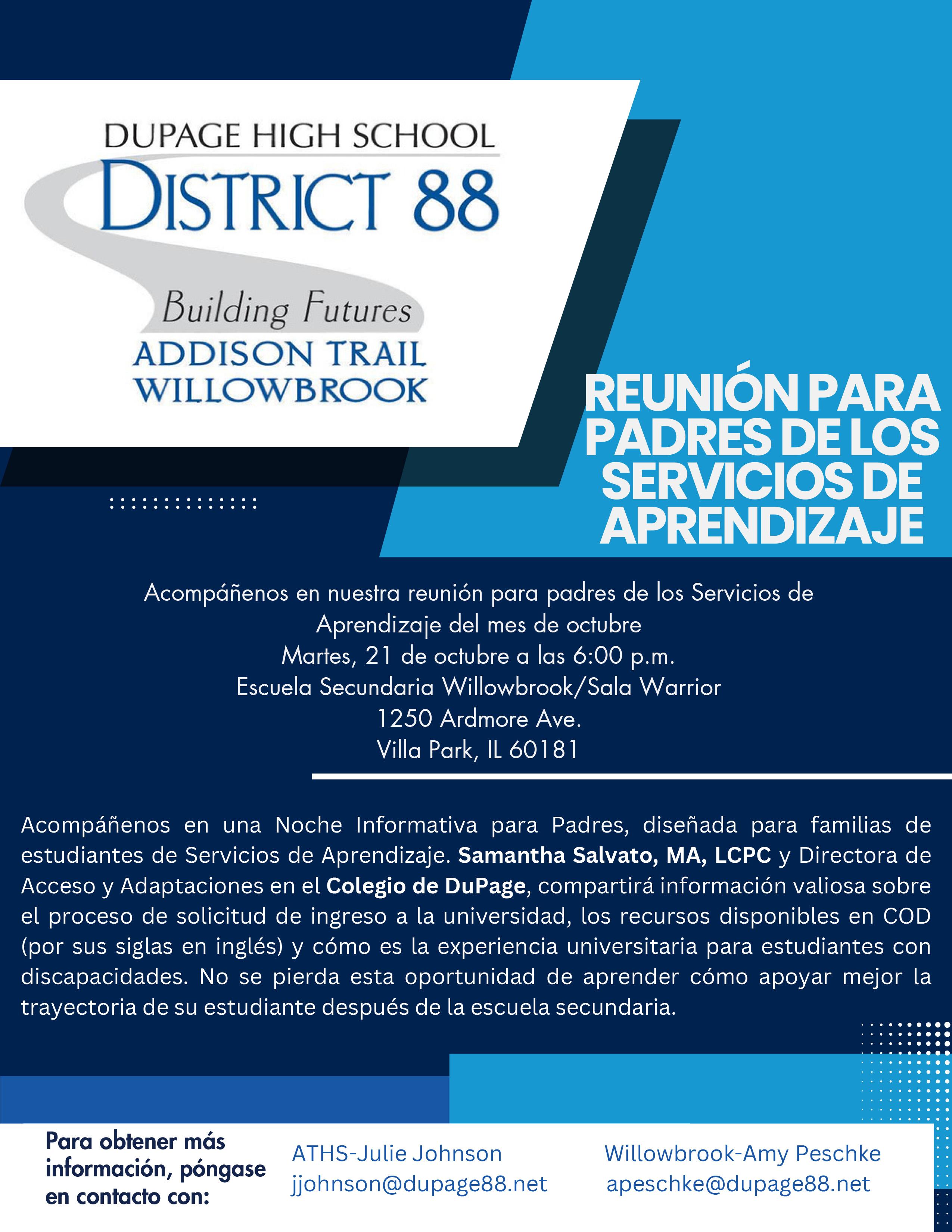 On Oct. 21, District 88 will host a Learning Services meeting for parents/guardians of Addison Trail and Willowbrook students who have an Individualized Education Program (IEP) and/or a 504 Plan.