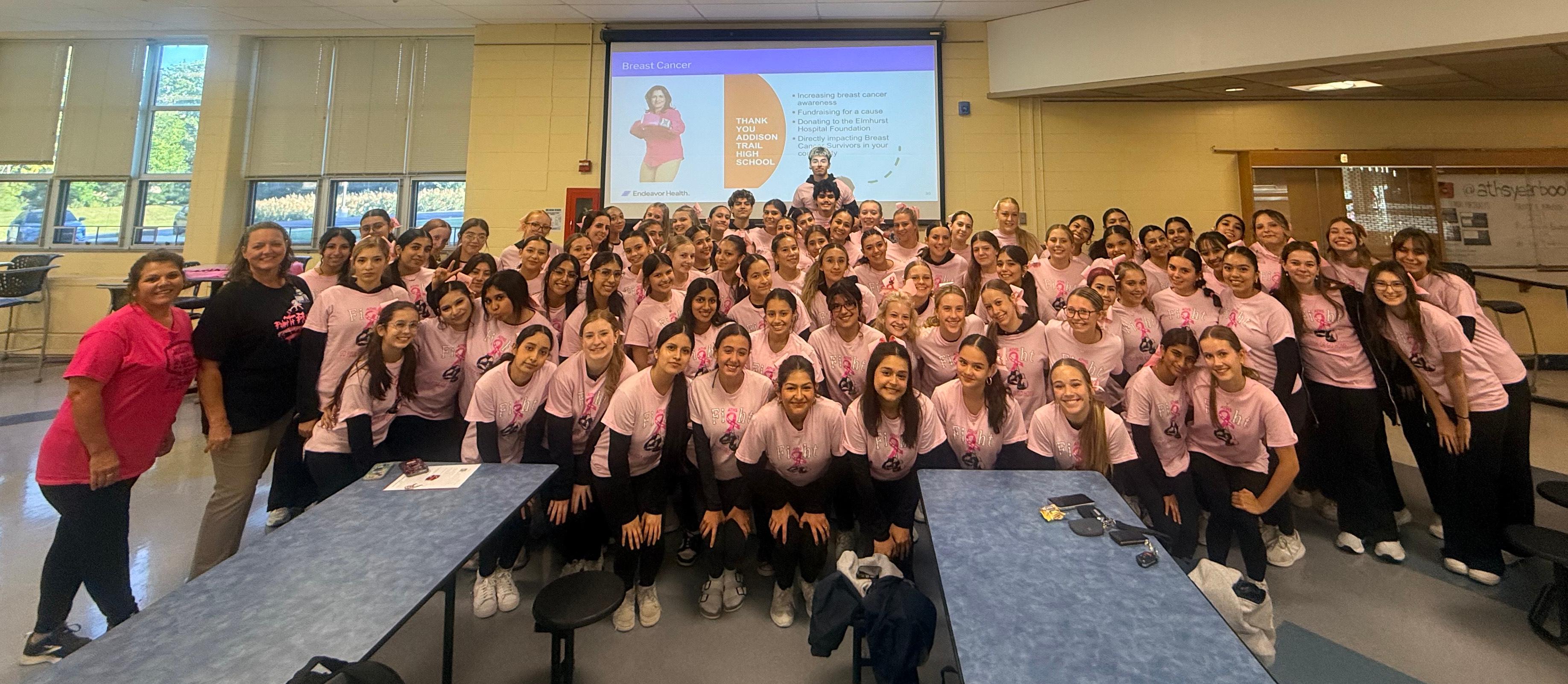 Many Addison Trail athletic teams and clubs – including Flags and Baton, Blazettes, Cheerleaders, Orchesis, Girls Volleyball, Energy Rush and Student Council – hosted events and fundraisers to raise money for Endeavor Health Elmhurst Hospital’s Prospective Surveillance for Rehabilitation program, as well as the Go Pink Breast Cancer Awareness Scholarship in memory of Addison Trail special education teacher Elizabeth Clifford.