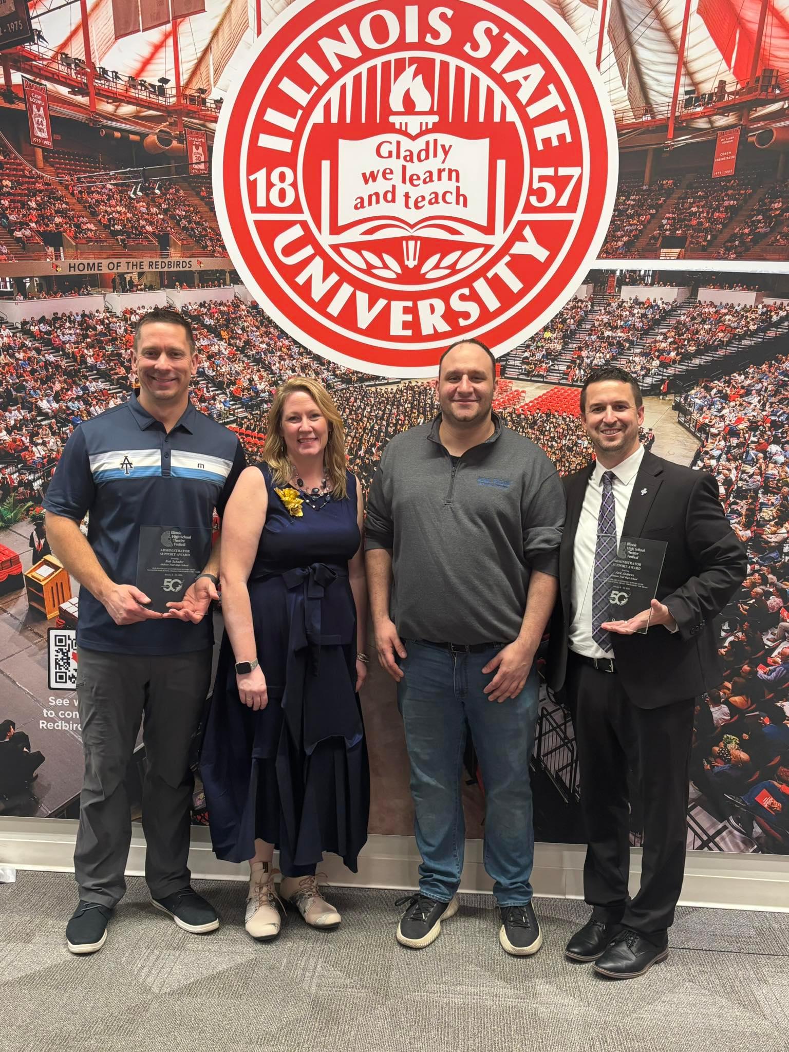 During the IHSTF, Addison Trail Principal Jack Andrews and Addison Trail staff member Rob Schader were presented with the Administrator Support Award, which honors an administrator who has demonstrated the utmost support for a school/district's drama program. Andrews and Schader were recognized for their commitment and passion to assisting the All-State Production, including coordinating/hosting multiple rehearsals at Addison Trail. They are pictured in the last photo above (from left: Schader, McSweeney, Holod and Andrews).