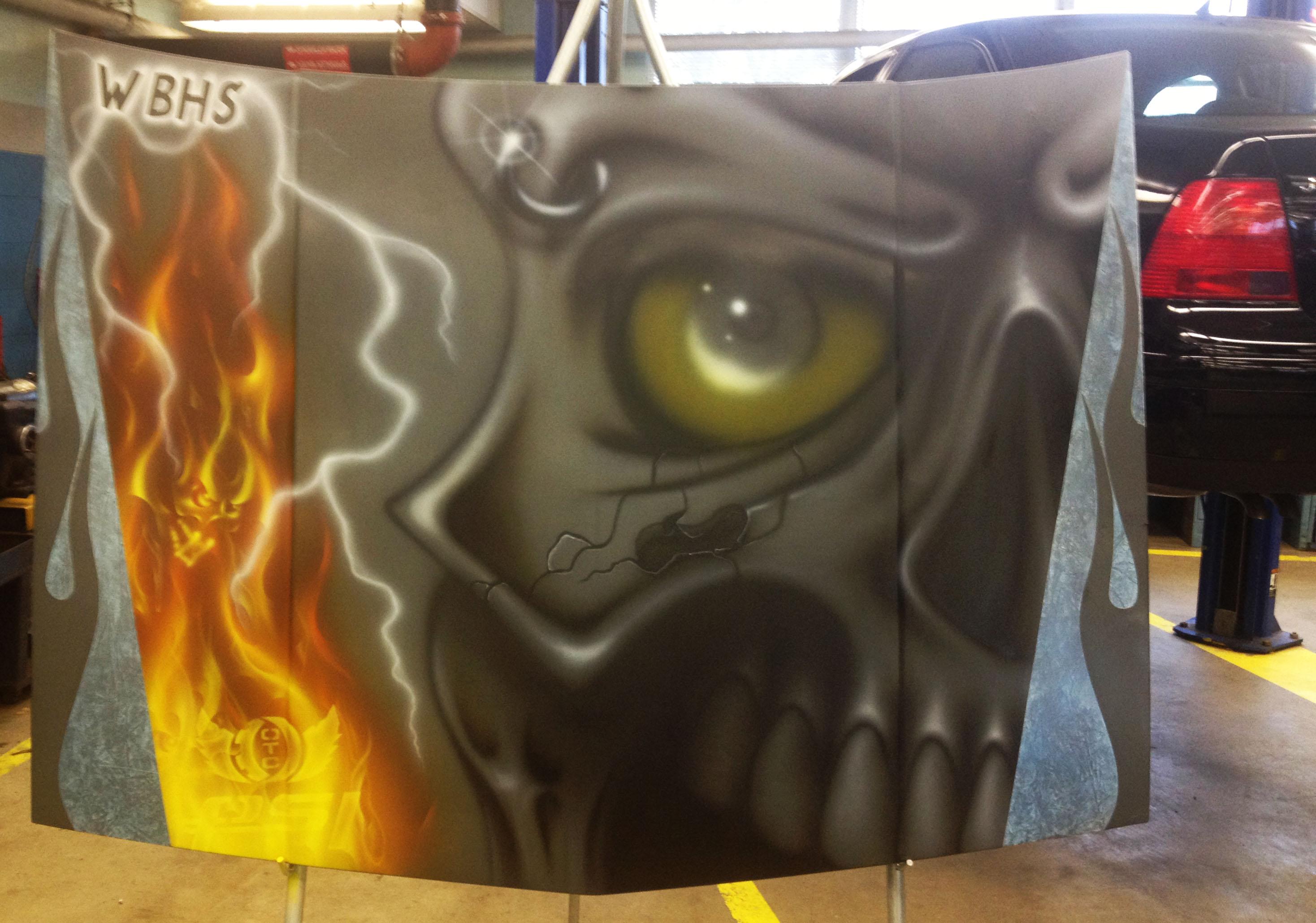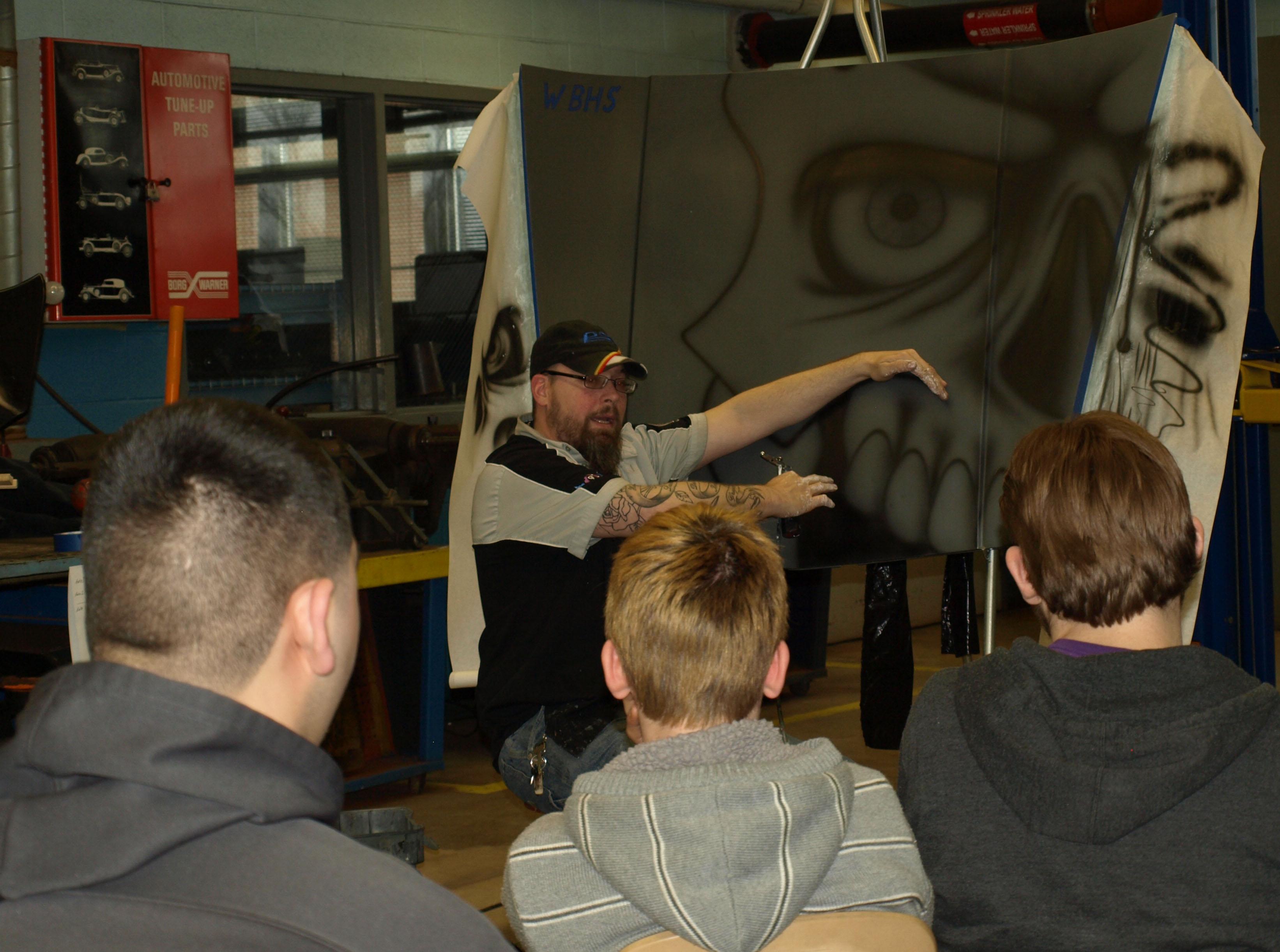 Banks spoke with students about the benefits of pursuing a career in automotive custom paint work and gave a demonstration of how to airbrush the hood of a car. As he painted, he shared tips and techniques to help the students improve.