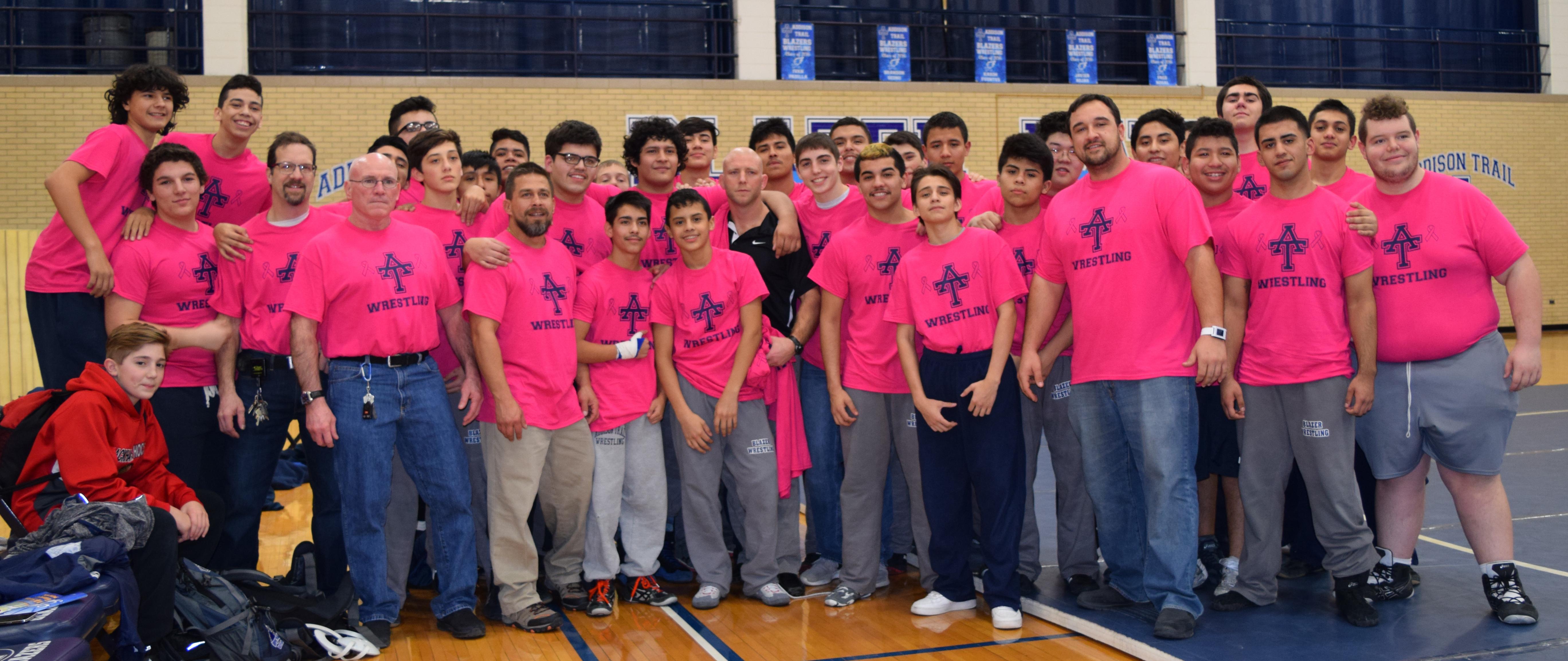 Addison Trail senior Karim Fuentes came up with the idea to have T-shirts made in support of Serio. During the Senior Night wrestling match on Jan. 22 against Hinsdale South High School, the Addison Trail Wrestling Team wore pink T-shirts with the words “Team Serio” on the back. The players huddled around Serio before the match, and he thanked them each with a hug.