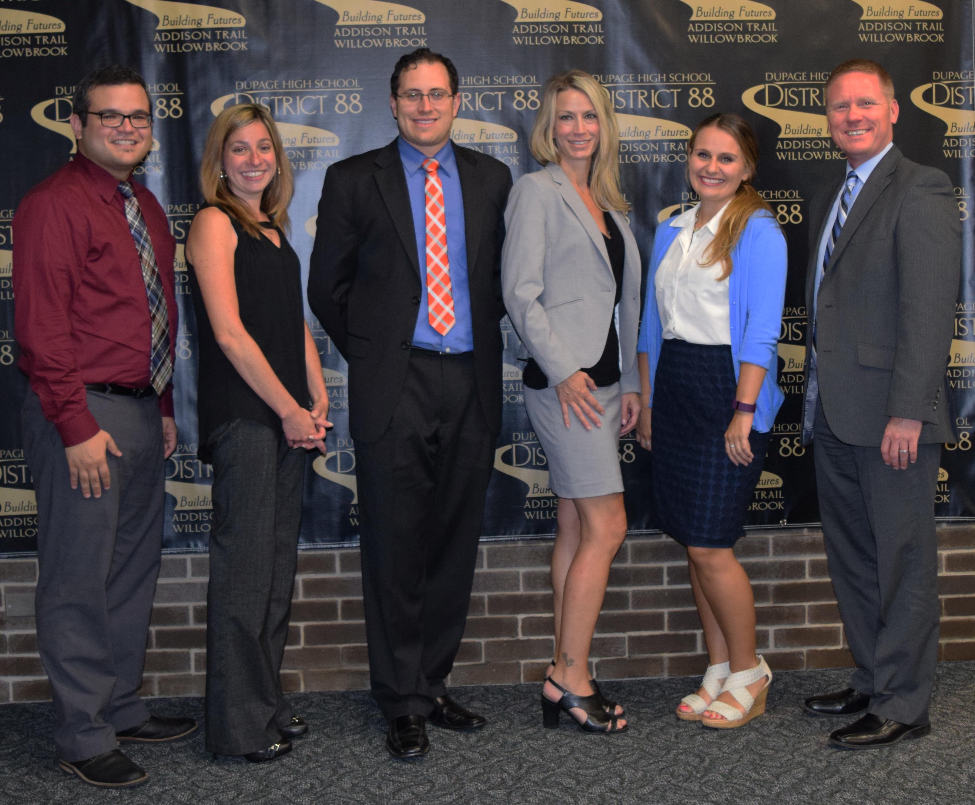 Pictured are several newly hired Willowbrook staff members for the 2016-17 school year, who were welcomed by the District 88 Board of Education on Aug. 29. The Board also welcomed returning individuals who have new positions this school year. They are pictured with Willowbrook Principal Dan Krause (right) and are (from left) Dmitri Martinez, Amanda Rohlfing, Andrew Levin, Holly Fournier and Karina Klimek.