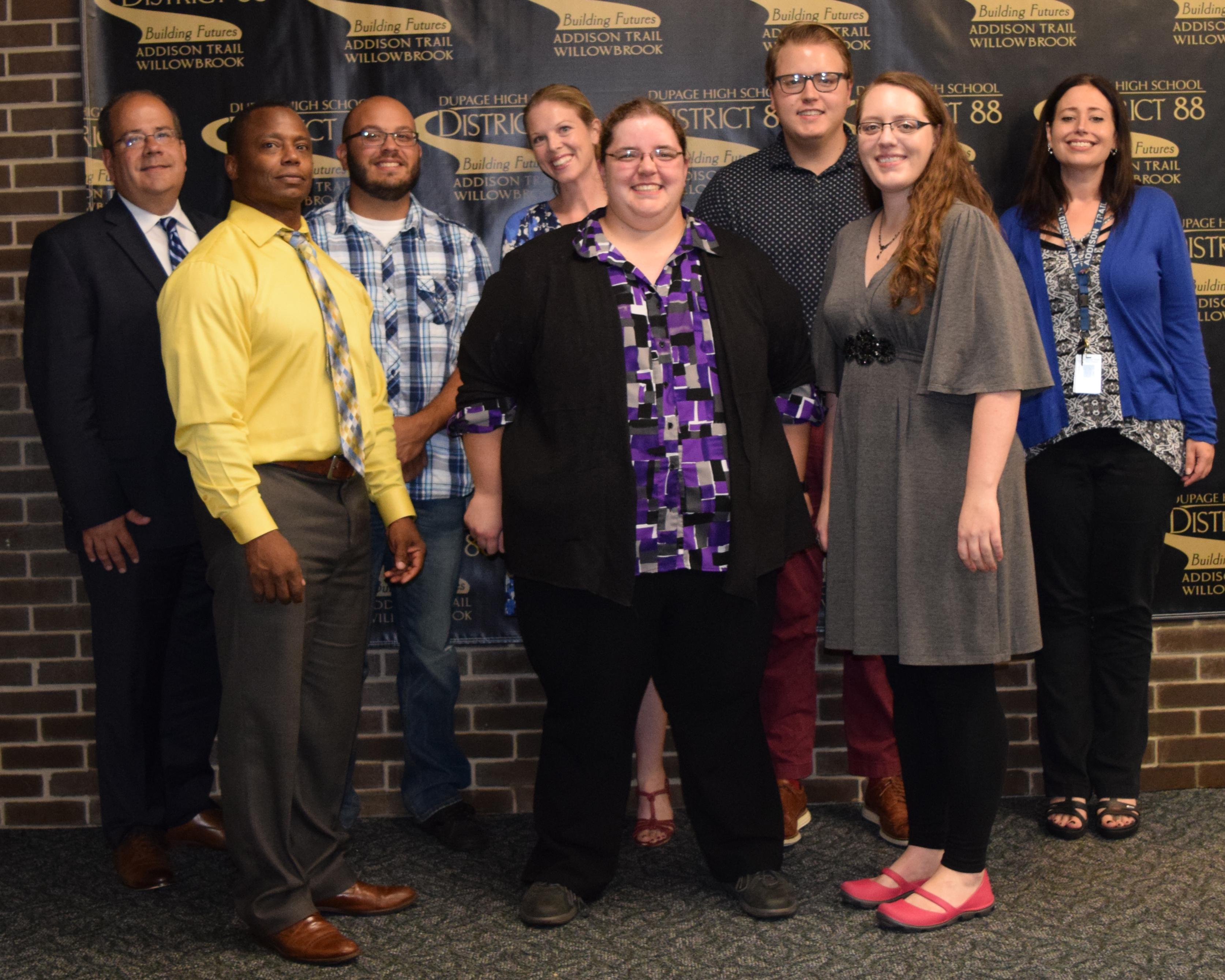 Pictured are several newly hired Addison Trail staff members for the 2016-17 school year, who were welcomed by the District 88 Board of Education on Aug. 29. The Board also welcomed returning individuals who have new positions this school year. They are pictured with Addison Trail Principal Michael Bolden (left) and are (from left) Stephen Holland, Anthony Vallone, Nicole Slade, Claire Shoup, Alexender Strombres, Rebecca Boisse and Marianne Eisley.