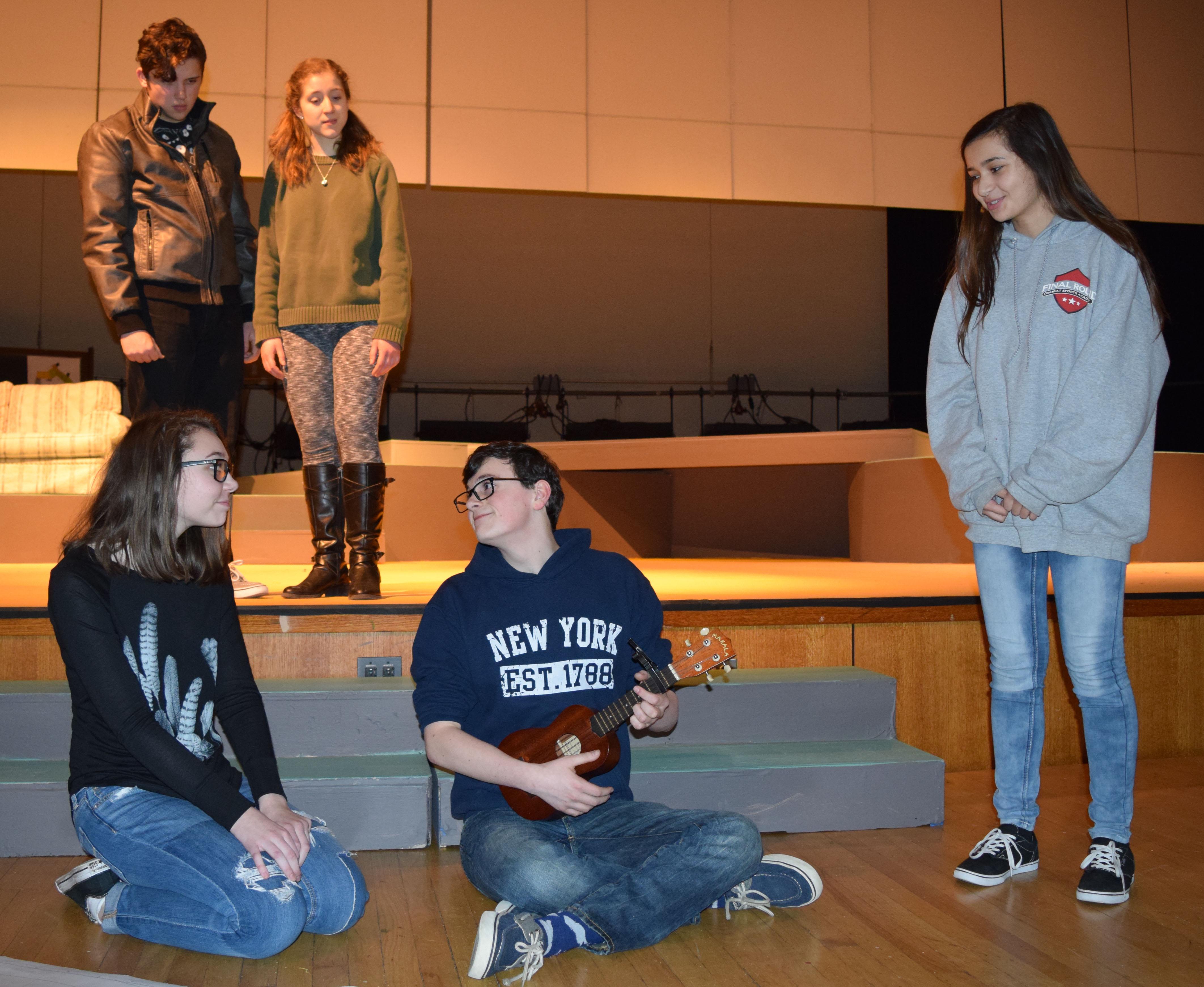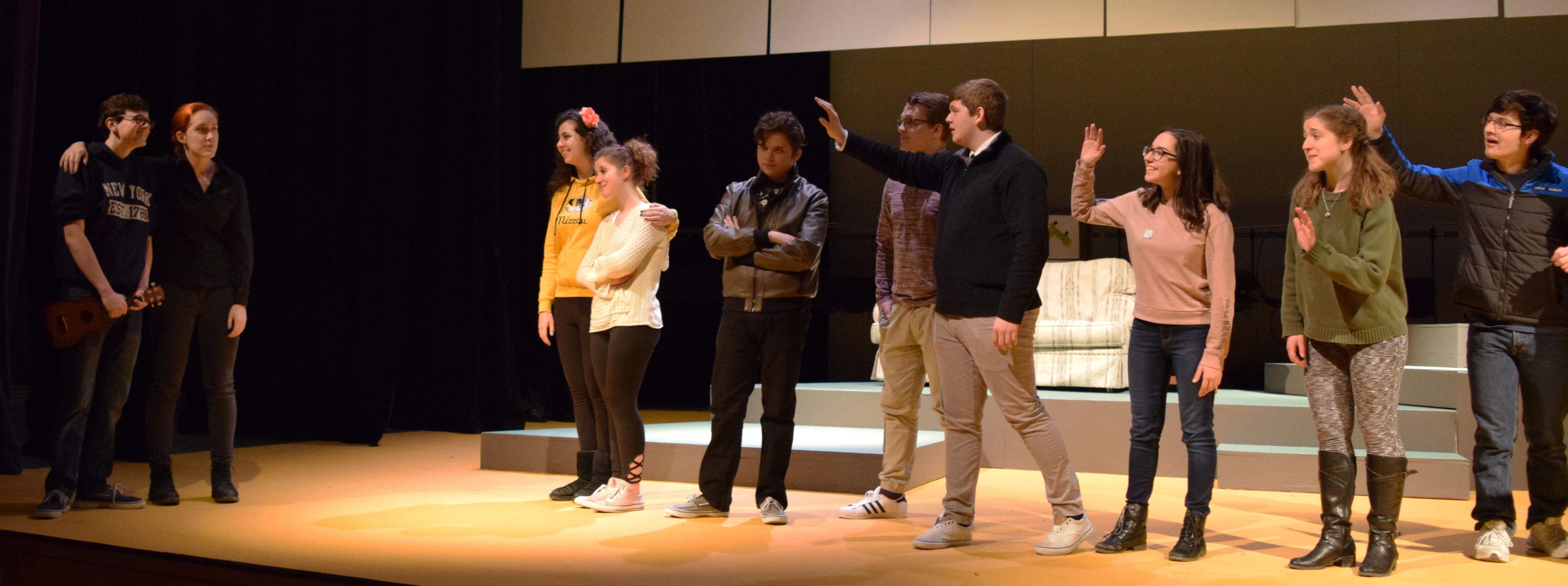 In this scene, students at the middle school begin to discover they shouldn't judge Cap (played by sophomore Joe LaPointe, center) so quickly and harshly, as he leads them in a song after finding a dead bird. Pictured with LaPointe are (back row, from left) junior John DeAngelo, junior Julia Cicero, (front row, from left) freshman Emma Cismesia and freshman Liana Weaver.