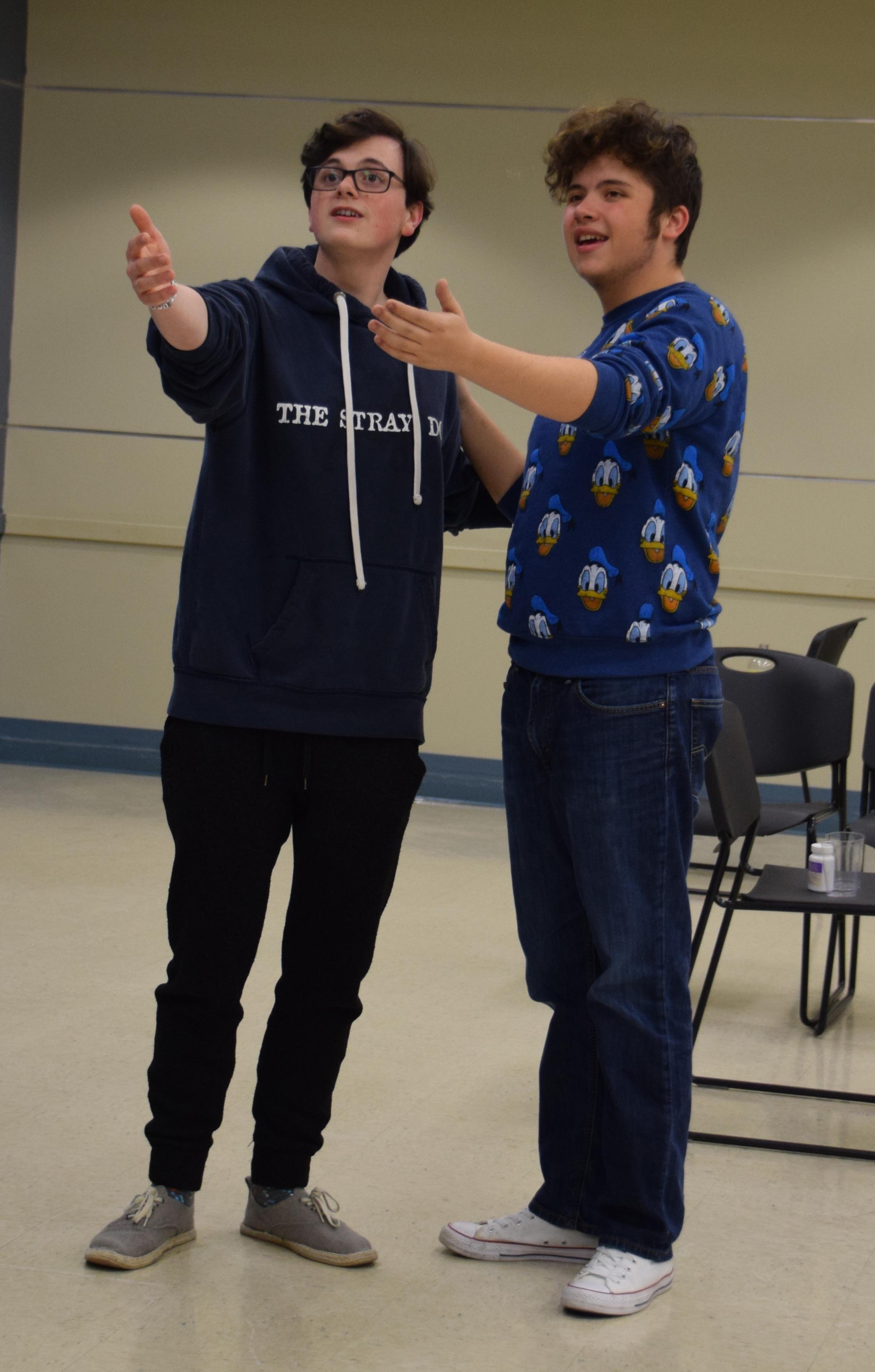 (From left) Willowbrook junior Joe LaPointe (Max) and senior John DeAngelo (Tito Merelli) rehearse a scene from the school's upcoming winter play, "Lend Me a Tenor."
