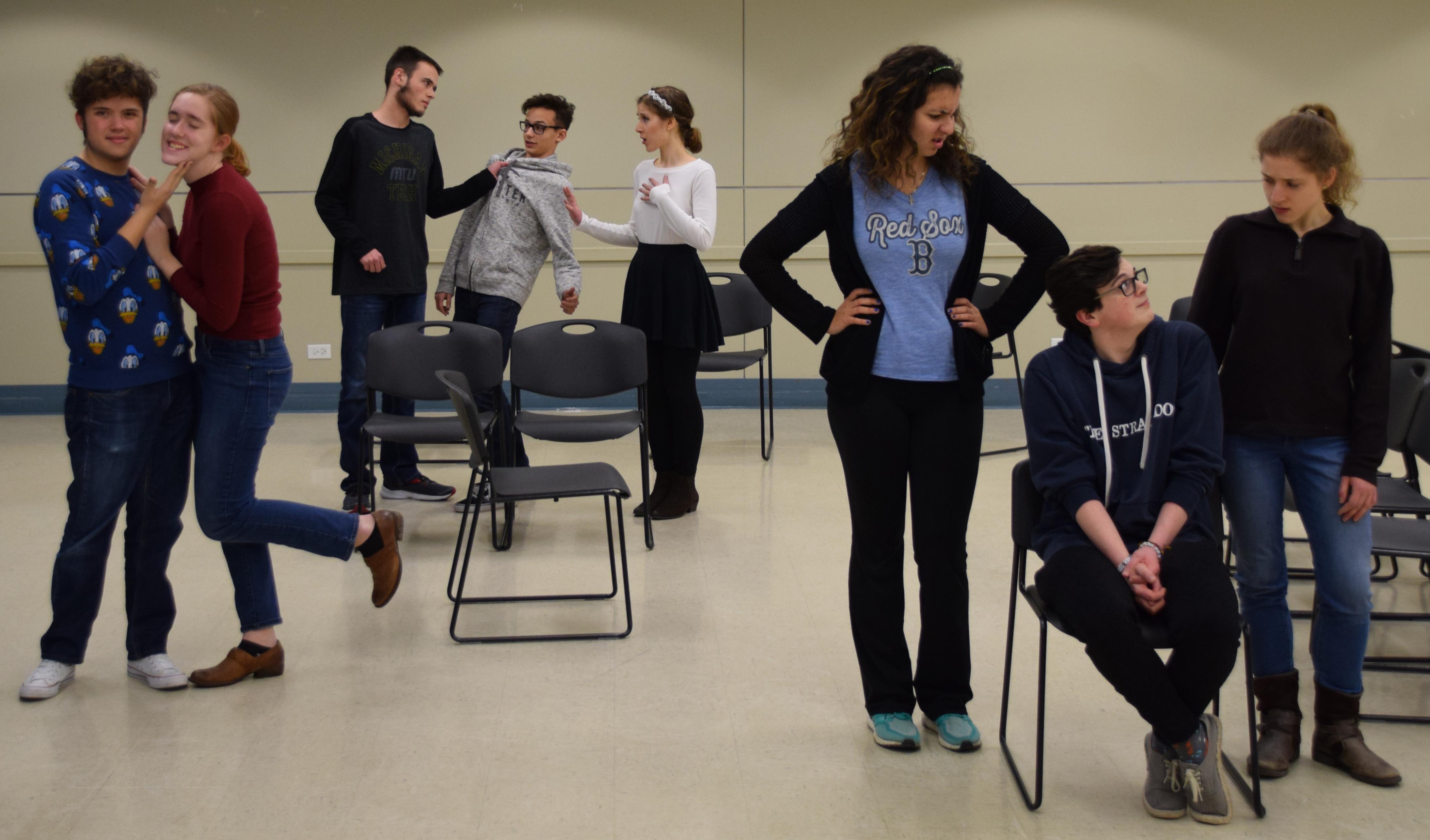 Willowbrook students rehearse a scene from the school's upcoming winter play, "Lend Me a Tenor." They are (from left) senior John DeAngelo (Tito Merelli), senior Genevieve Corkery (Maria Merelli), senior Jake Friguletto (Henry Saunders), sophomore Javi Sweeney (the bellhop), senior Kathleen Cicero (Julia), senior Isabella Ledonne (Diana), junior Joe LaPointe (Max) and senior Julia Cicero (Maggie Saunders).