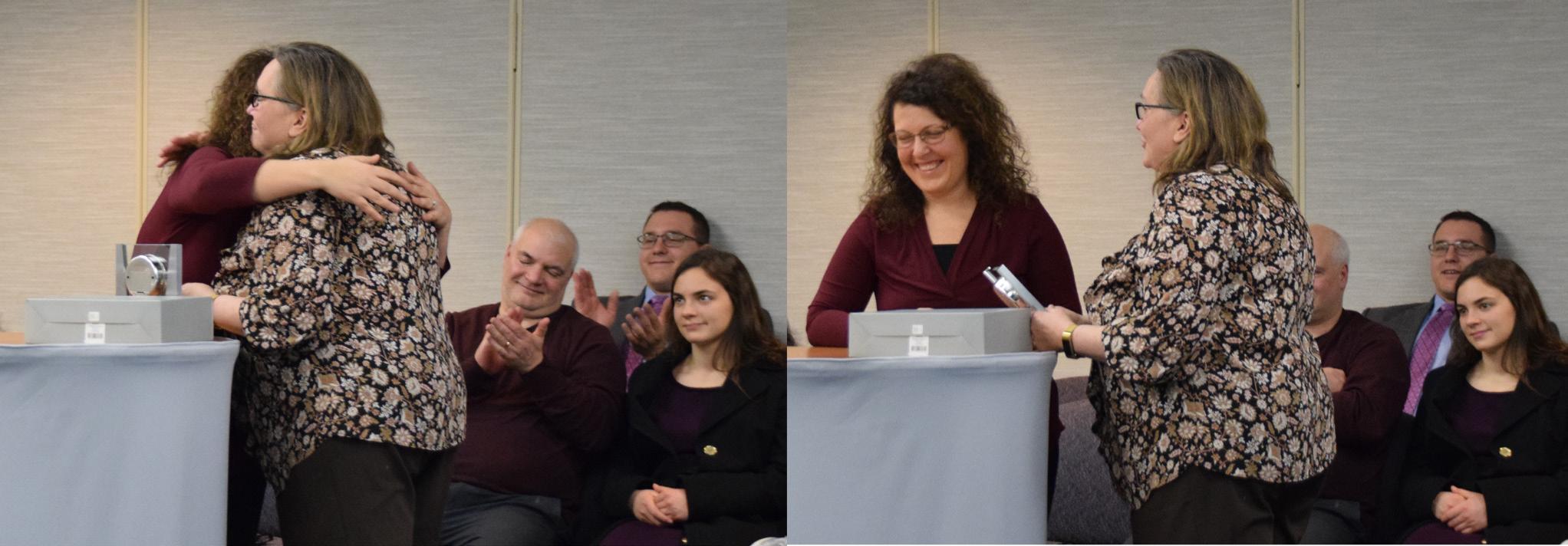 District 88 Board of Education President Donna Craft Cain (right) presents District 88 Assistant Superintendent Dr. Jean Barbanente with an engraved clock to honor and congratulate Barbanente for earning her doctoral degree. Barbanente was recognized for her accomplishment during the Dec. 16 Board of Education meeting.