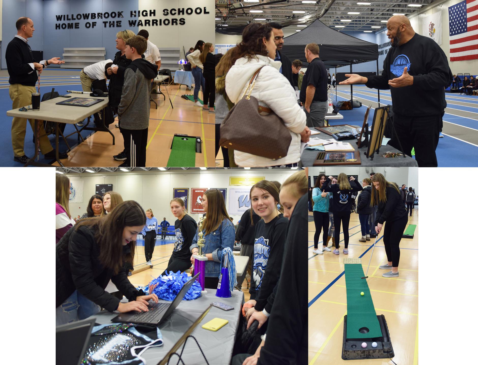Participants learn about Willowbrook's athletic programs during the school's annual Meet the Coaches Night. That event took place as part of the school's annual Curriculum Showcase on Jan. 16 to provide incoming and current students and parents/guardians with information about Willowbrook. Top left: Willowbrook Head Boys Golf Coach Gary Walker (left) speaks with Nick Gillono (an eighth-grader at Jackson Middle School) and his mother, Kirsten. Top right: Head Coach Terry Harrell shares information about the Willowbrook Girls Basketball Team. Bottom left: Brenda Martinez, an eighth-grader at Jackson Middle School, signs up to learn more about the Willowbrook Cheerleading Team. Bottom right: Members of the Willowbrook Girls Golf Team show their skills and school spirit. They are sophomore Claire Harr (putting), freshman Alyssa Basford (displaying her Willowbrook sweatshirt) and freshman Madison Aderholt (pointing at Basford).