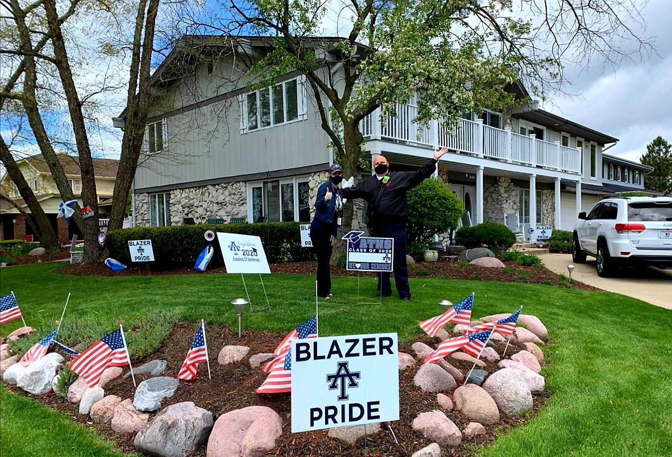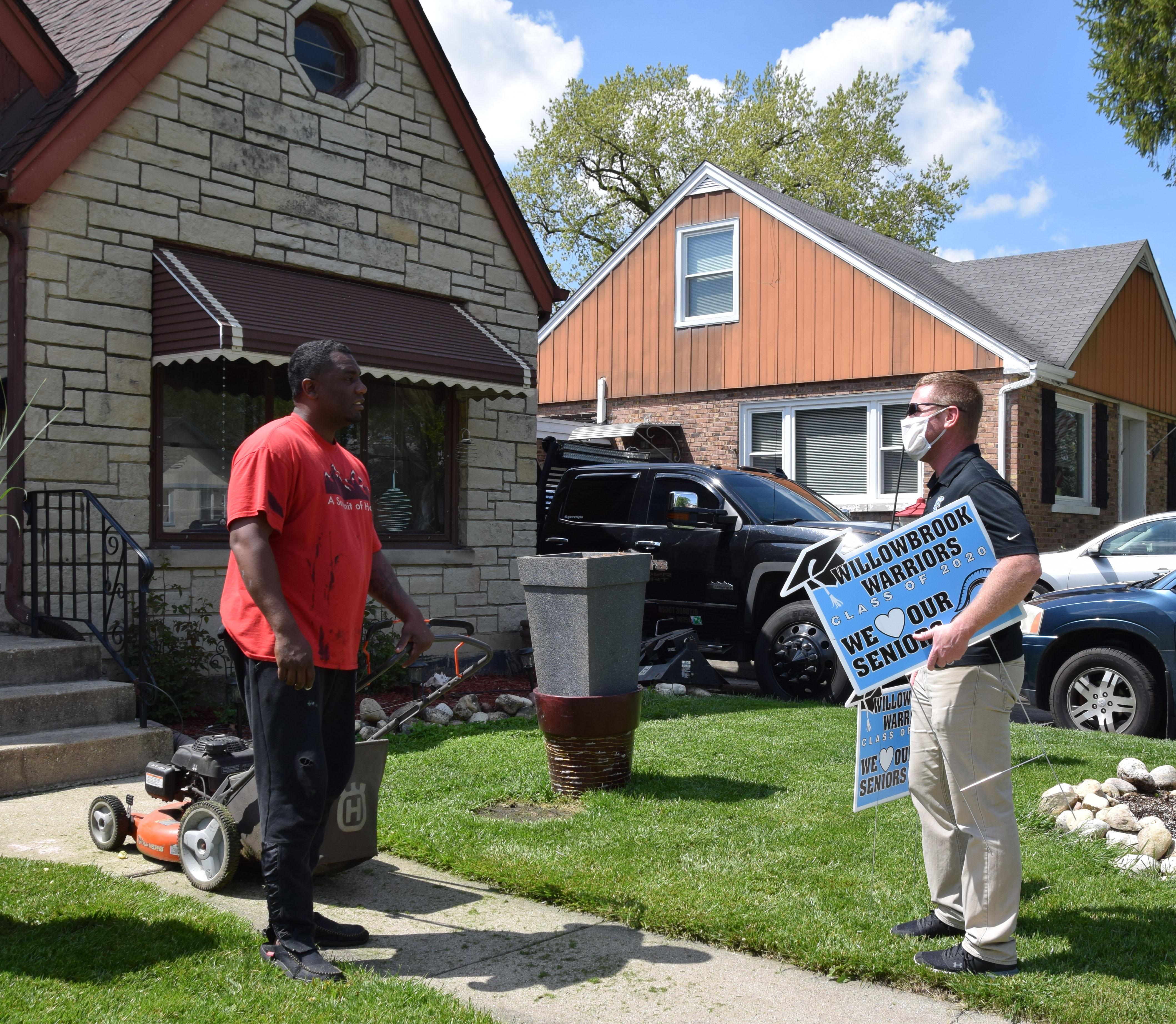 Yard-sign distribution: Staff members, community members, legislators, local first responders, village leaders and representatives from intergovernmental agencies volunteered to distribute signs to the members of the Addison Trail and Willowbrook class of 2020.