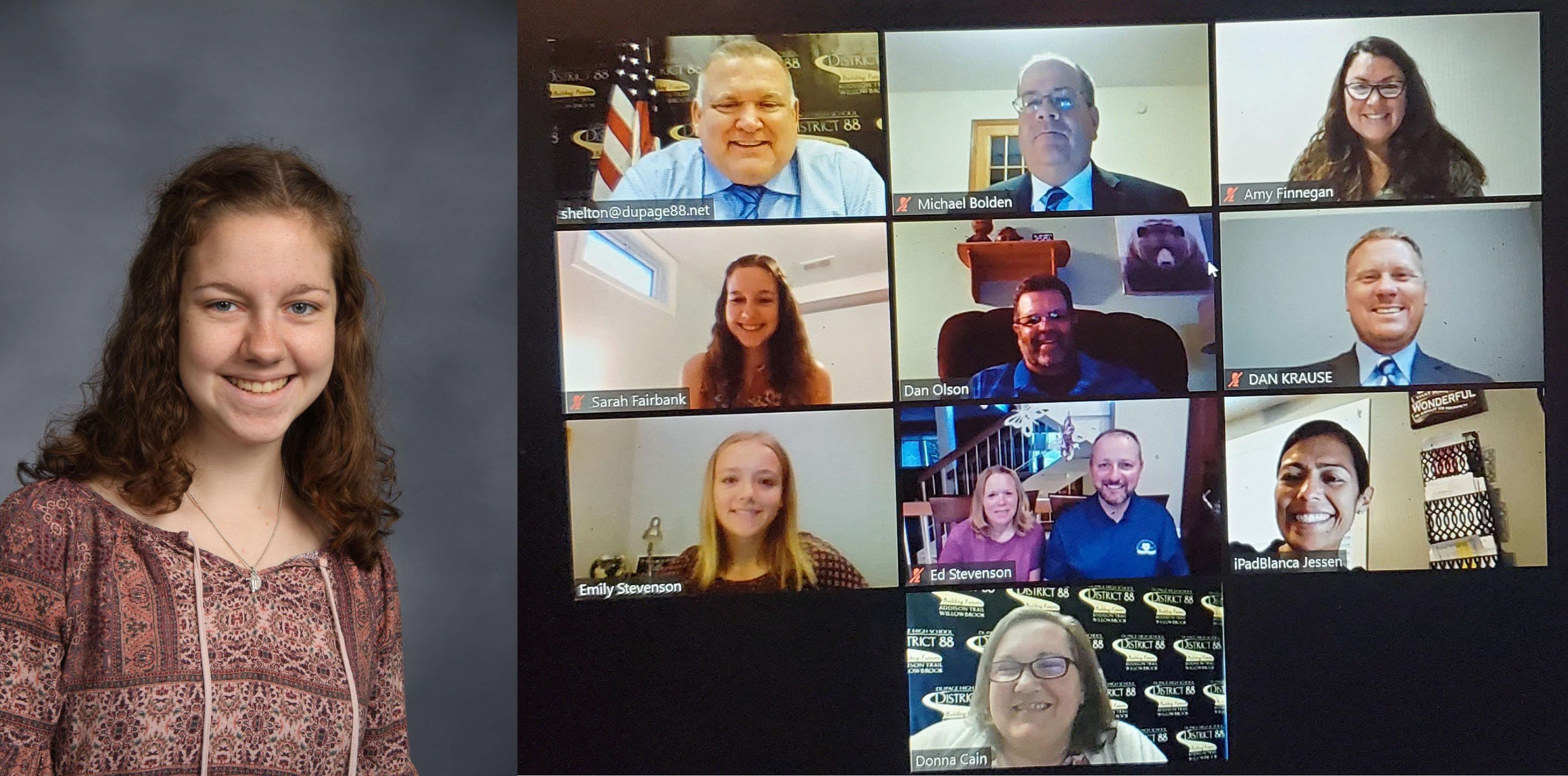 Left: Pictured is Willowbrook senior Sarah Fairbank, who has been named as the school's August recipient of 88’s Best recognition for her outstanding academic accomplishments. Right: Fairbank (pictured at left in the second row from the top) is recognized as Willowbrook's August recipient of 88’s Best recognition during the District 88 Board of Education meeting on Aug. 24.