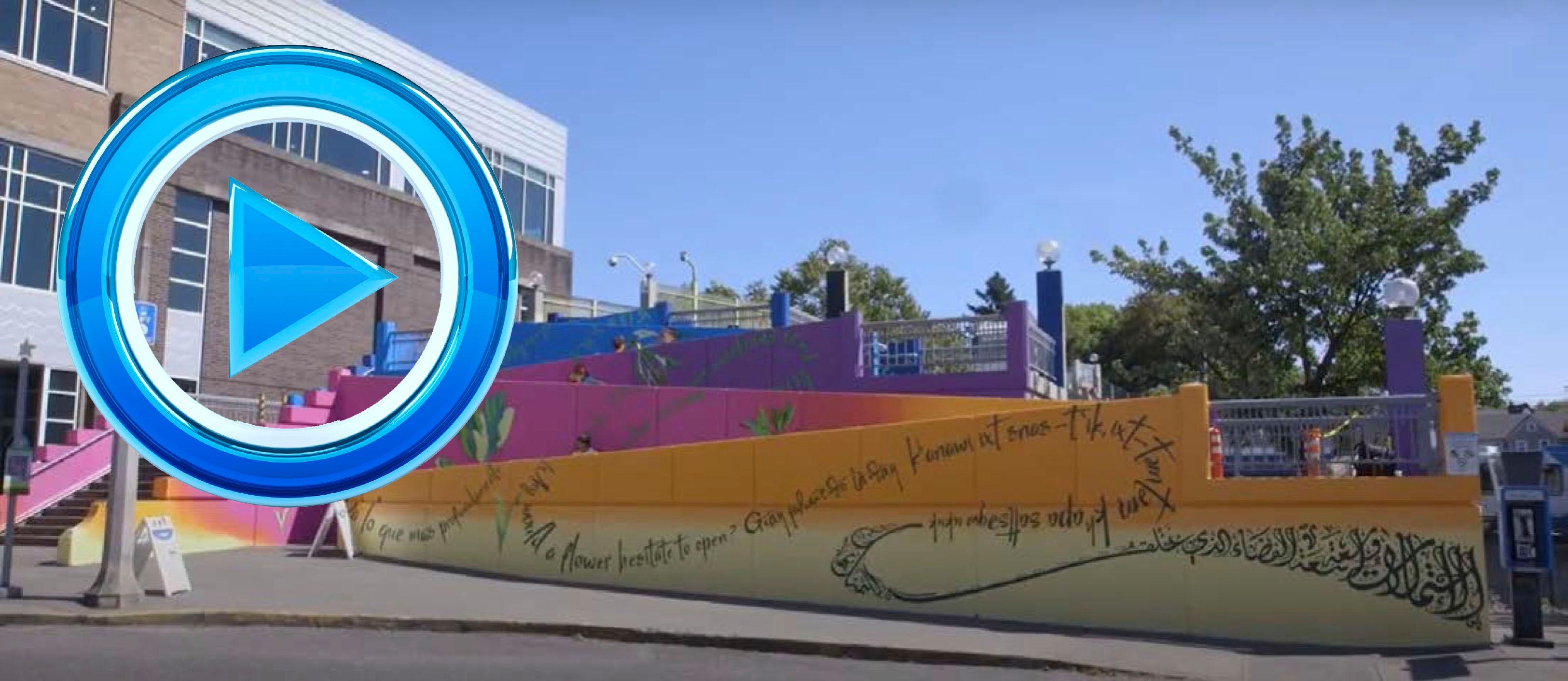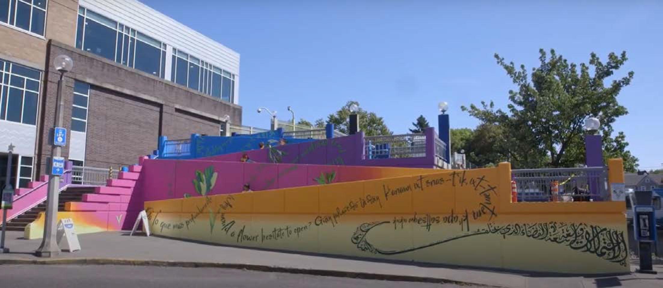 A mural Farahat created at Hollywood Transit Center in Portland, Oregon, served as the backdrop for a portion of the Aug. 18 virtual roll call of delegates from throughout the country and various U.S. territories declaring Joe Biden as the Democratic Party’s presidential nominee. Farahat was commissioned by TriMet to create the piece, entitled “We Choose Love,” to honor the lives that were lost and the lives that were touched by the tragic event that took place on May 26, 2017. On that day, three riders on a MAX train approaching Hollywood Transit Center were assaulted after they stood up to a man who was harassing two young women based on their race and religion. Two of the intervening riders were killed, and the third was left with life-threatening injuries. According to https://trimet.org/tribute, “The mural (which was completed during the summer of 2018) transformed nearly 2,000 feet of wall space at the Hollywood Transit Center, weaving together color, text and images to invoke a transition from sunset to night.”