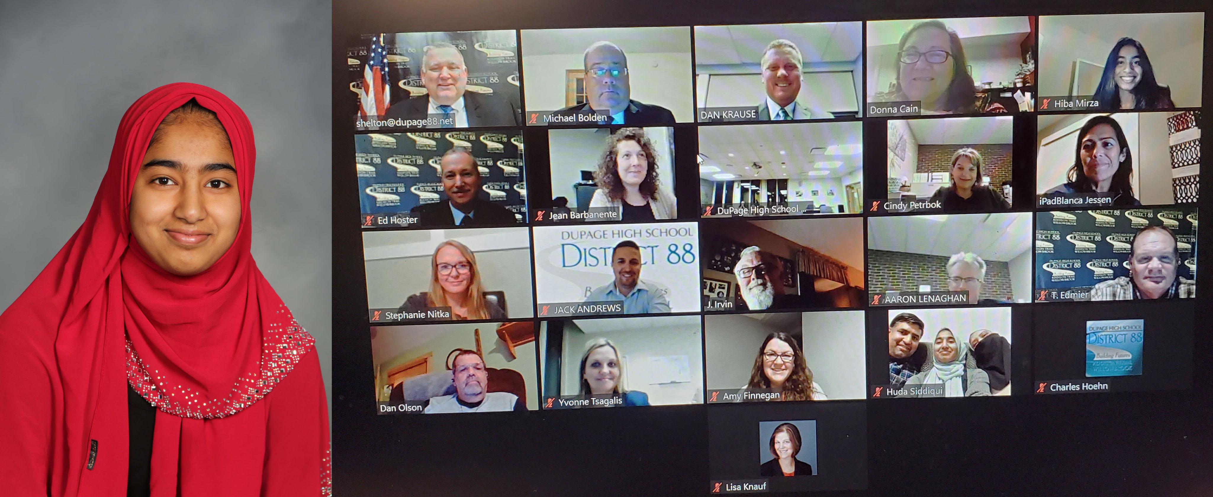 Left: Pictured is Addison Trail senior Huda Siddiqui, who has been named as the school's September recipient of 88’s Best recognition for her outstanding academic accomplishments. Right: Siddiqui (pictured second from right in the second row from the bottom, with her parents) is recognized as Addison Trail's September recipient of 88’s Best recognition during the District 88 Board of Education meeting on Sept. 21.