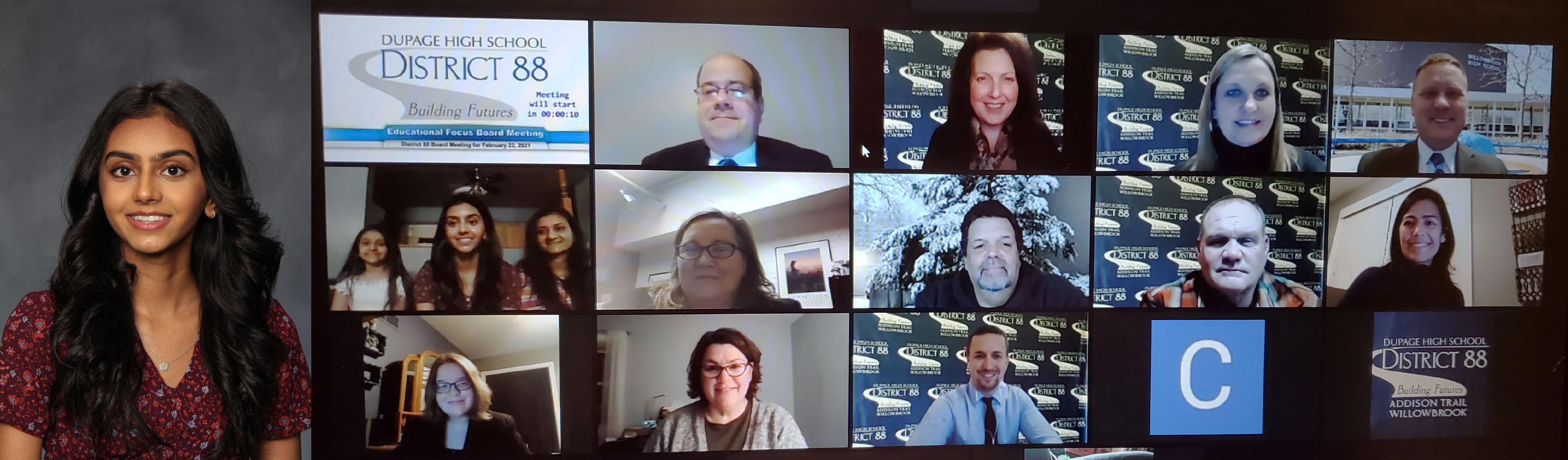 Left: Pictured is Addison Trail senior Jina Patel, who has been named as the school's February recipient of 88’s Best recognition for her outstanding service work. Right: Patel (pictured at left in the middle row, with her family) is recognized as Addison Trail's February recipient of 88’s Best recognition during the District 88 Board of Education meeting on Feb. 22.