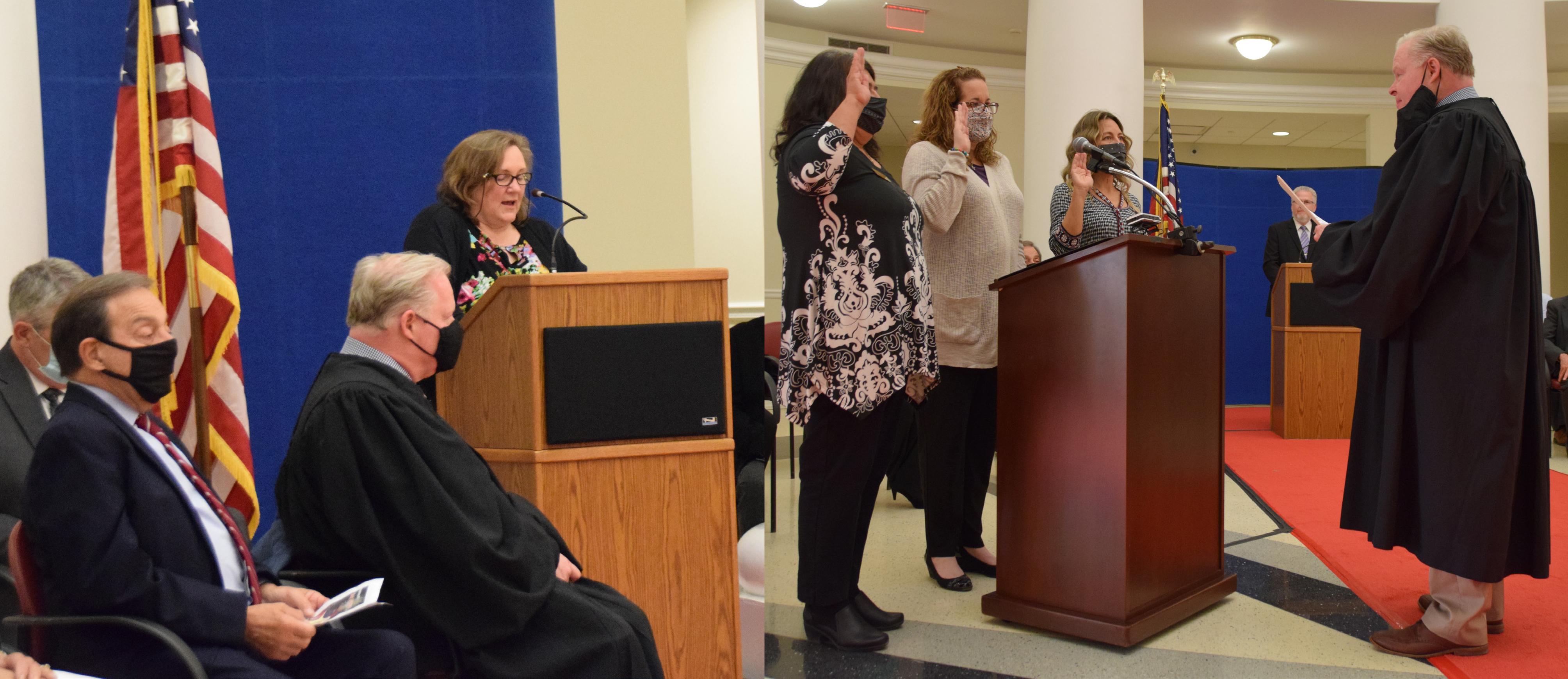 Left: District 88 Board of Education President Donna Craft Cain gives a speech about the district during the Village of Addison Community Inauguration Ceremony on April 29. Right: The Honorable Liam Brennan (Appellate Court Judge for the Second District of the State of Illinois) administers the Oaths of Office to new District 88 Board of Education members Christine Poirier (center), Jean Taylor (left) and Diana Stout (right) during the Village of Addison Community Inauguration Ceremony on April 29.