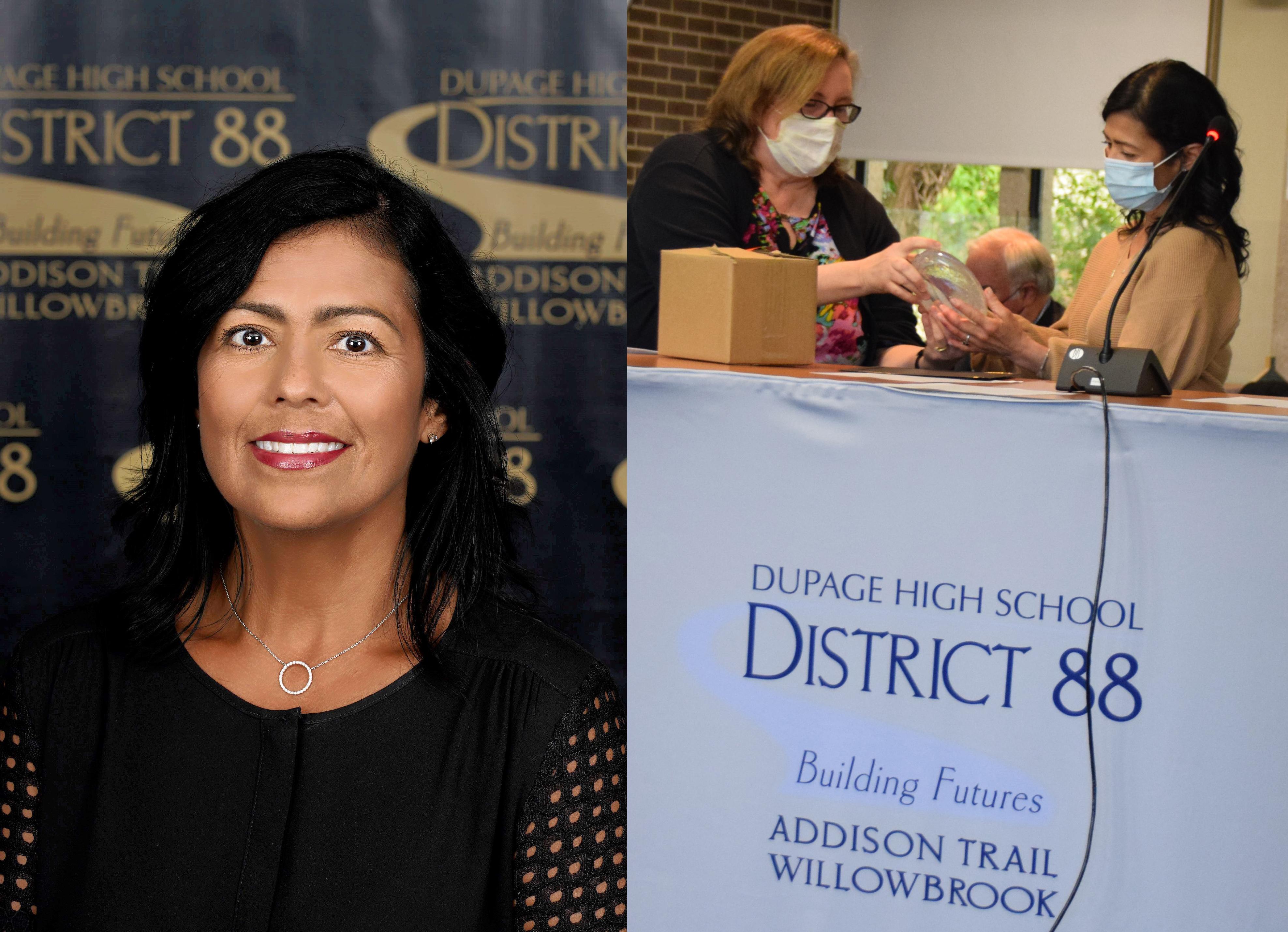 Left: Pictured is Blanca Jessen. Right: District 88 Board of Education President Donna Craft Cain thanks Jessen for her years of service on the Board and presents her with a personalized glass sculpture.