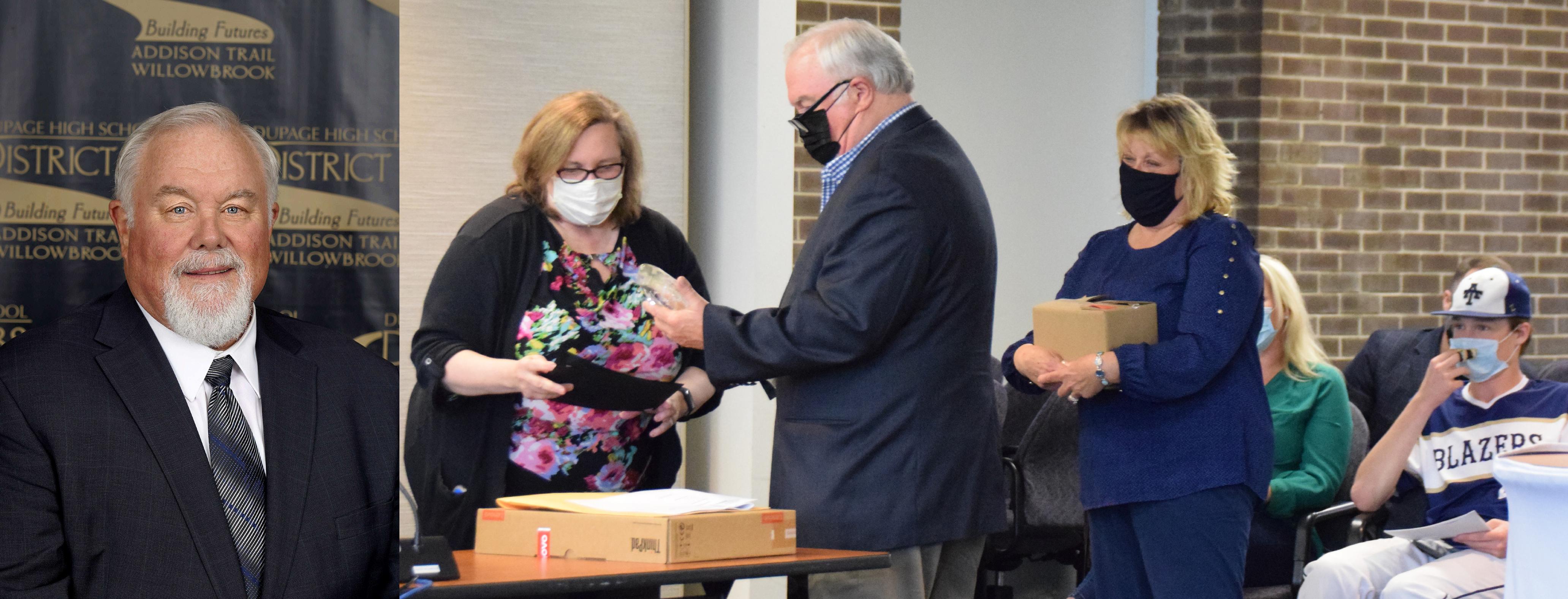 Left: Pictured is Jay Irvin. Right: District 88 Board of Education President Donna Craft Cain thanks Irvin for his years of service on the Board and presents him with a personalized glass sculpture. Pictured at right are members of Irvin's family.