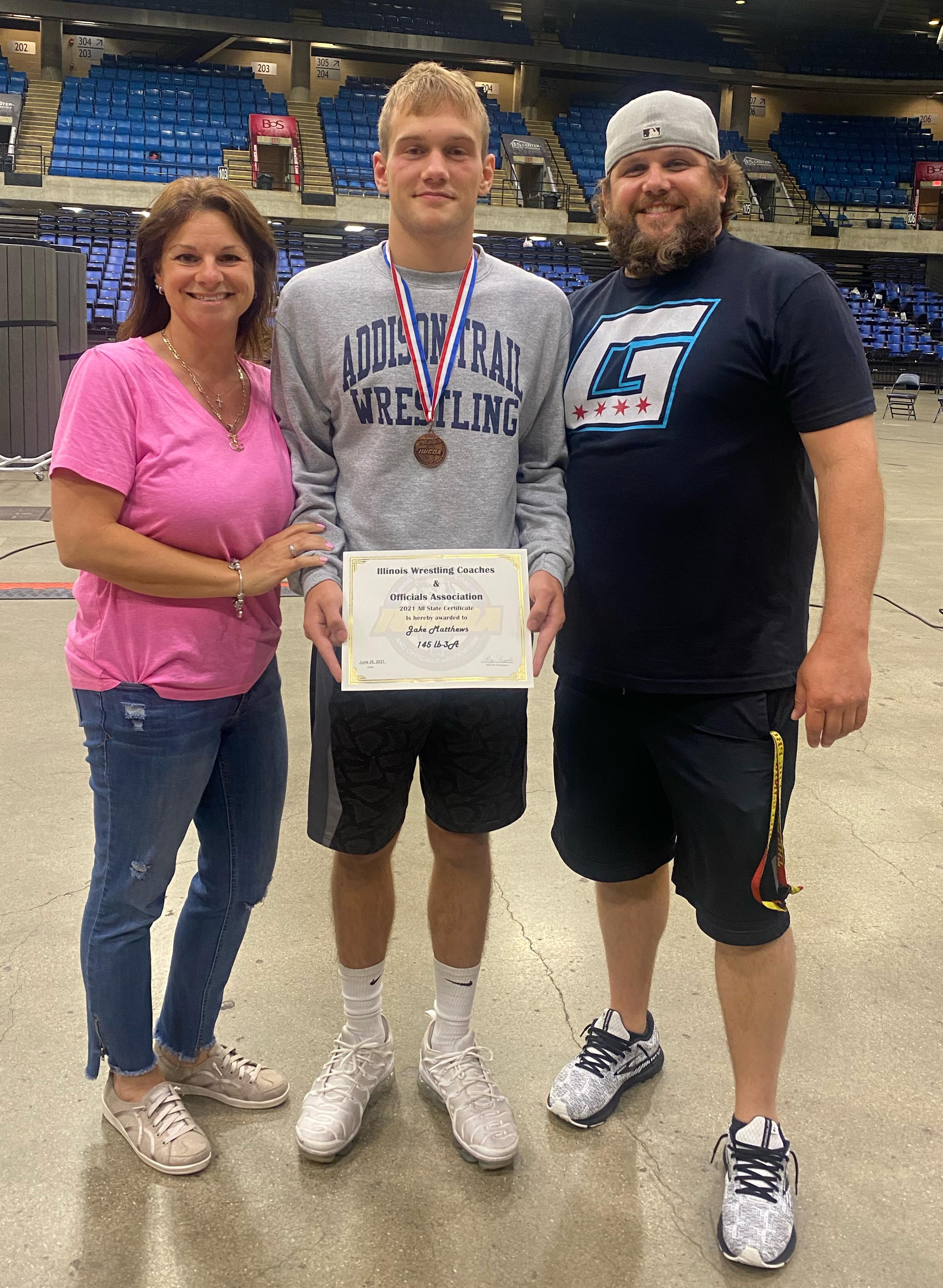 Addison Trail alumnus Jake Matthews (class of 2021) recently competed in the Illinois Wrestling Coaches and Officials Association (IWCOA) Class 3A State Championships in the 145-pound division. The event took place on June 26 in Springfield.