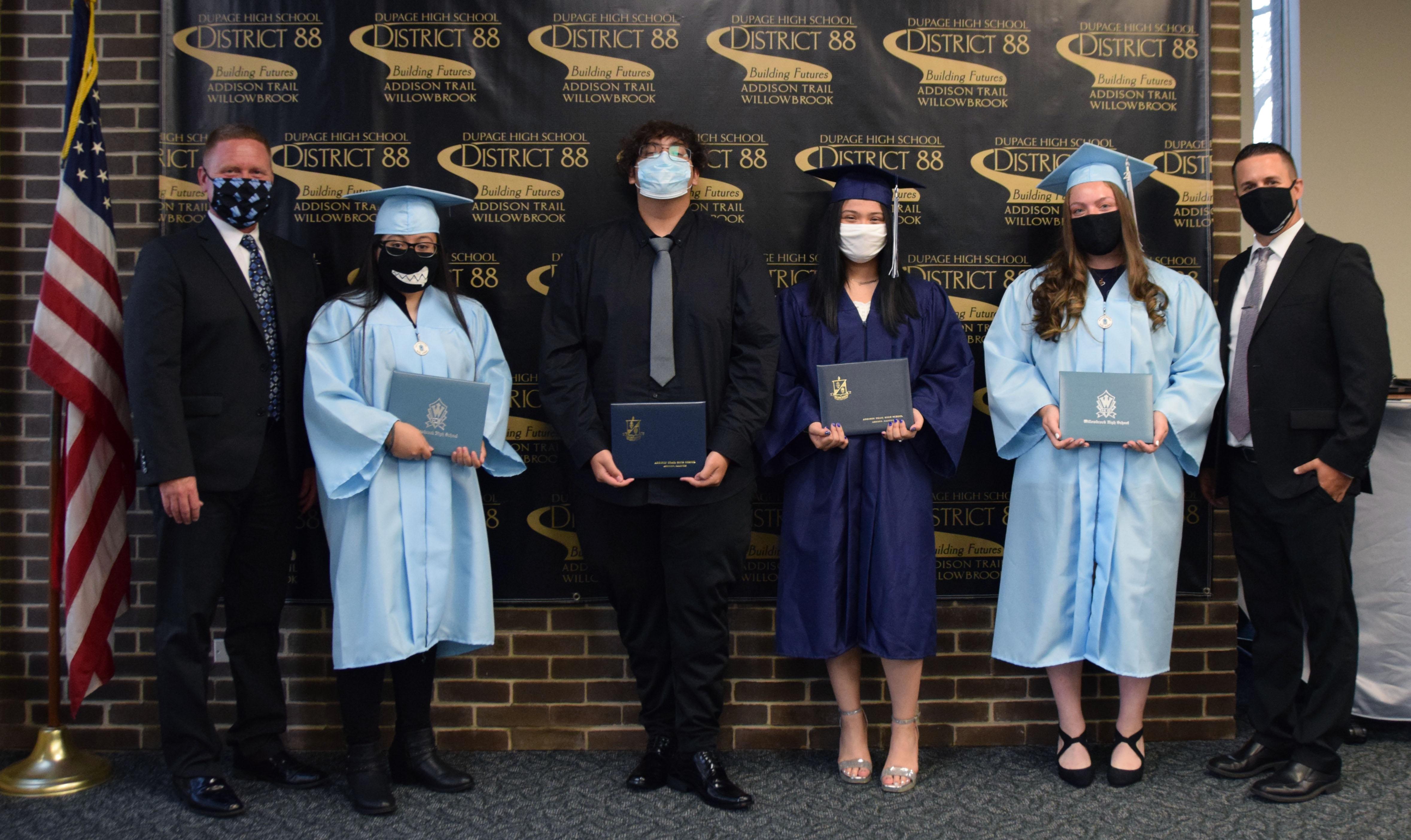Pictured are (from left) Willowbrook Principal Dr. Daniel Krause, Monzerrat De La Paz (Willowbrook graduate), Diego Perez (Addison Trail graduate), Samantha Calzado (Addison Trail graduate), Allyssa Lorann (Willowbrook graduate) and Addison Trail Principal Jack Andrews.
