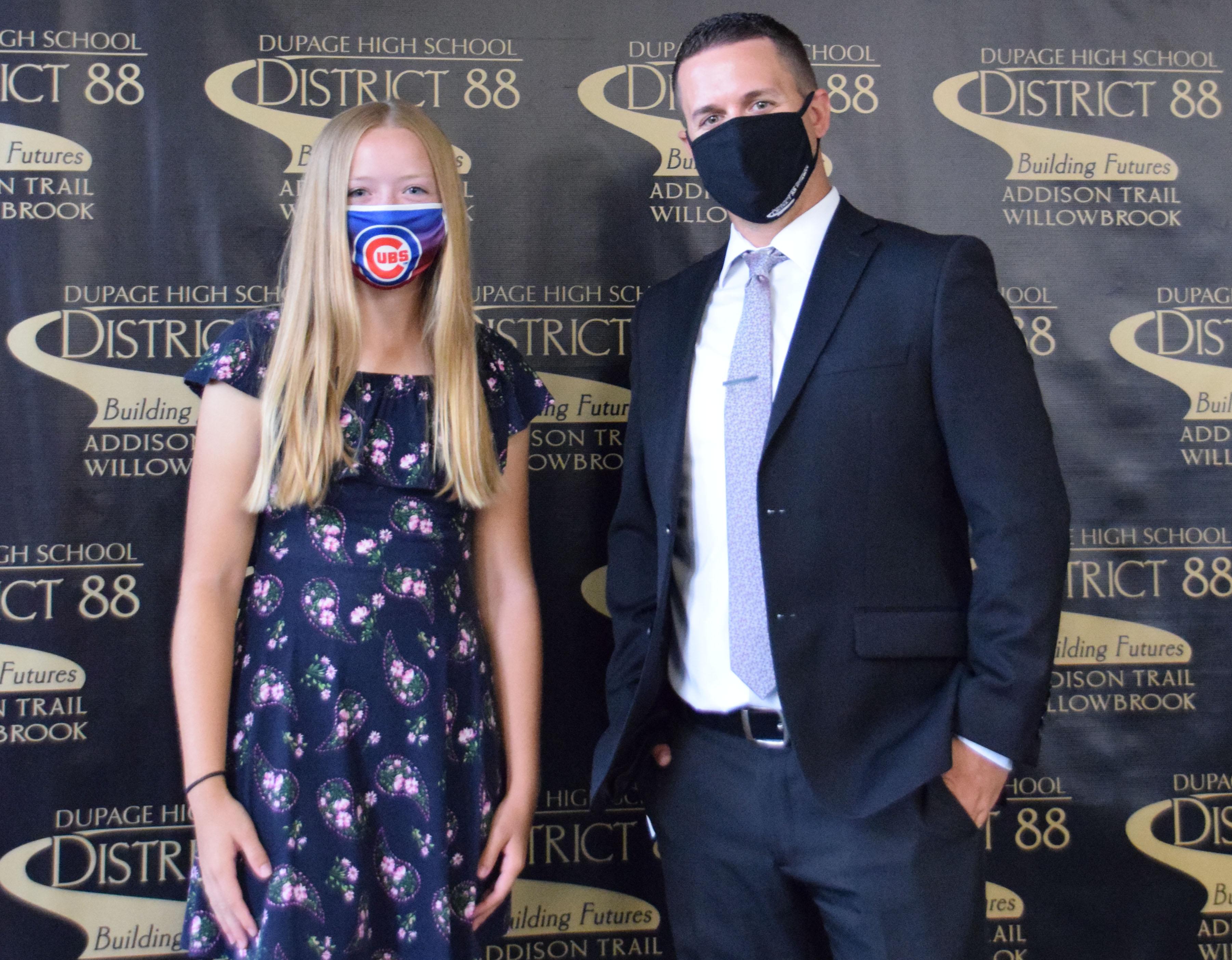 Lindsay Stevenson (pictured above, with Addison Trail Principal Jack Andrews) has been named as Addison Trail’s August recipient of 88’s Best recognition for her outstanding academic accomplishments. Stevenson, a senior, was recognized during the Aug. 30 District 88 Board of Education meeting. To watch her 88’s Best presentation, click on the video above.
