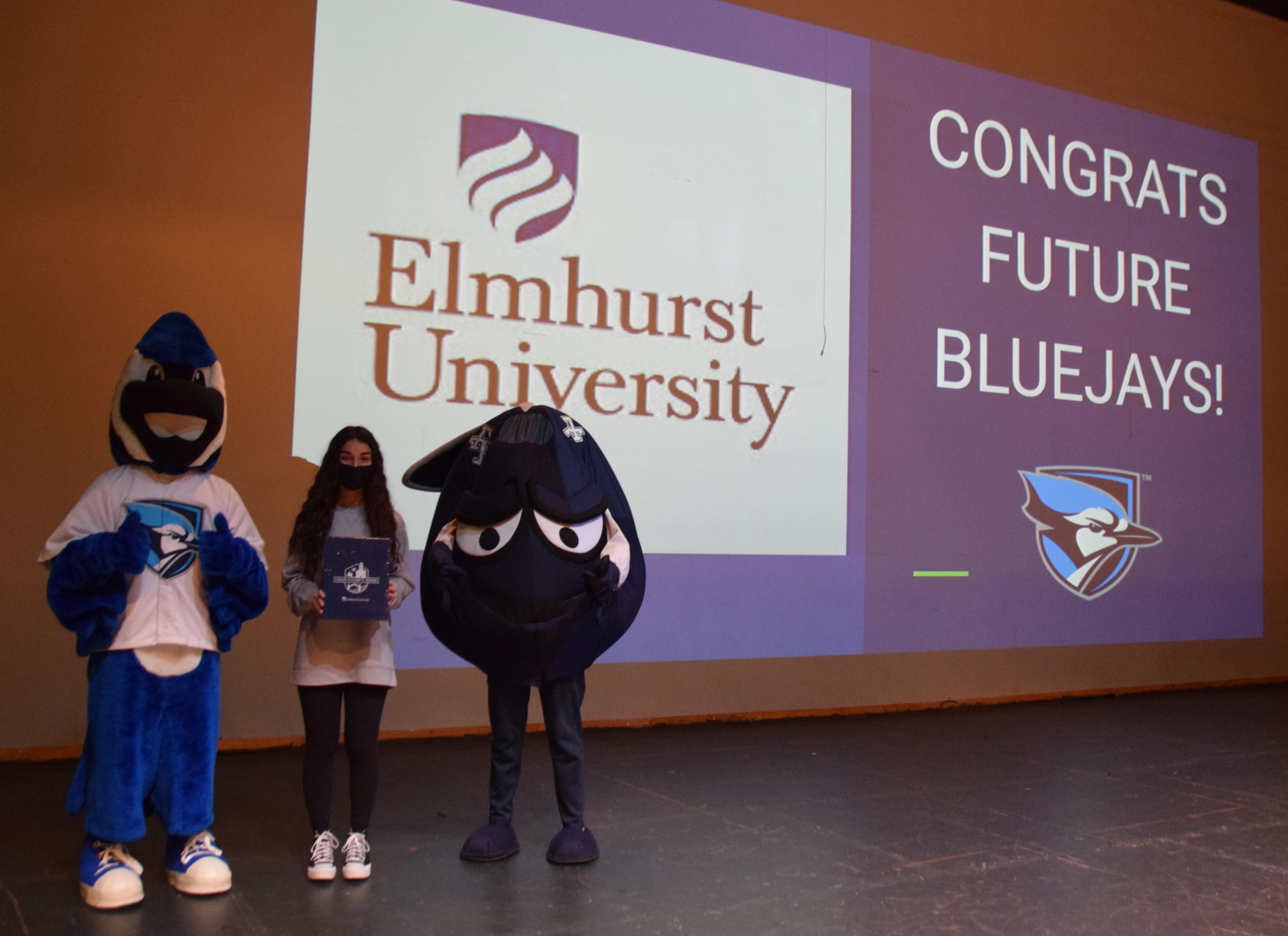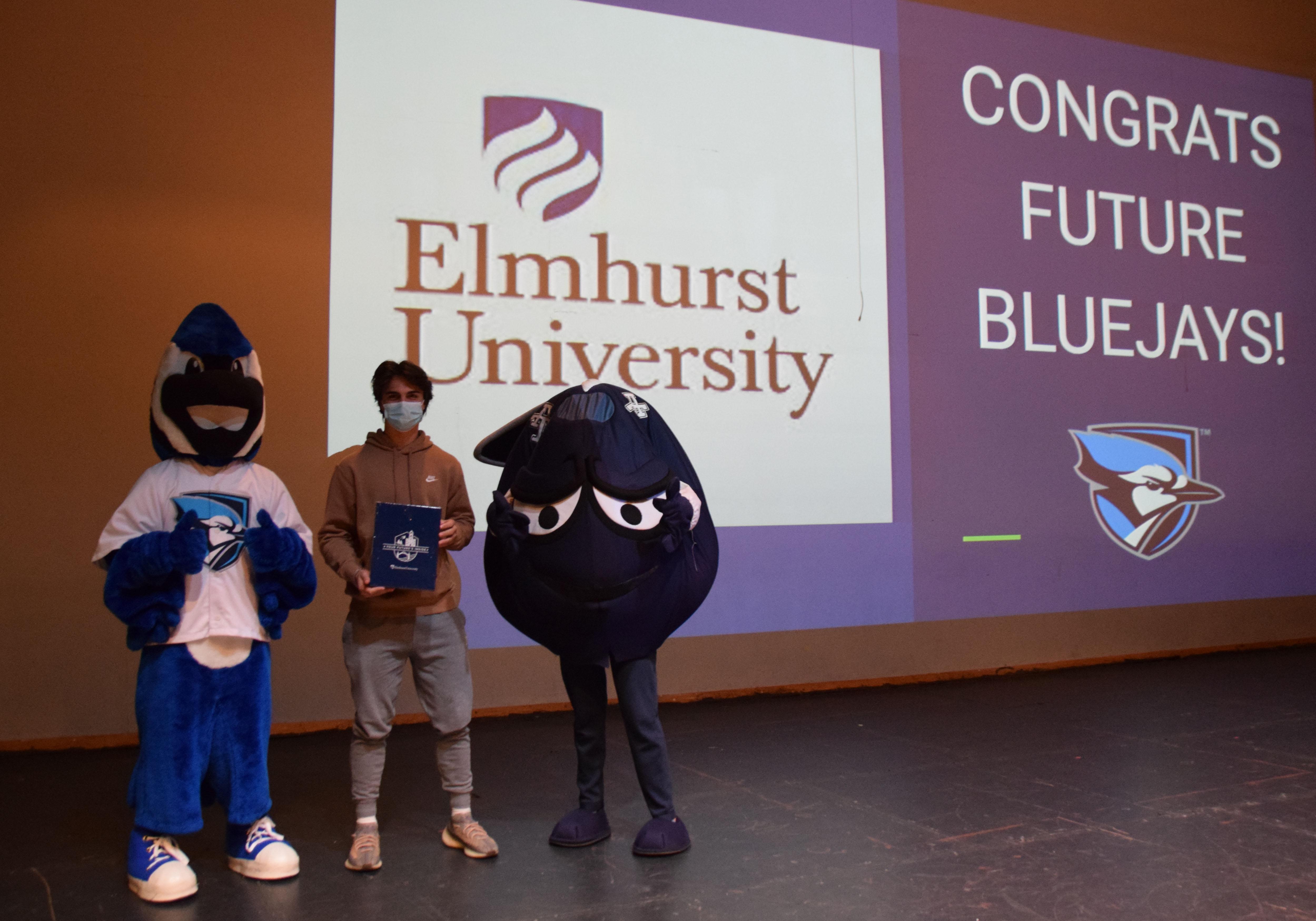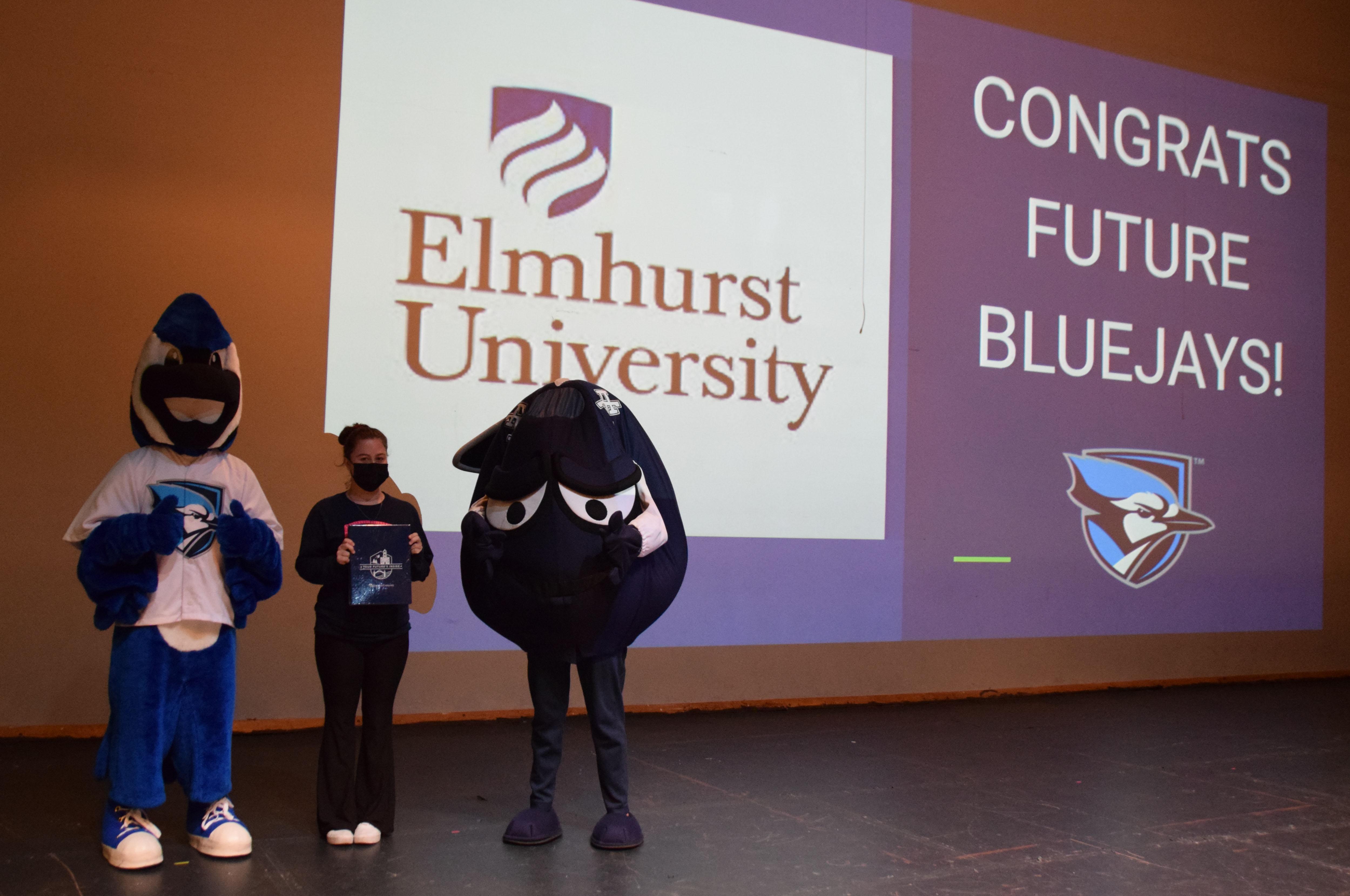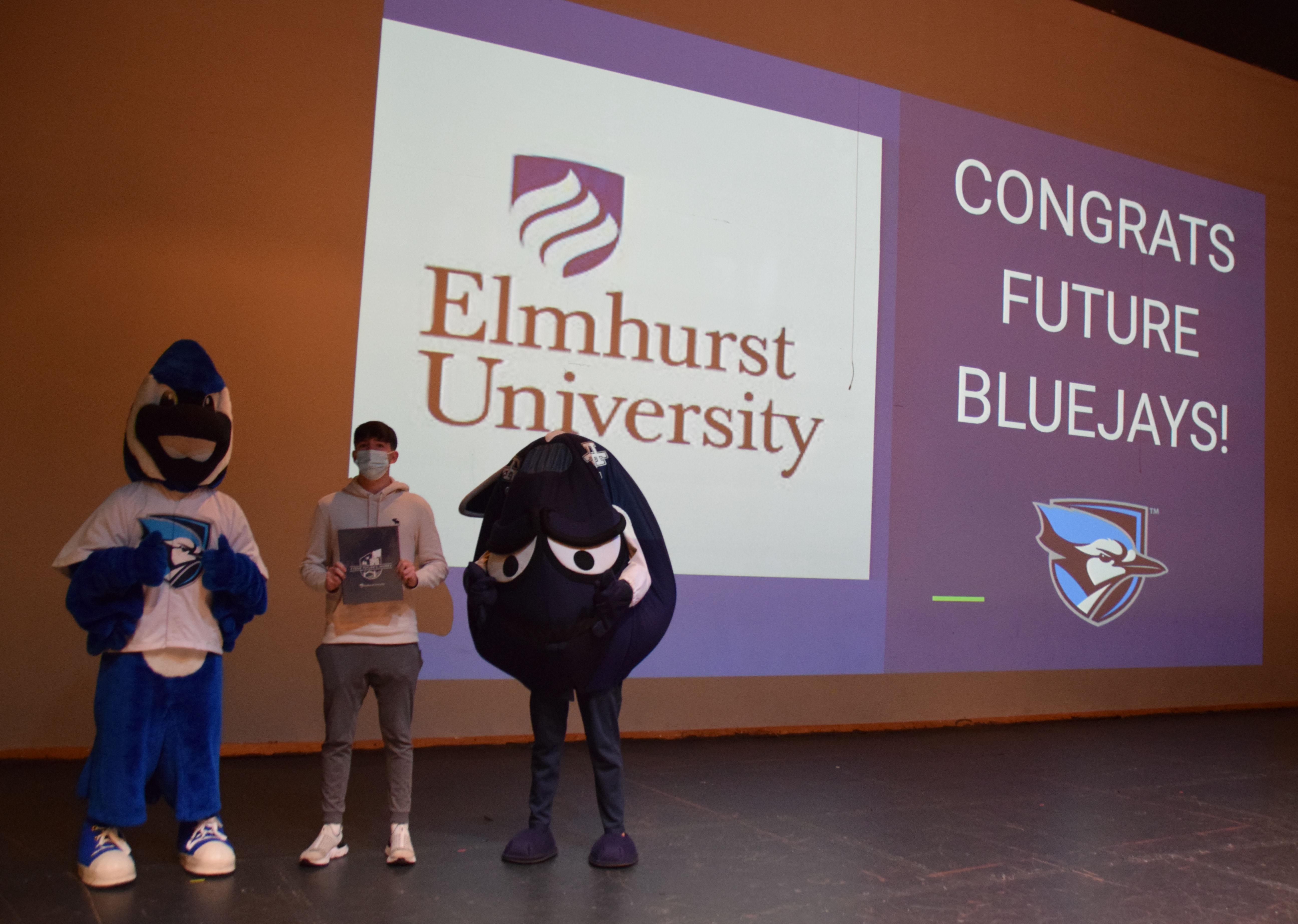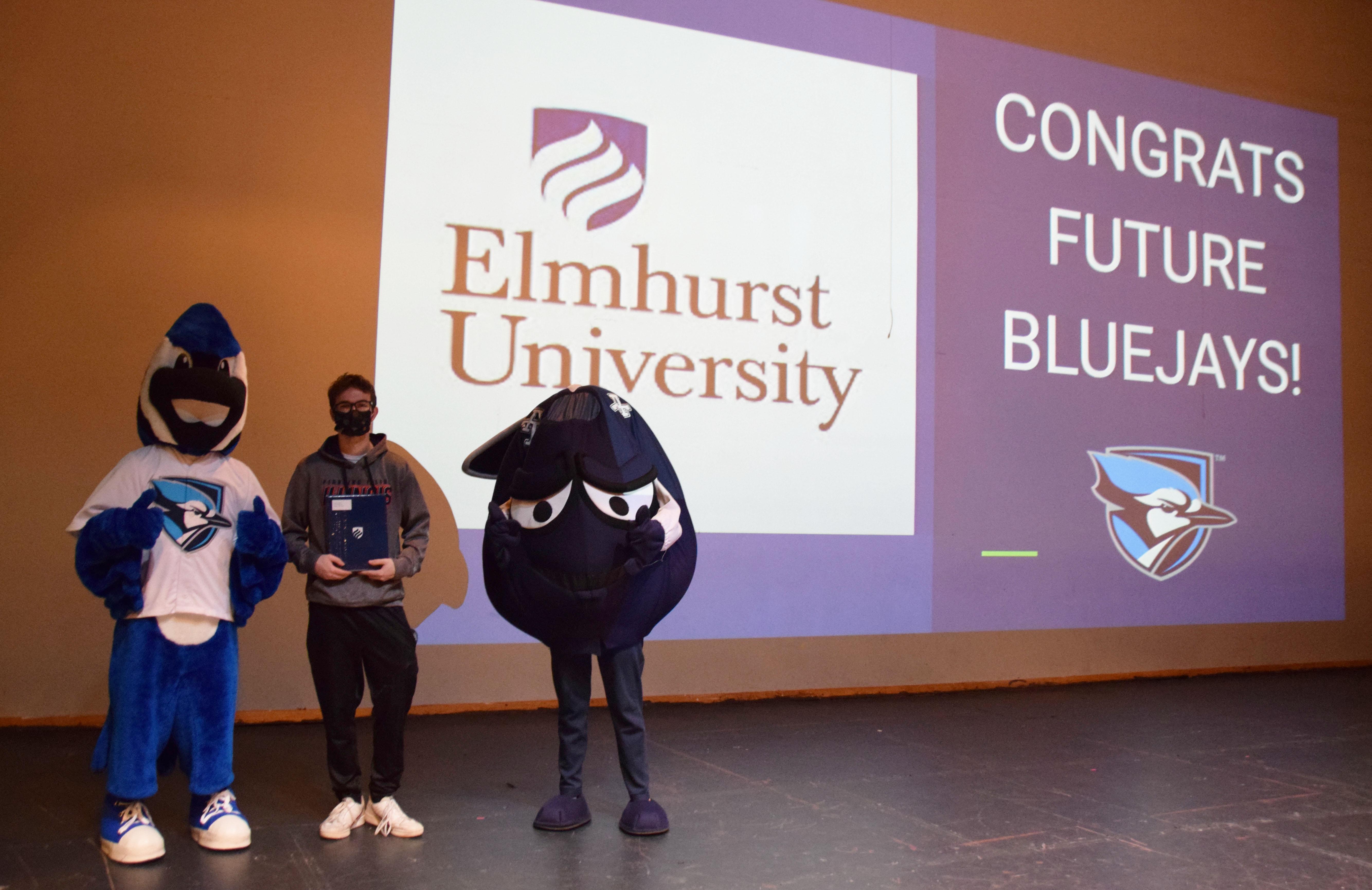 The students were surprised with the announcement and a visit from Elmhurst University Senior Director of First-Year and International Admission Christine Grenier, Associate Director of First-Year Admission Megan Wajda, Victor E. Bluejay (Elmhurst University’s mascot) and Bucky Blazer (Addison Trail’s mascot). Grenier, Wajda and Addison Trail Guidance Counselor Shane Cole congratulated the seniors on being admitted to the university through its Early Action program and encouraged them to continue working hard to pursue their goals. To watch the presentation, click on the video above. To view photos from the event, see the gallery below.