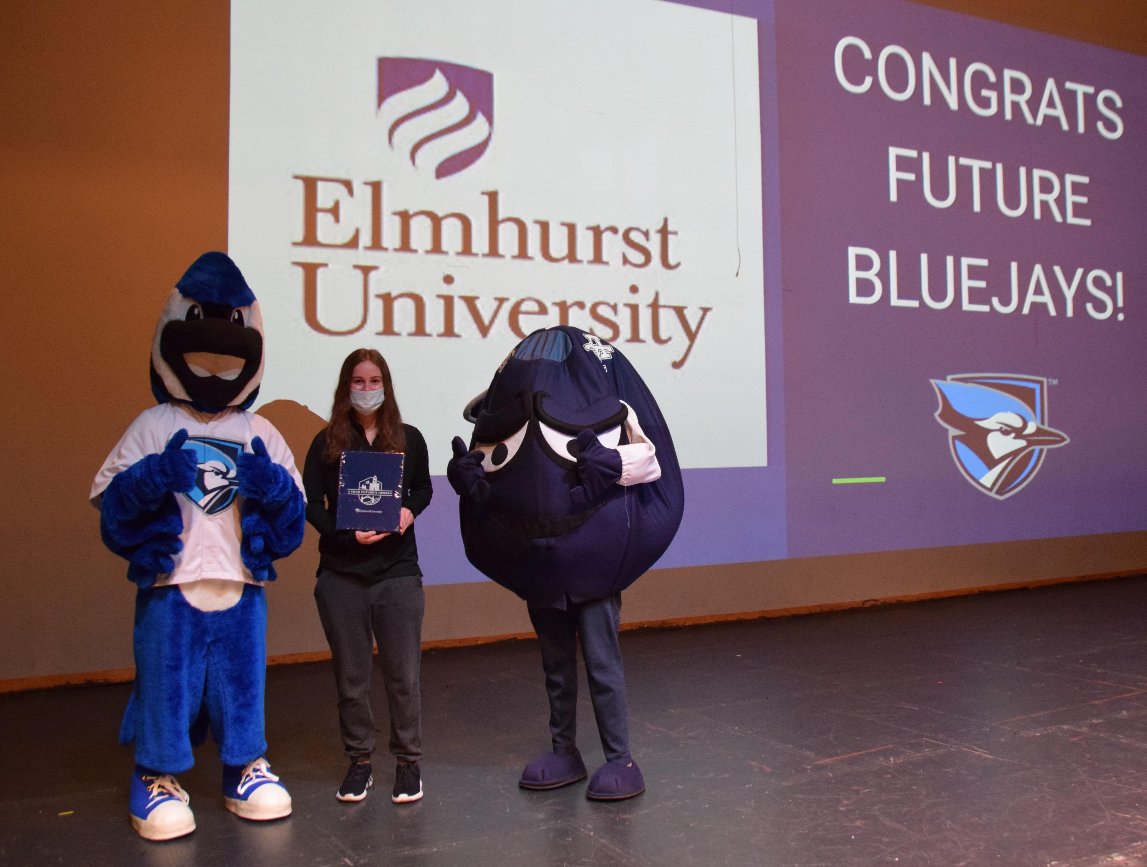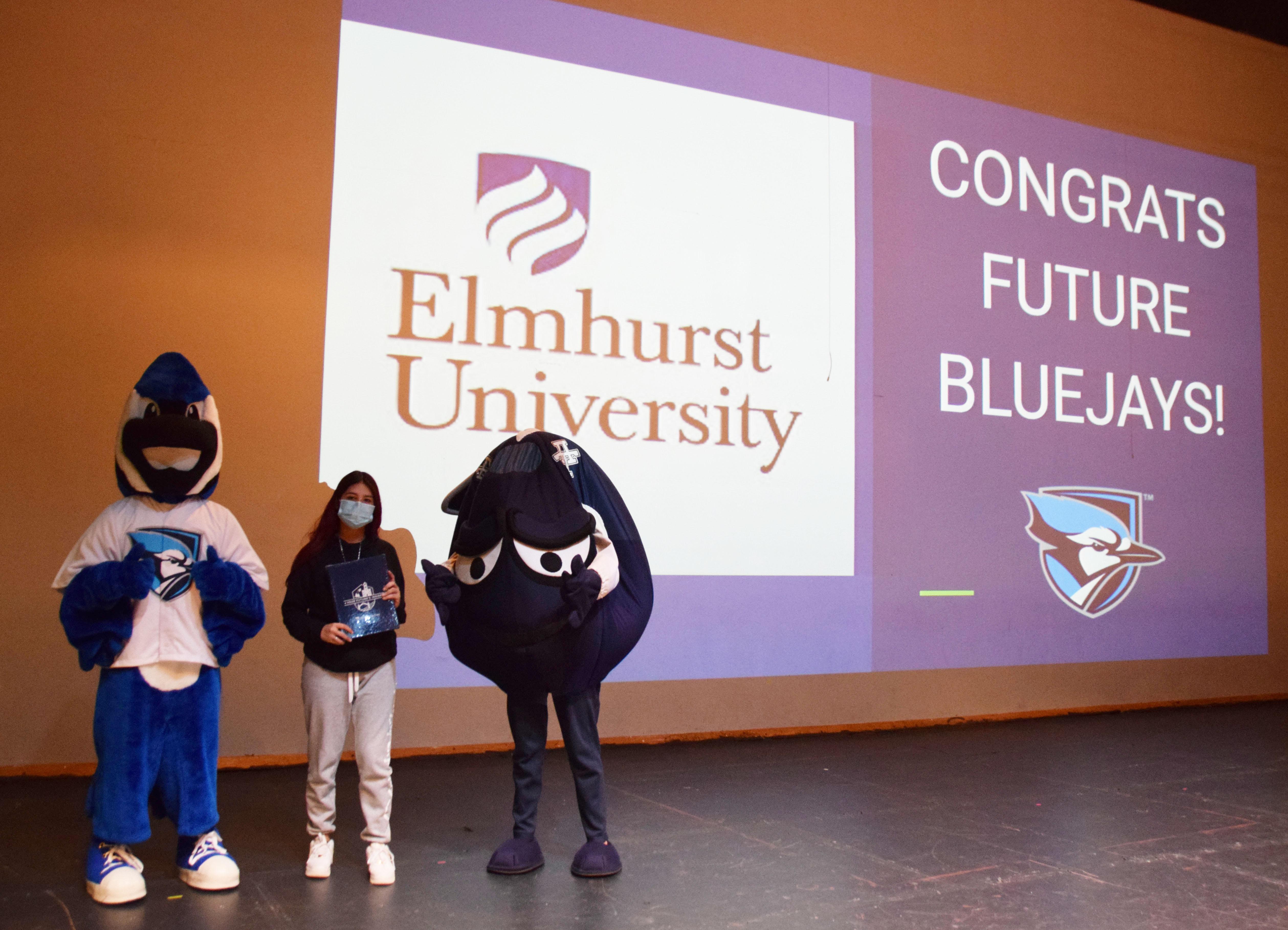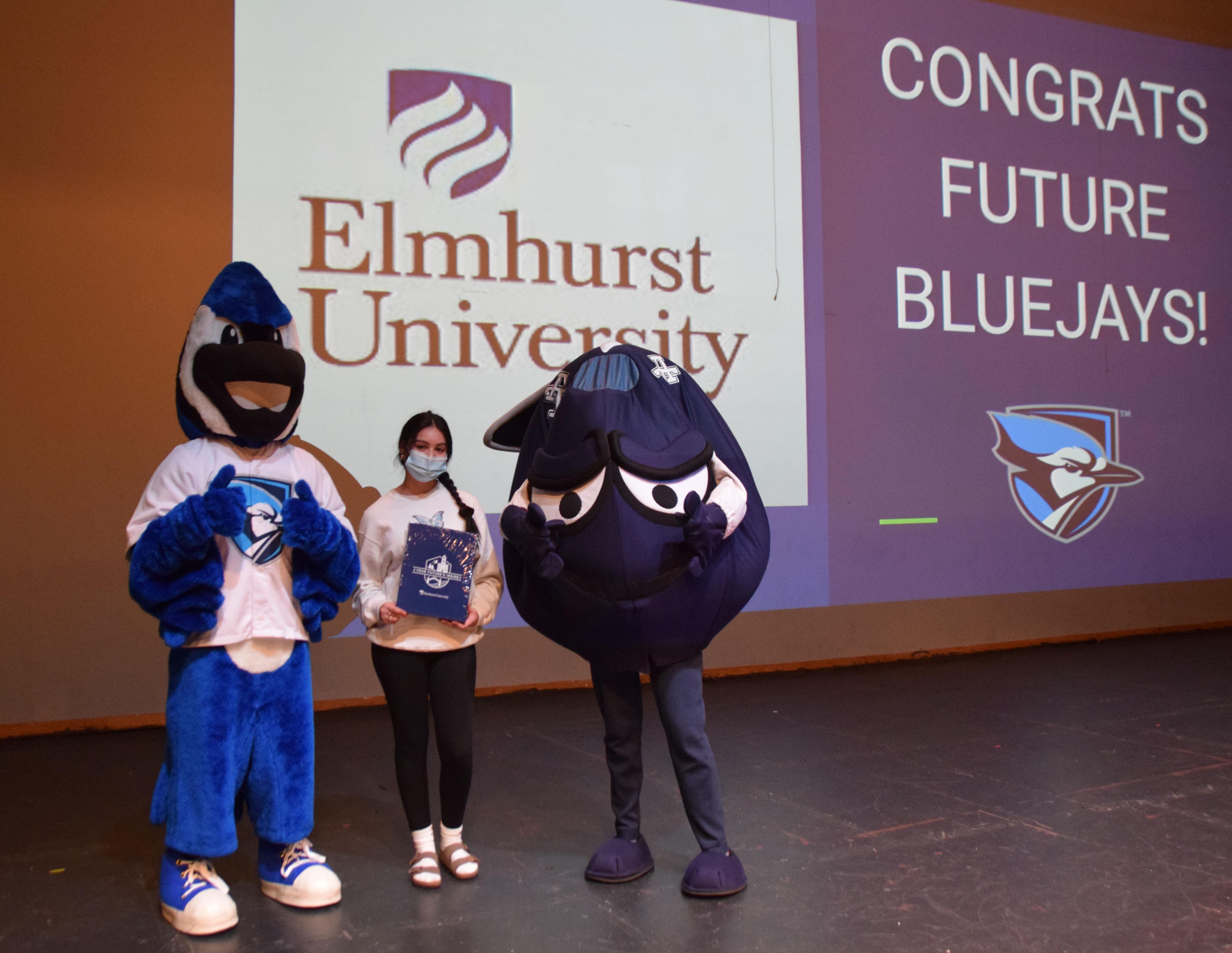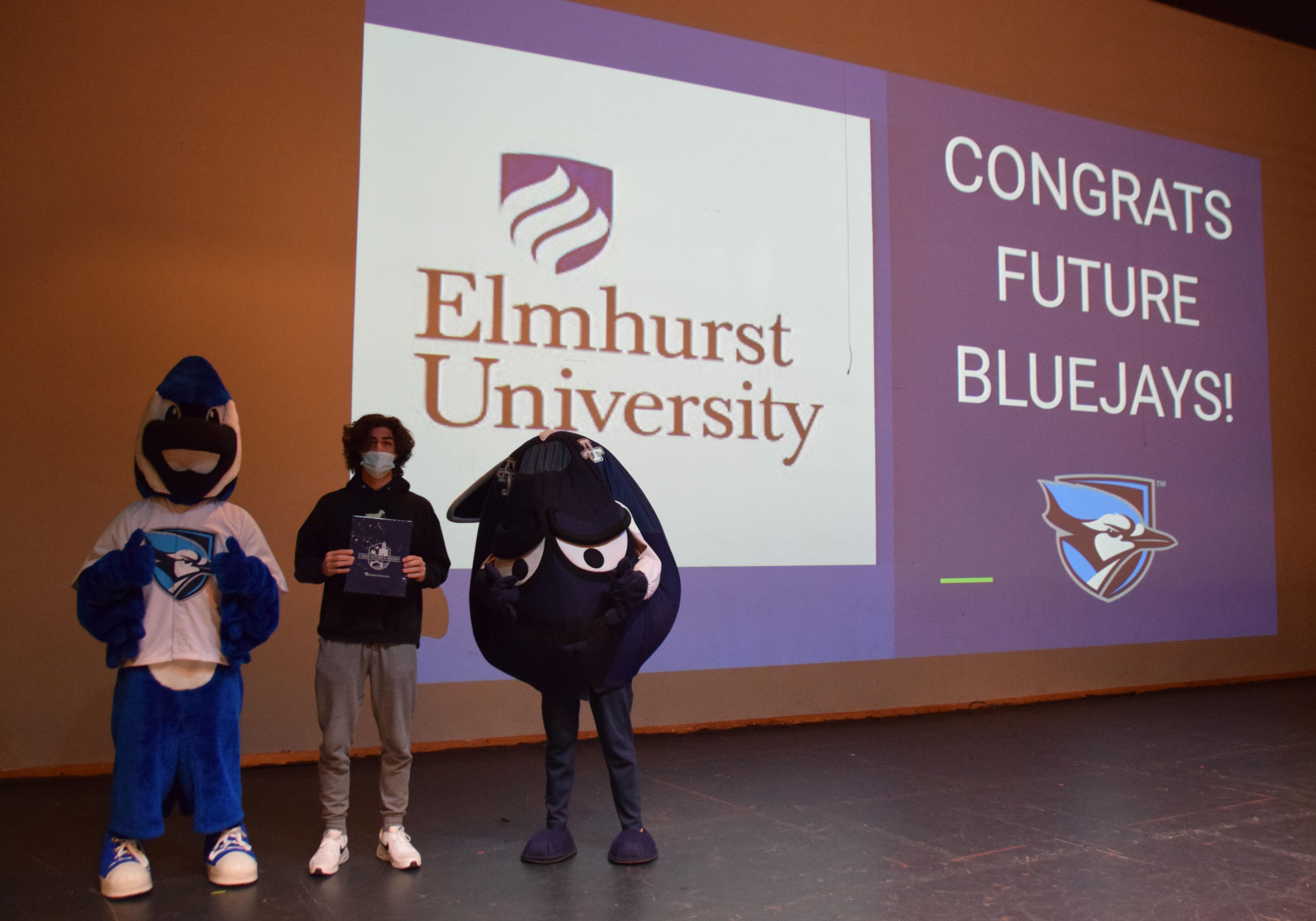 The students were surprised with the announcement and a visit from Elmhurst University Senior Director of First-Year and International Admission Christine Grenier, Associate Director of First-Year Admission Megan Wajda, Victor E. Bluejay (Elmhurst University’s mascot) and Bucky Blazer (Addison Trail’s mascot). Grenier, Wajda and Addison Trail Guidance Counselor Shane Cole congratulated the seniors on being admitted to the university through its Early Action program and encouraged them to continue working hard to pursue their goals. To watch the presentation, click on the video above. To view photos from the event, see the gallery below.