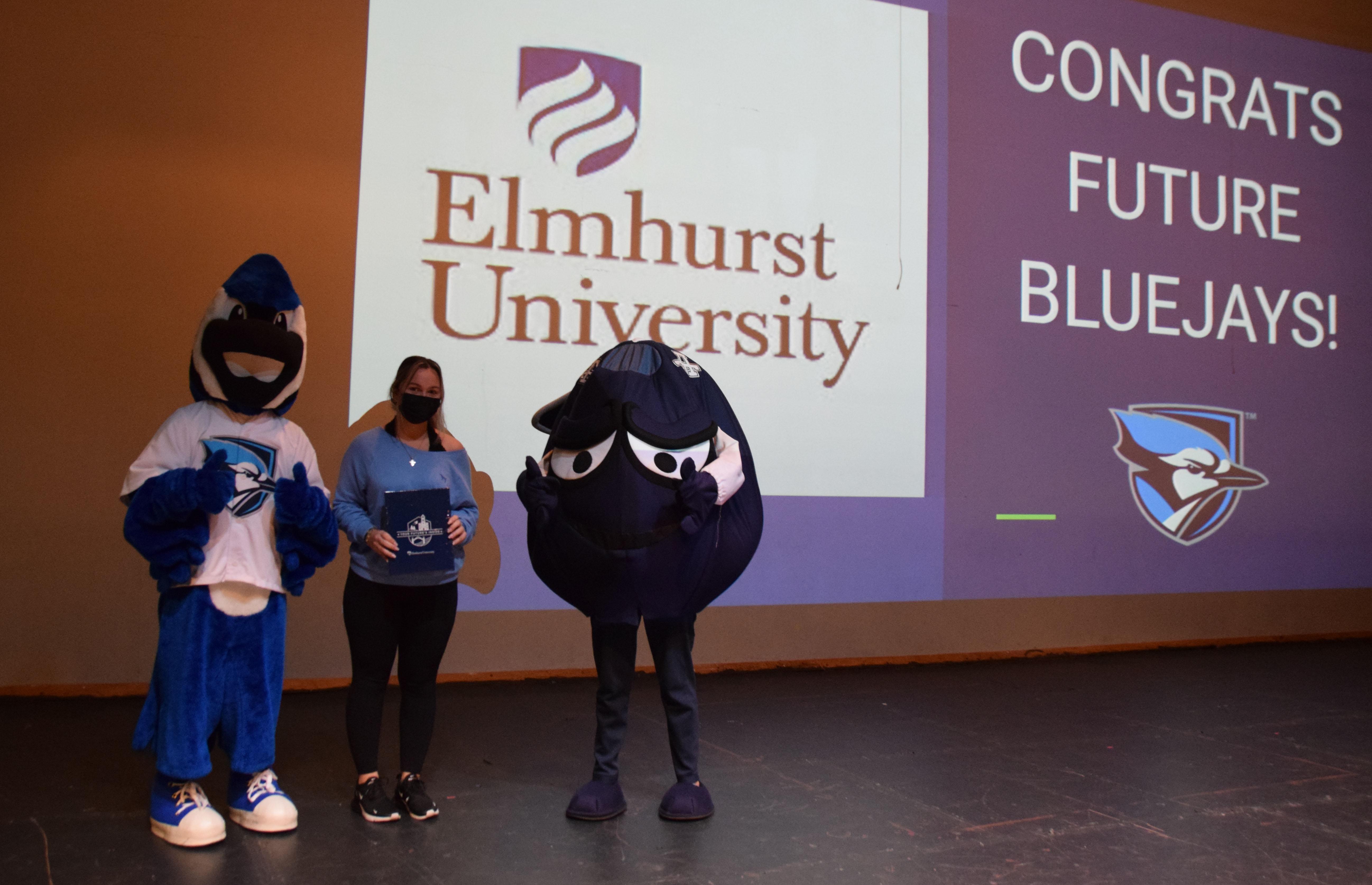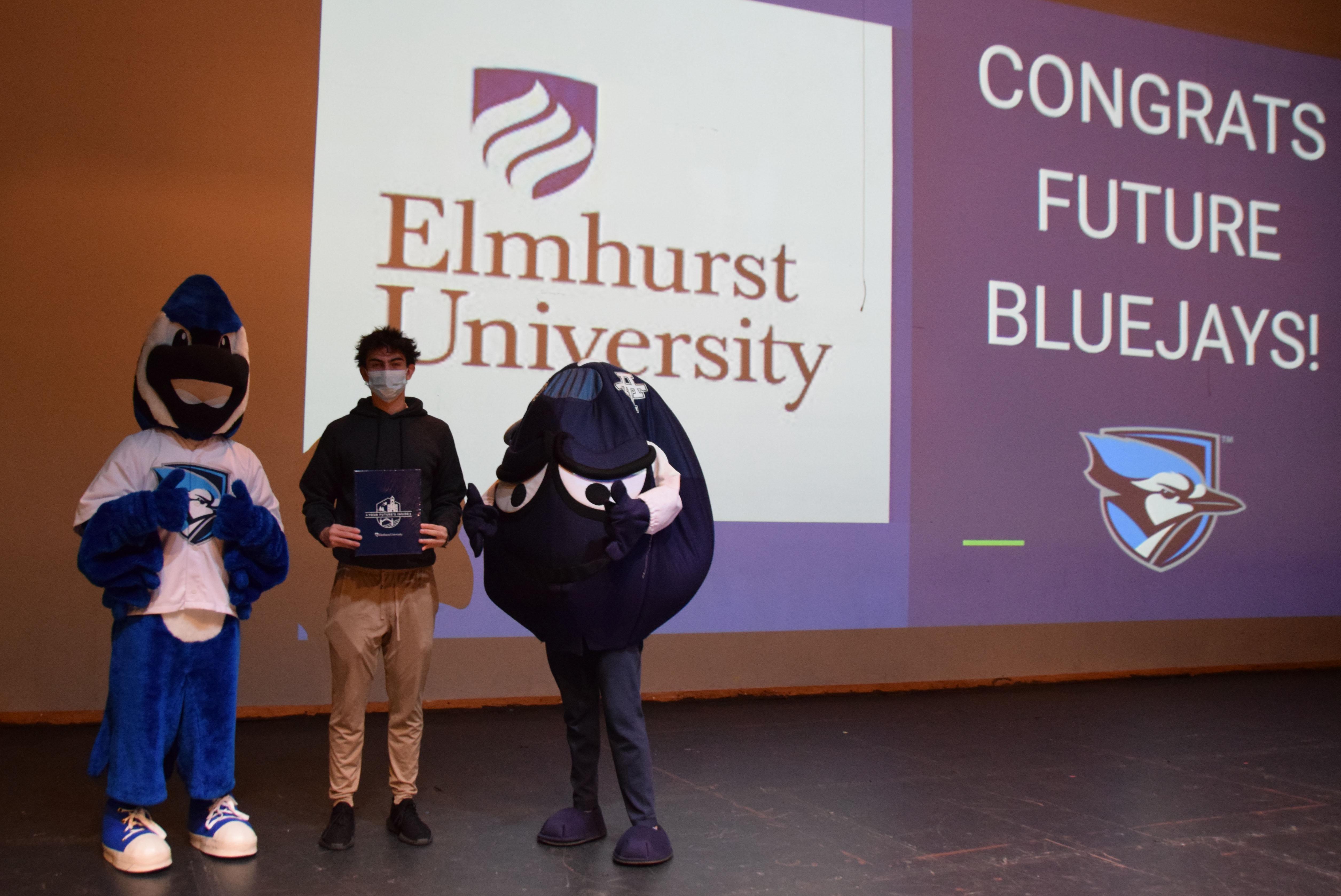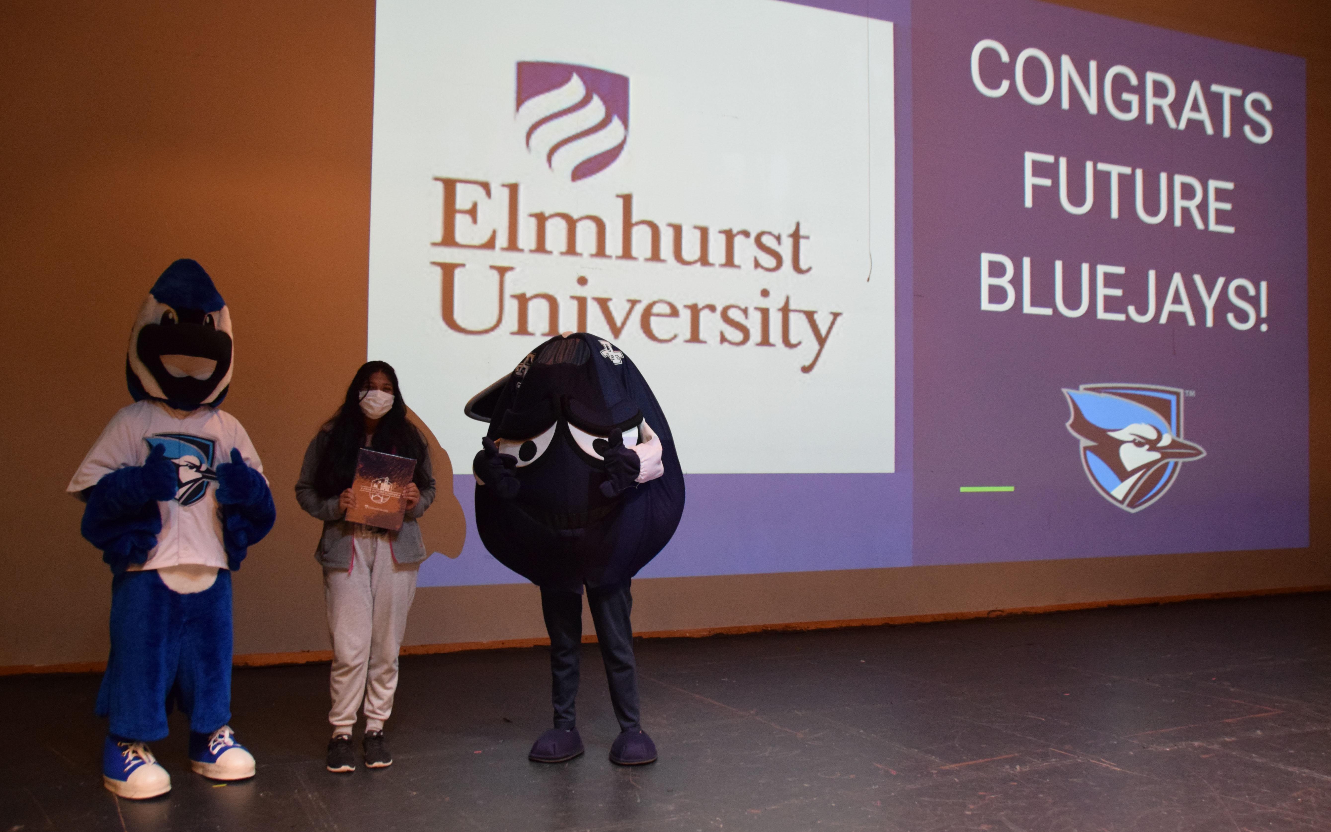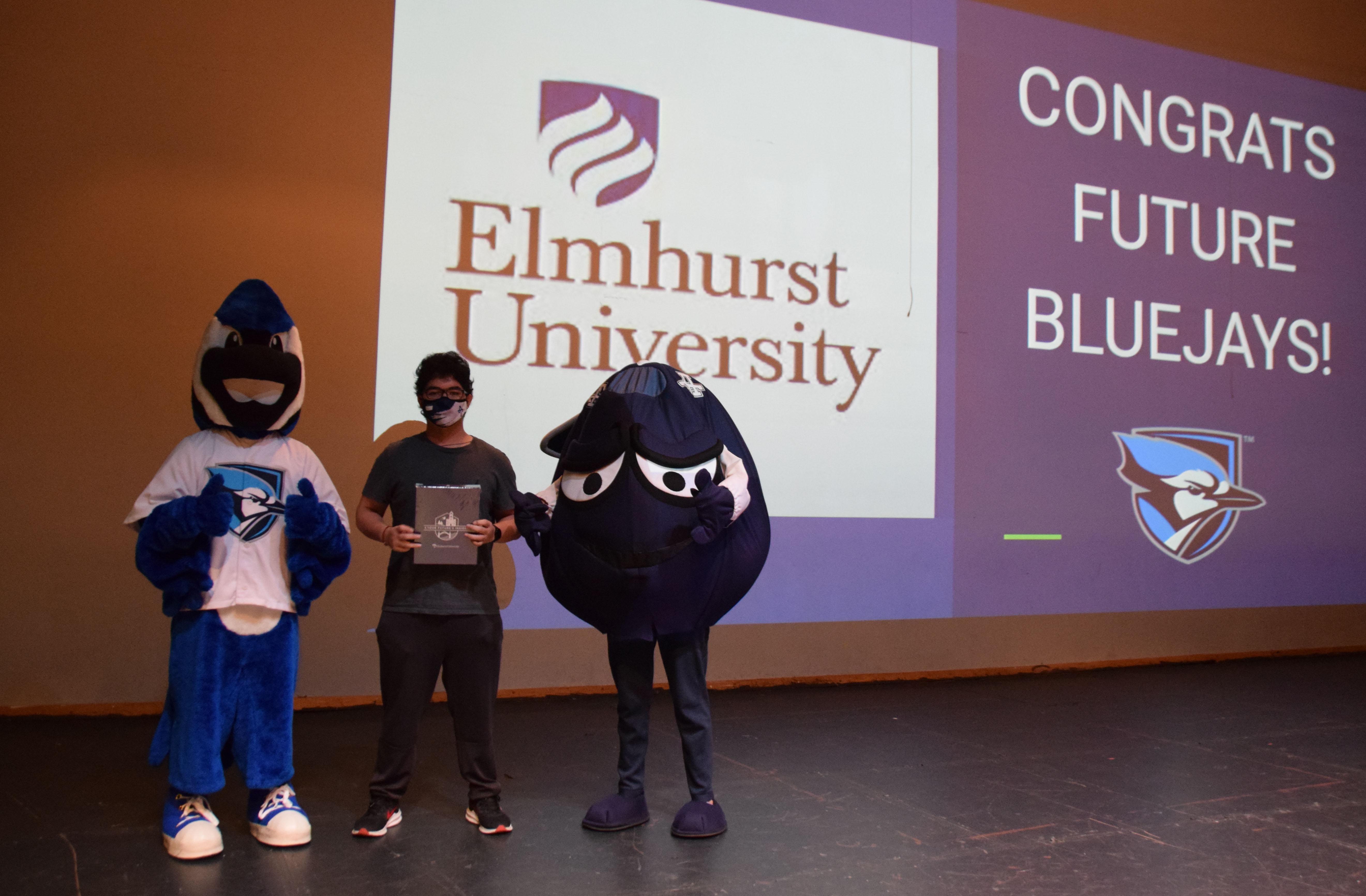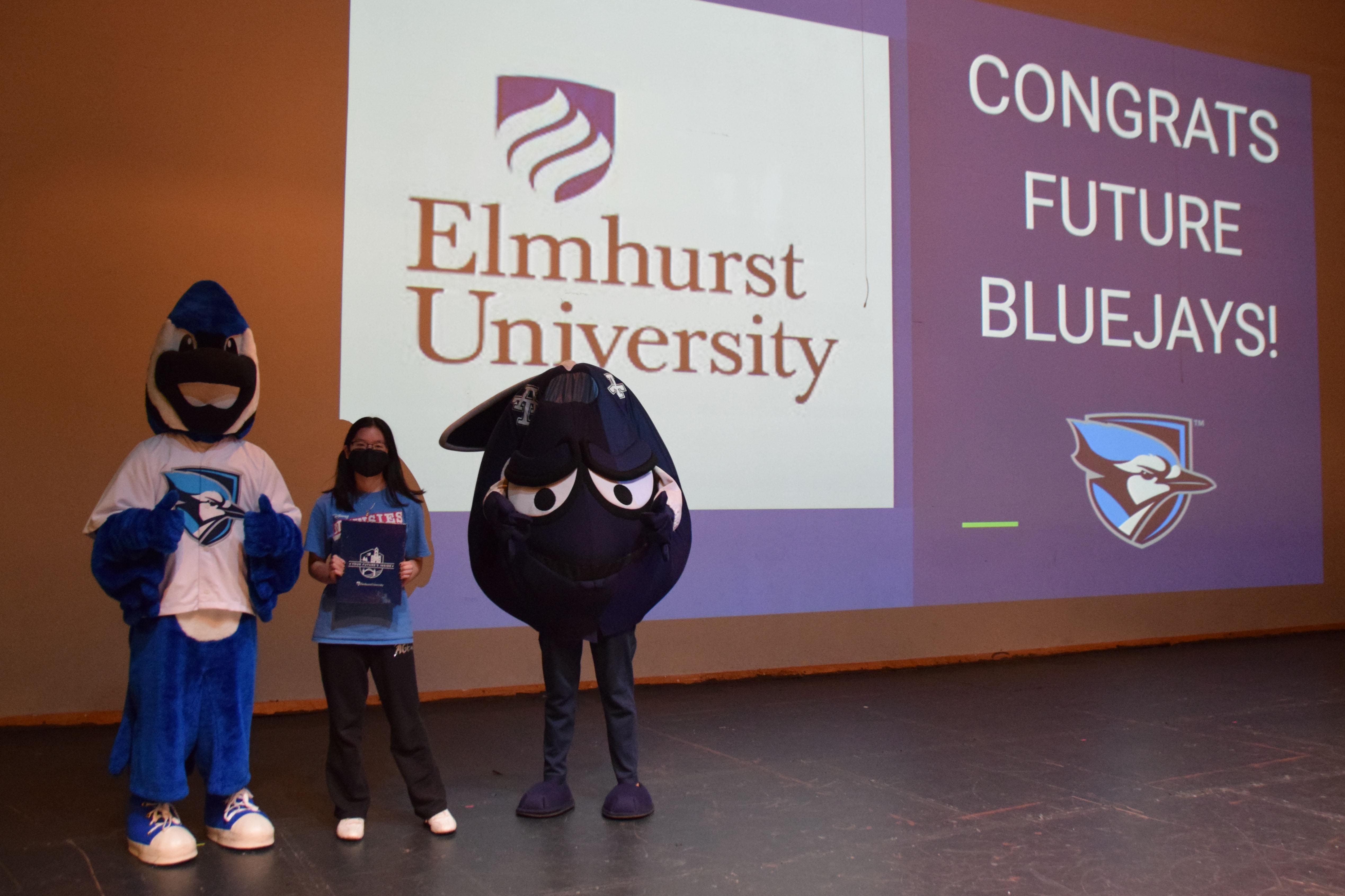 The students were surprised with the announcement and a visit from Elmhurst University Senior Director of First-Year and International Admission Christine Grenier, Associate Director of First-Year Admission Megan Wajda, Victor E. Bluejay (Elmhurst University’s mascot) and Bucky Blazer (Addison Trail’s mascot). Grenier, Wajda and Addison Trail Guidance Counselor Shane Cole congratulated the seniors on being admitted to the university through its Early Action program and encouraged them to continue working hard to pursue their goals. To watch the presentation, click on the video above. To view photos from the event, see the gallery below.