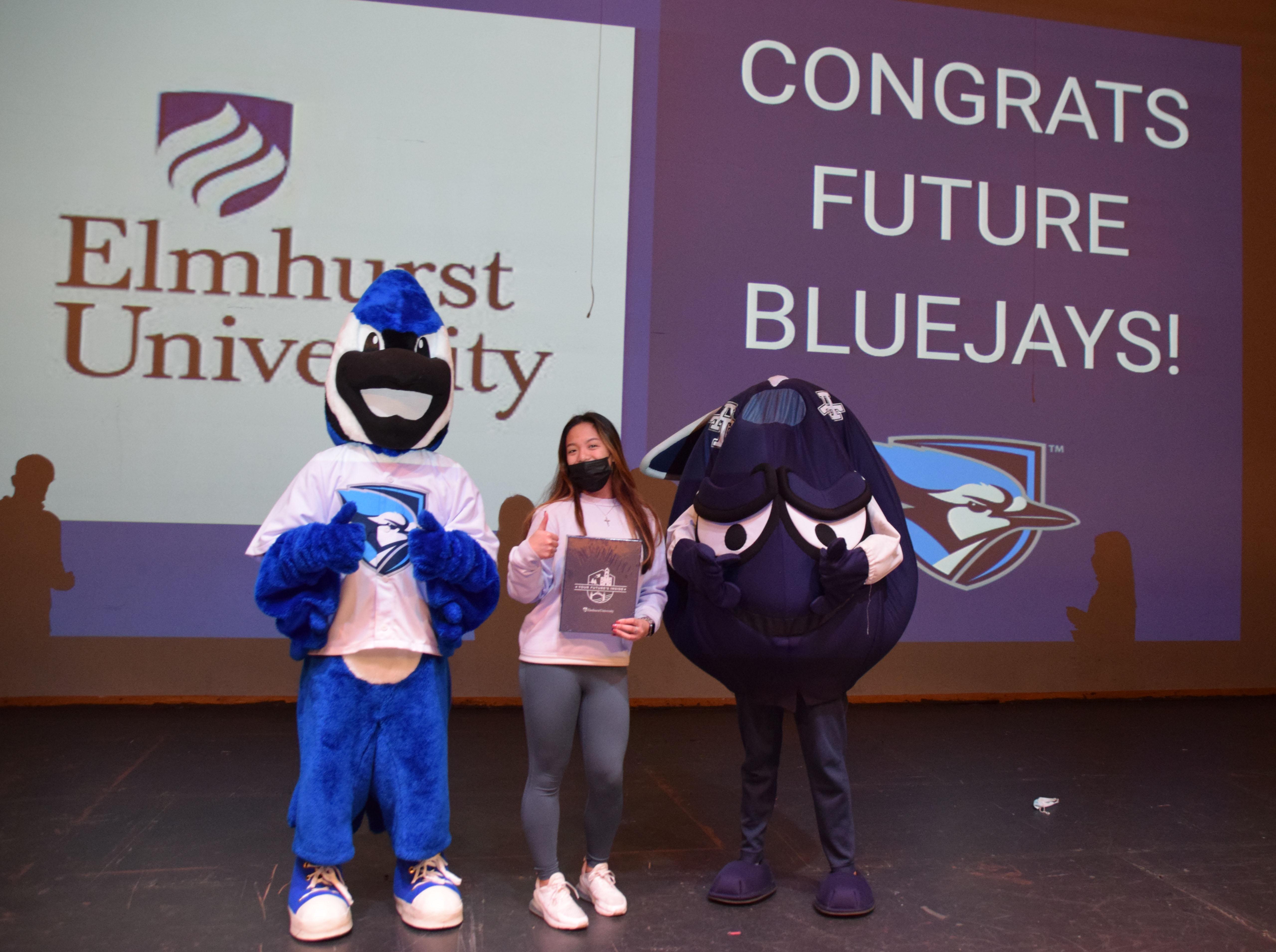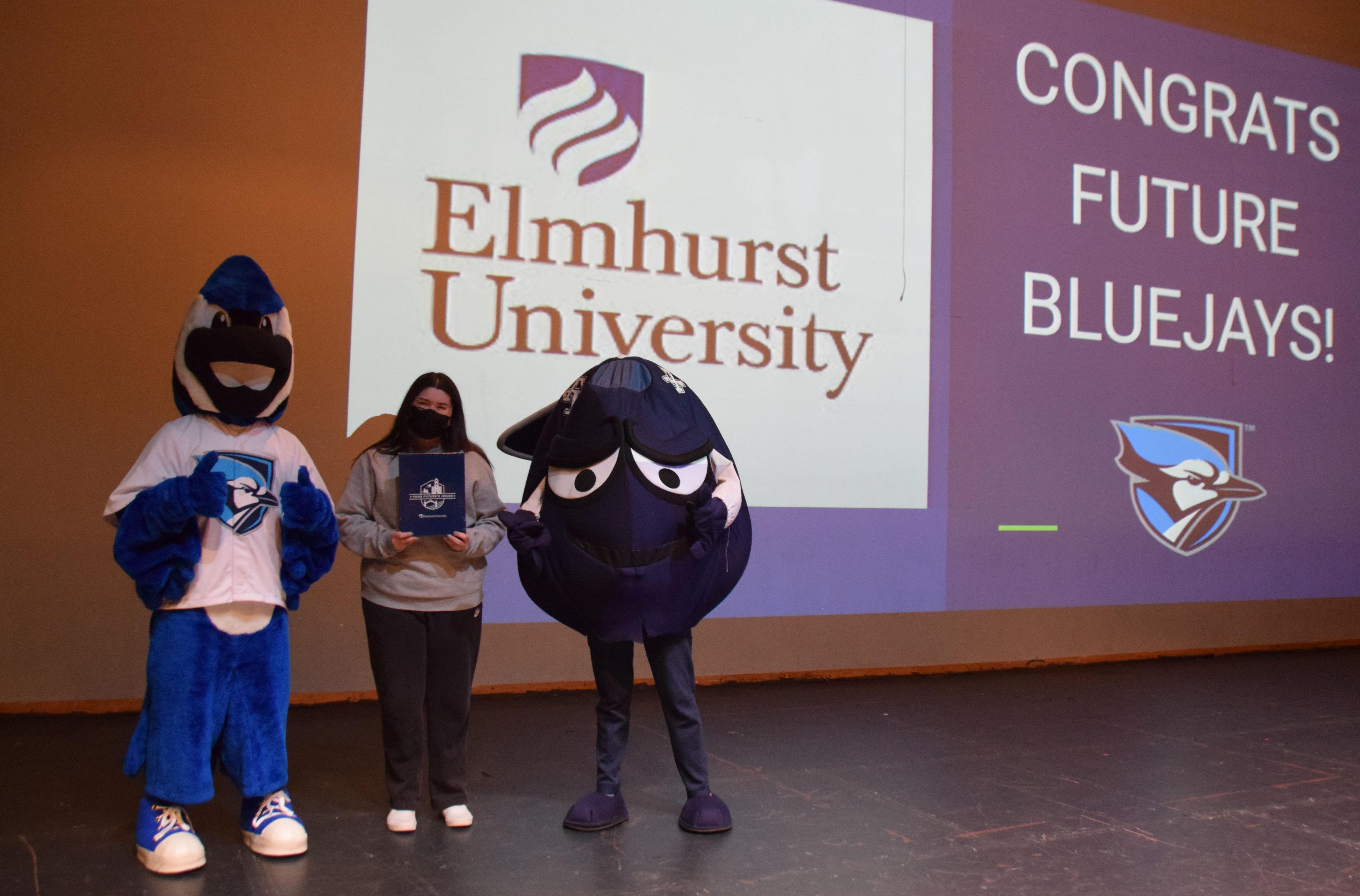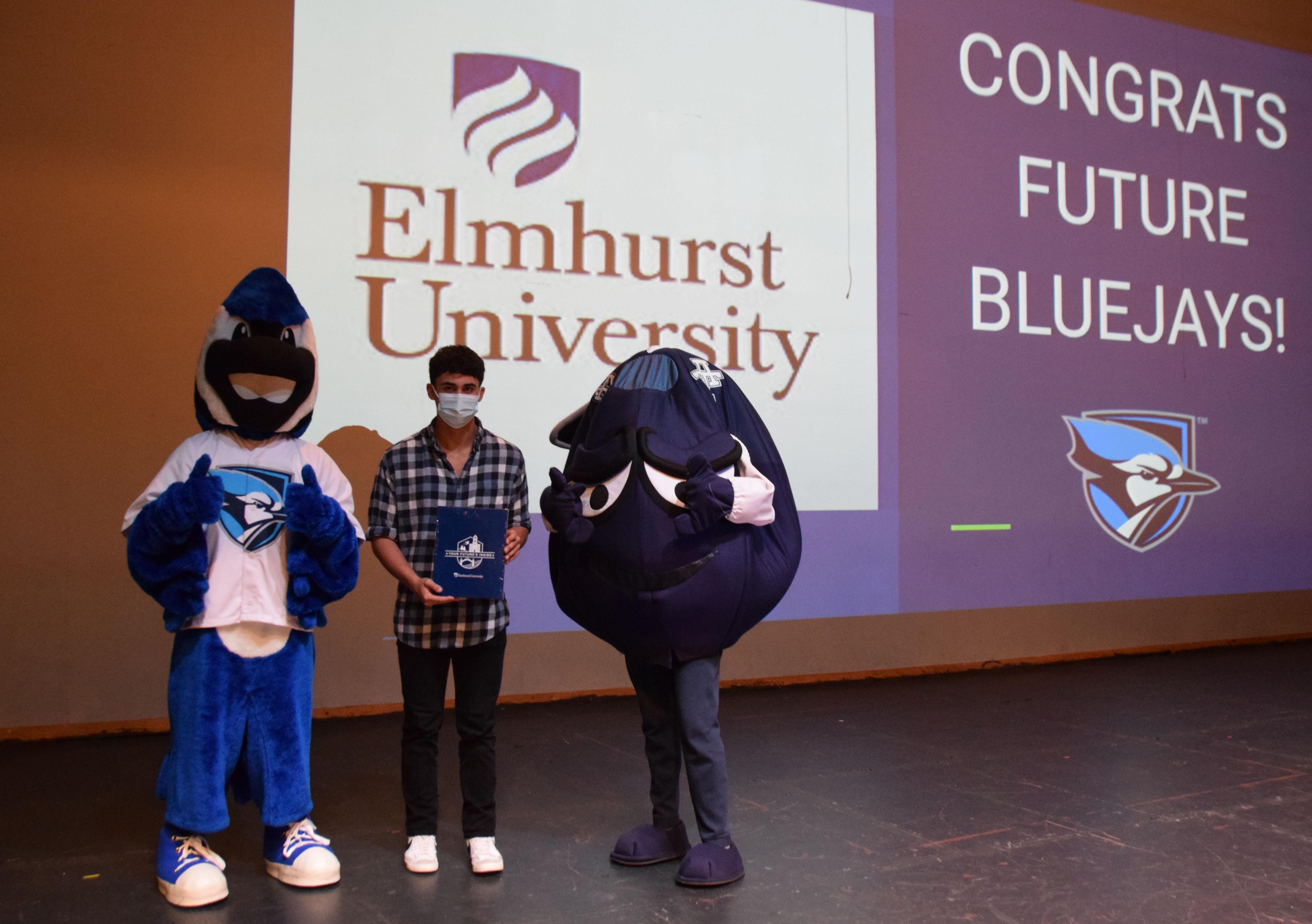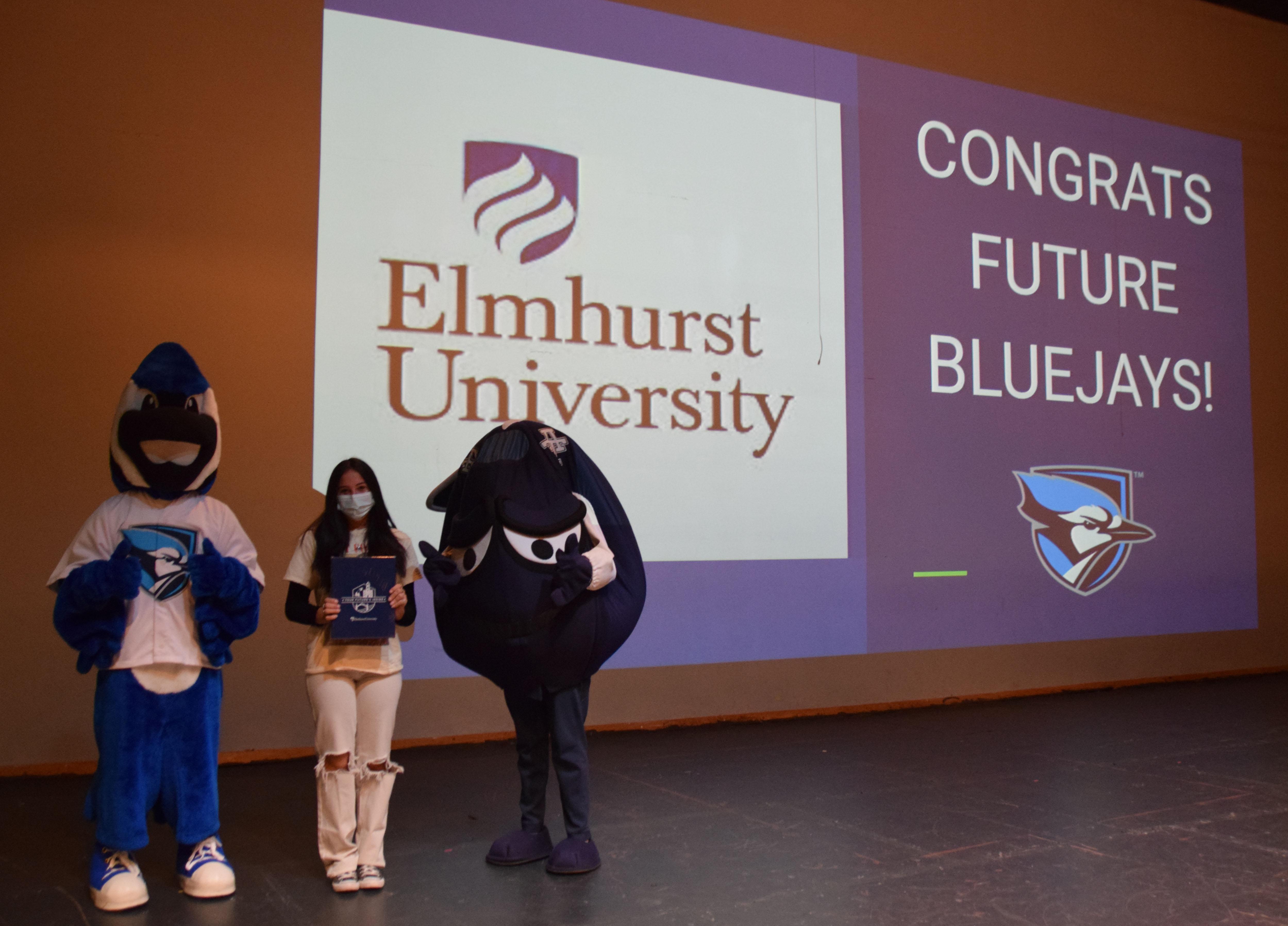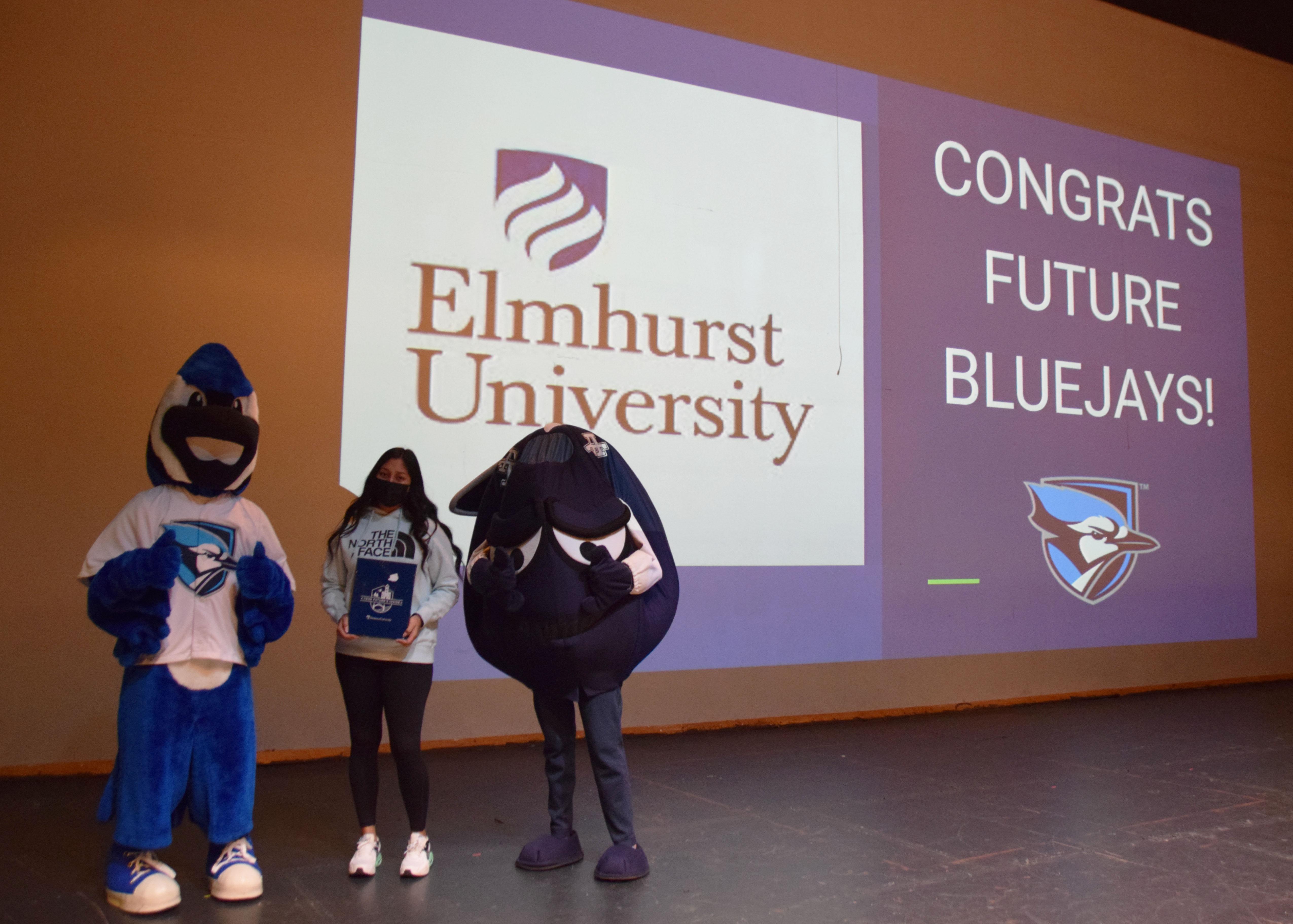 The students were surprised with the announcement and a visit from Elmhurst University Senior Director of First-Year and International Admission Christine Grenier, Associate Director of First-Year Admission Megan Wajda, Victor E. Bluejay (Elmhurst University’s mascot) and Bucky Blazer (Addison Trail’s mascot). Grenier, Wajda and Addison Trail Guidance Counselor Shane Cole congratulated the seniors on being admitted to the university through its Early Action program and encouraged them to continue working hard to pursue their goals. To watch the presentation, click on the video above. To view photos from the event, see the gallery below.