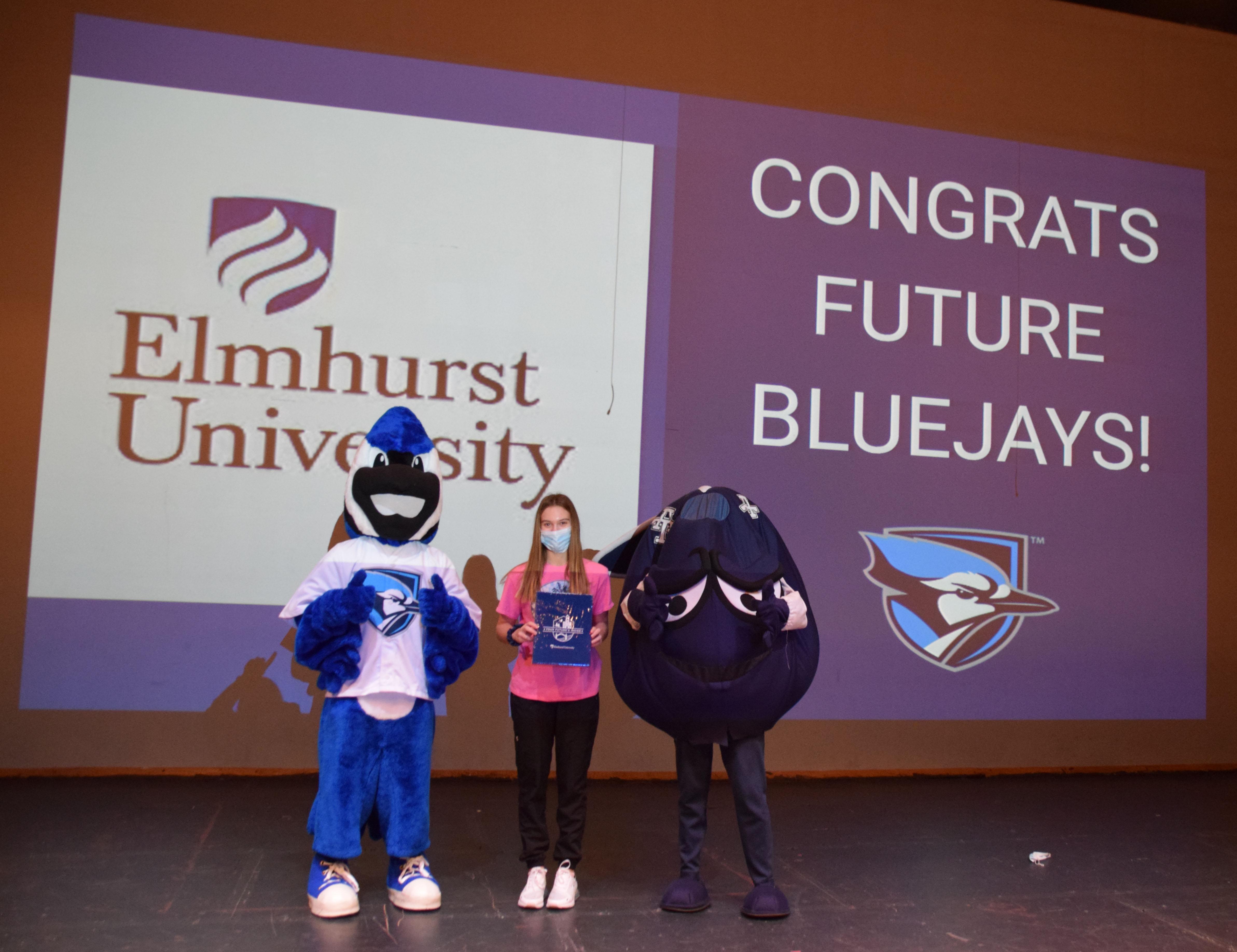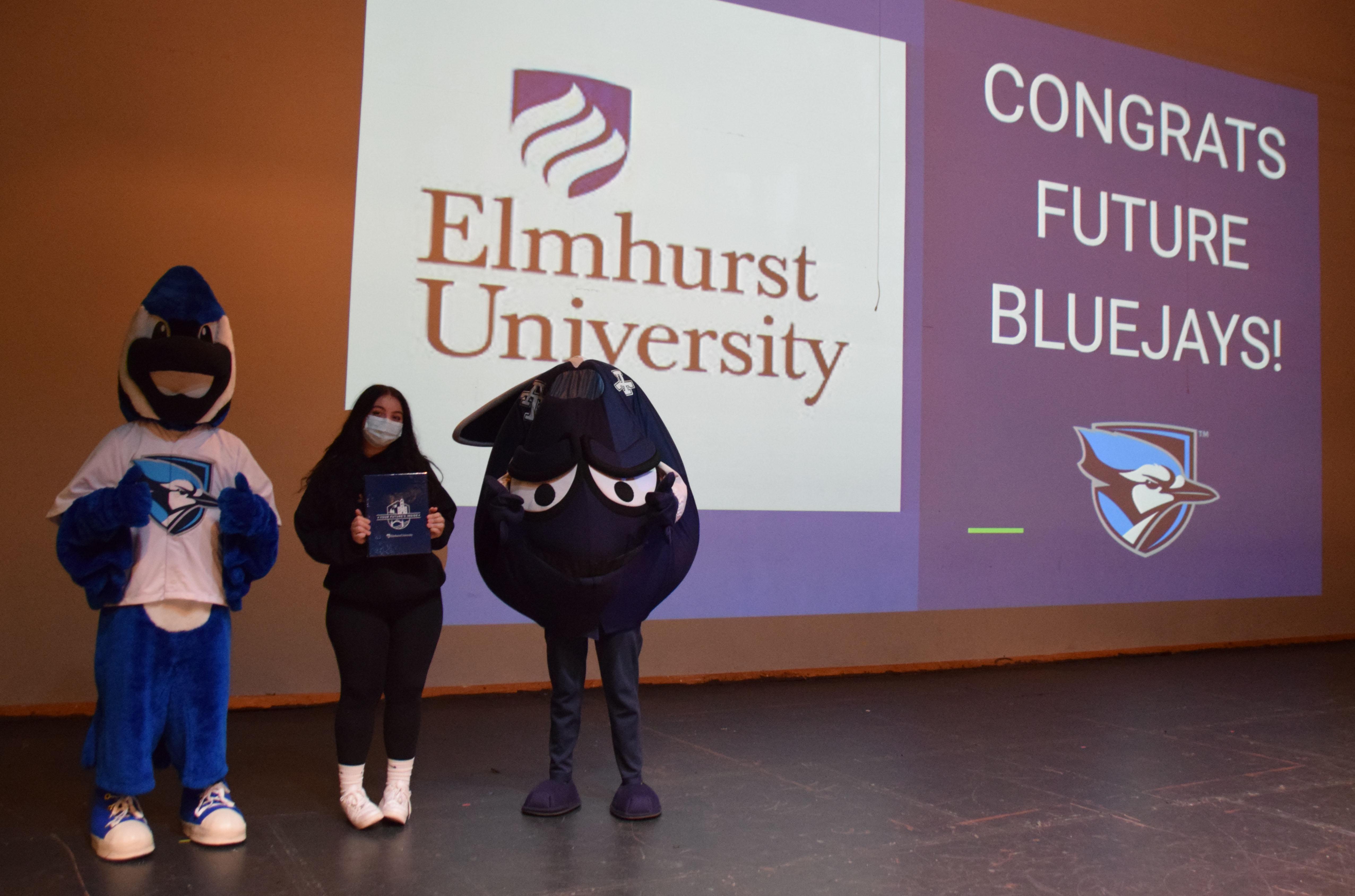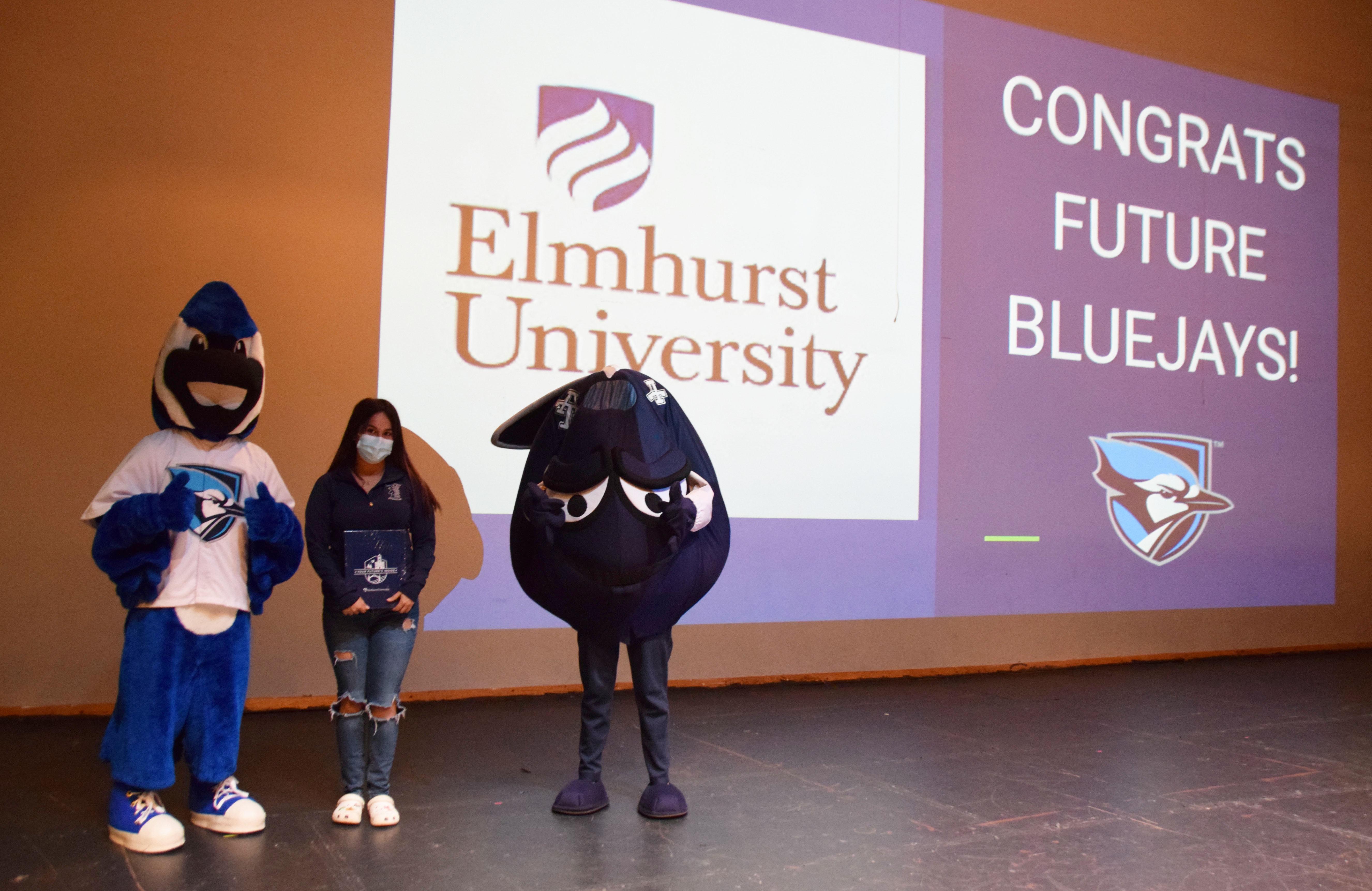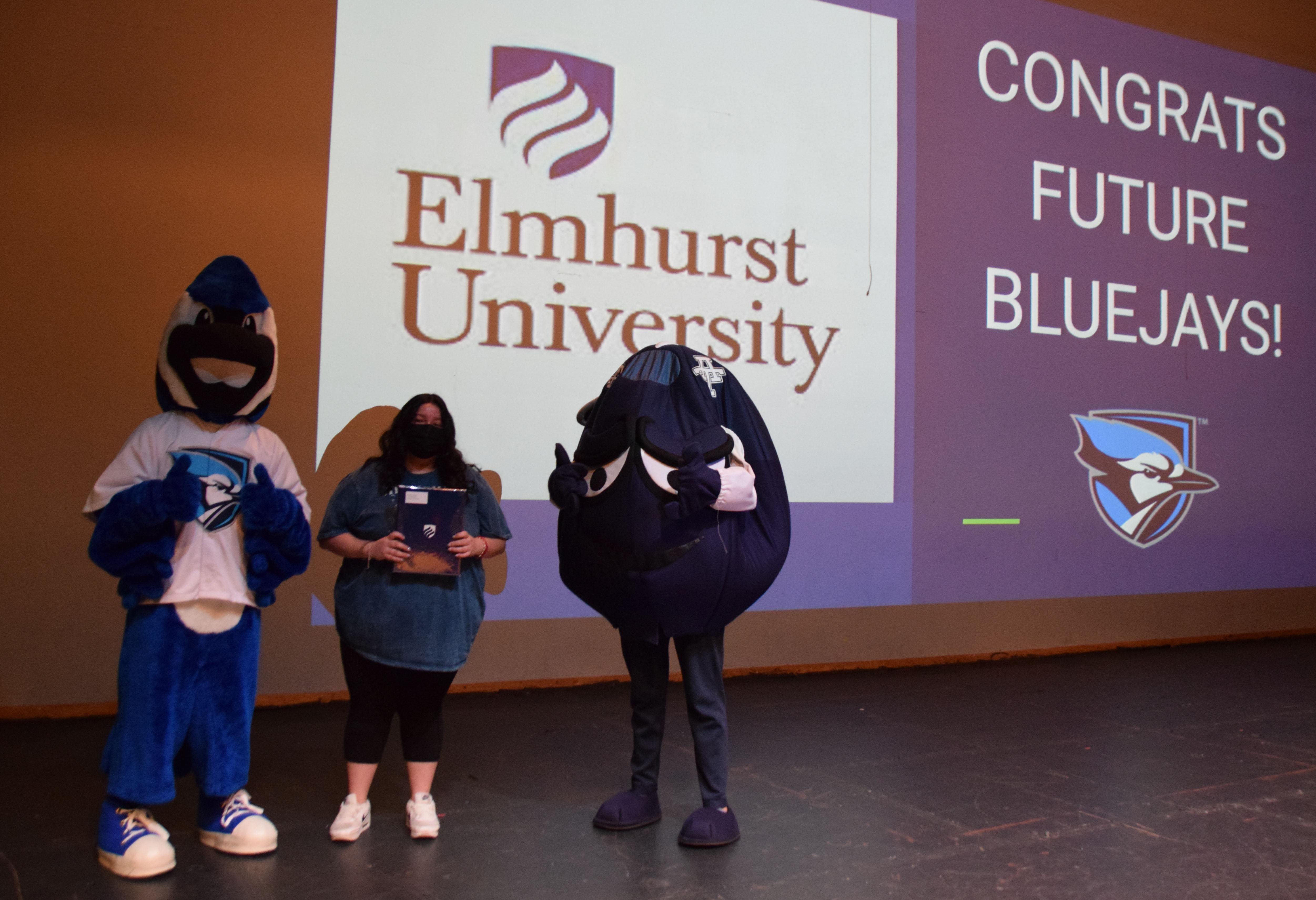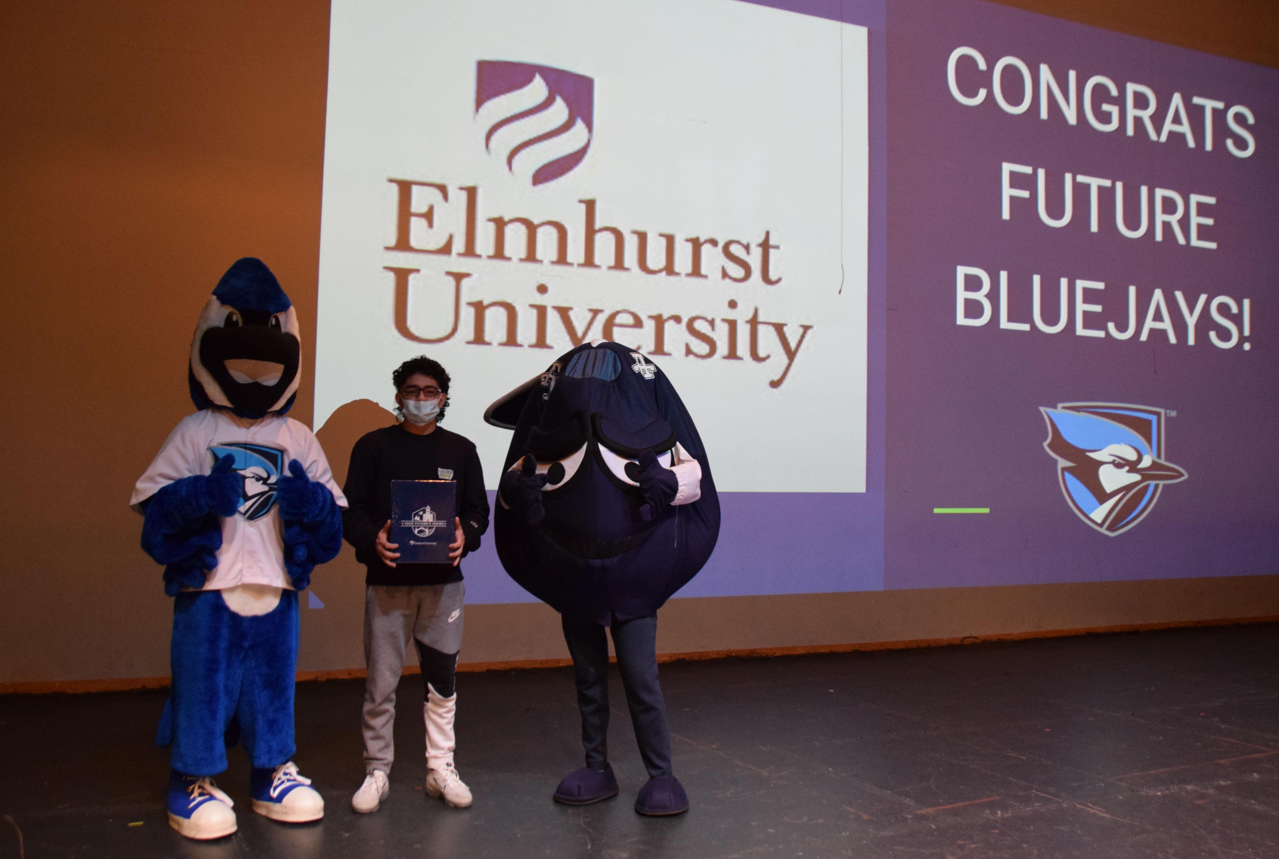 The students were surprised with the announcement and a visit from Elmhurst University Senior Director of First-Year and International Admission Christine Grenier, Associate Director of First-Year Admission Megan Wajda, Victor E. Bluejay (Elmhurst University’s mascot) and Bucky Blazer (Addison Trail’s mascot). Grenier, Wajda and Addison Trail Guidance Counselor Shane Cole congratulated the seniors on being admitted to the university through its Early Action program and encouraged them to continue working hard to pursue their goals. To watch the presentation, click on the video above. To view photos from the event, see the gallery below.