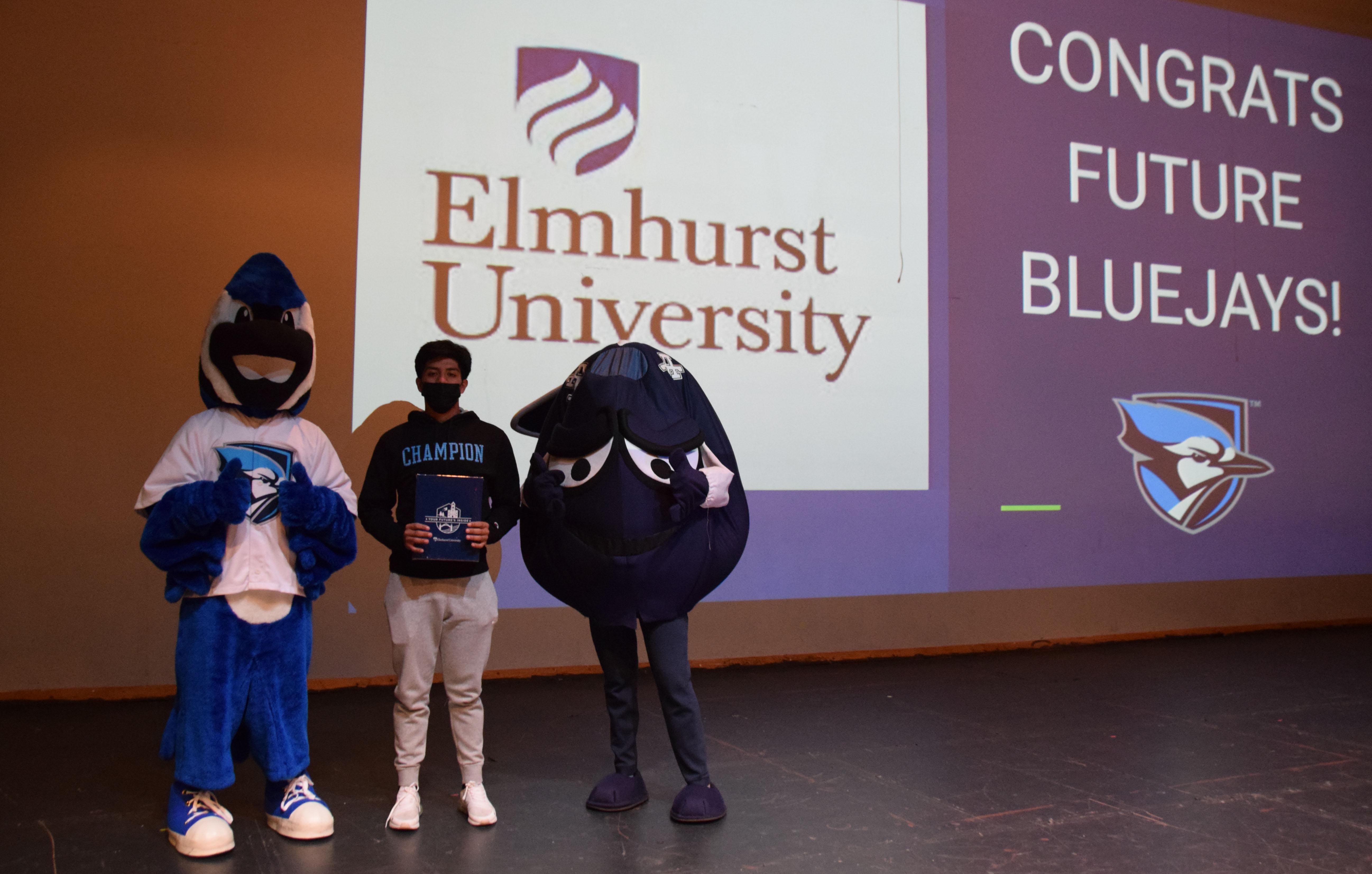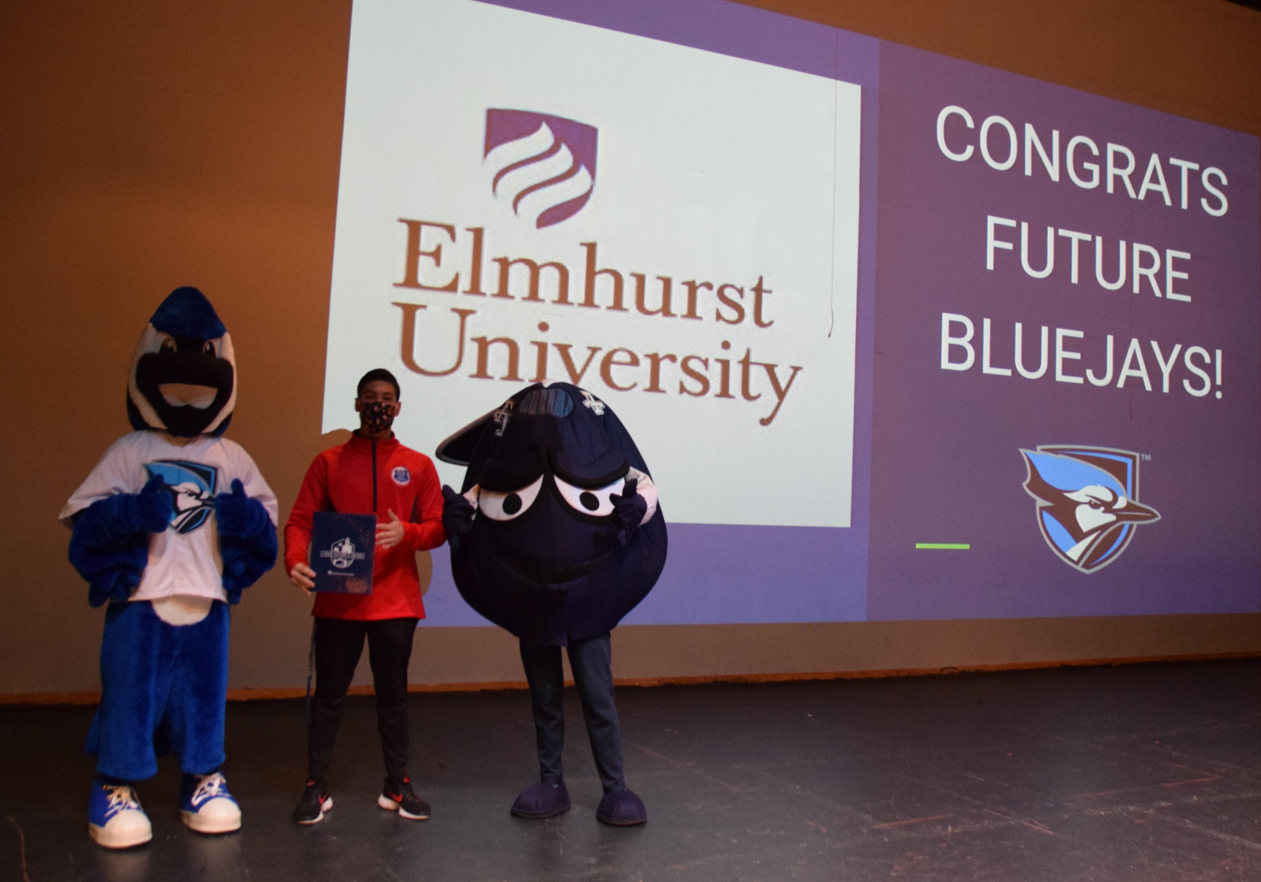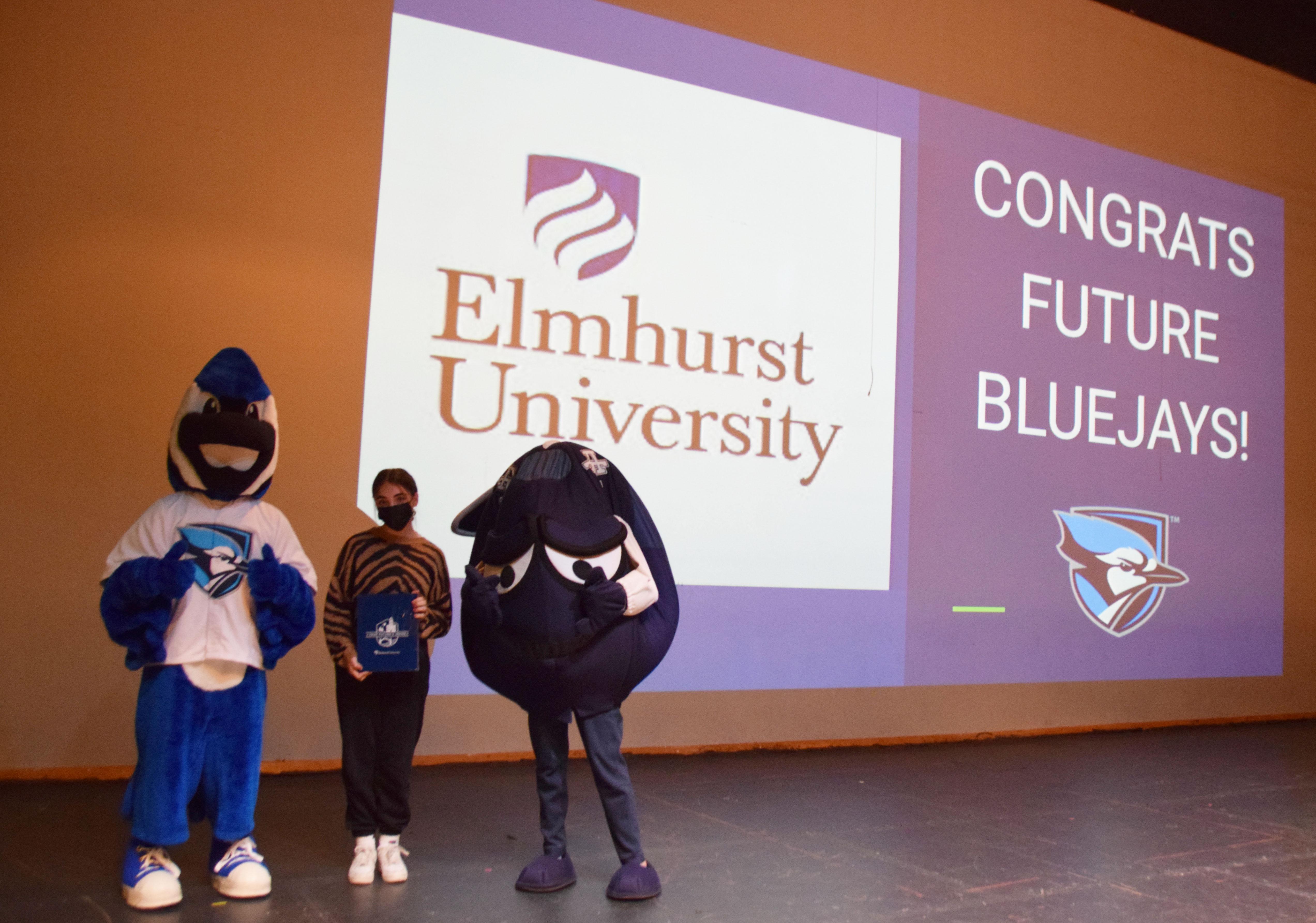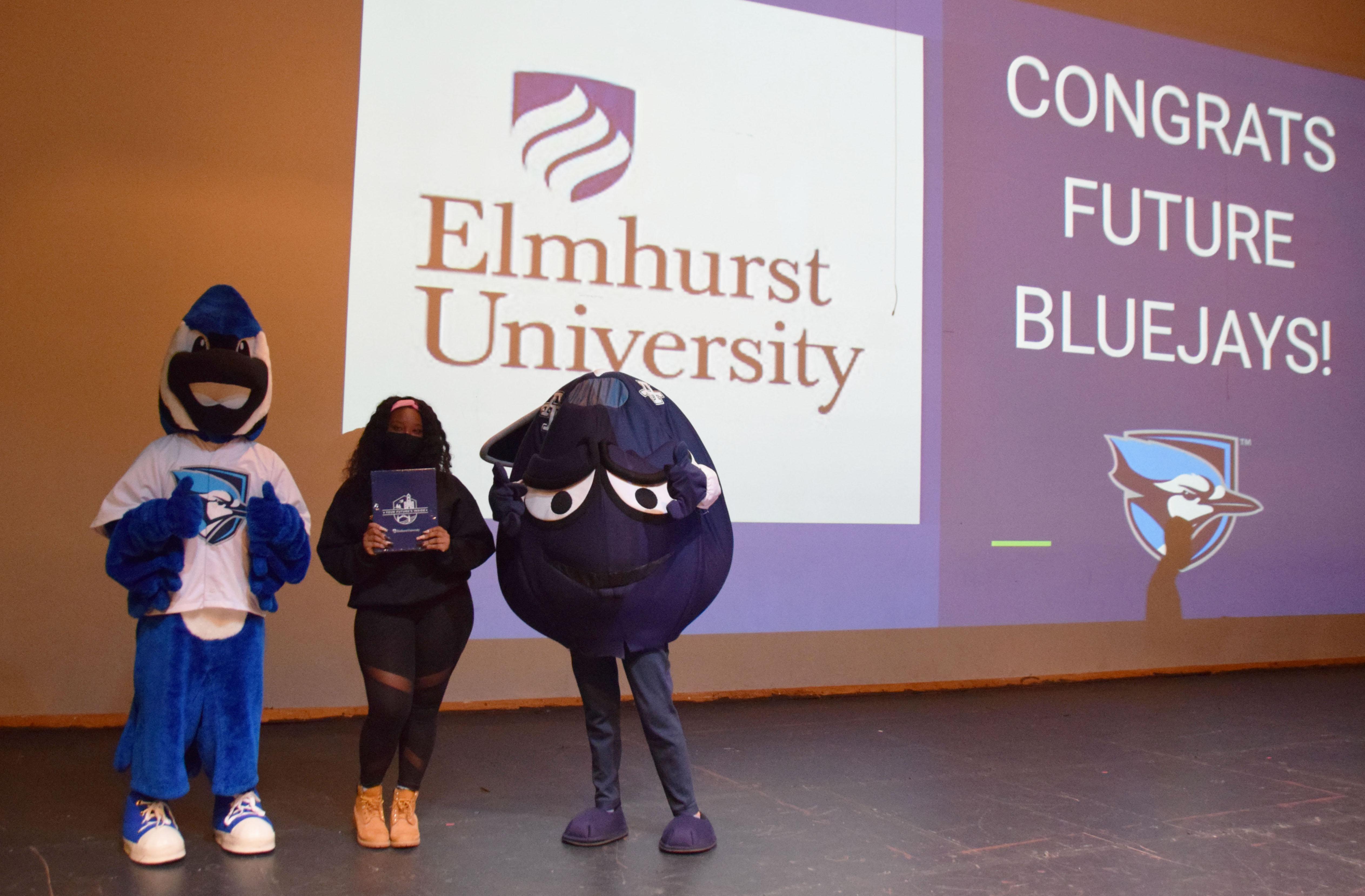 The students were surprised with the announcement and a visit from Elmhurst University Senior Director of First-Year and International Admission Christine Grenier, Associate Director of First-Year Admission Megan Wajda, Victor E. Bluejay (Elmhurst University’s mascot) and Bucky Blazer (Addison Trail’s mascot). Grenier, Wajda and Addison Trail Guidance Counselor Shane Cole congratulated the seniors on being admitted to the university through its Early Action program and encouraged them to continue working hard to pursue their goals. To watch the presentation, click on the video above. To view photos from the event, see the gallery below.