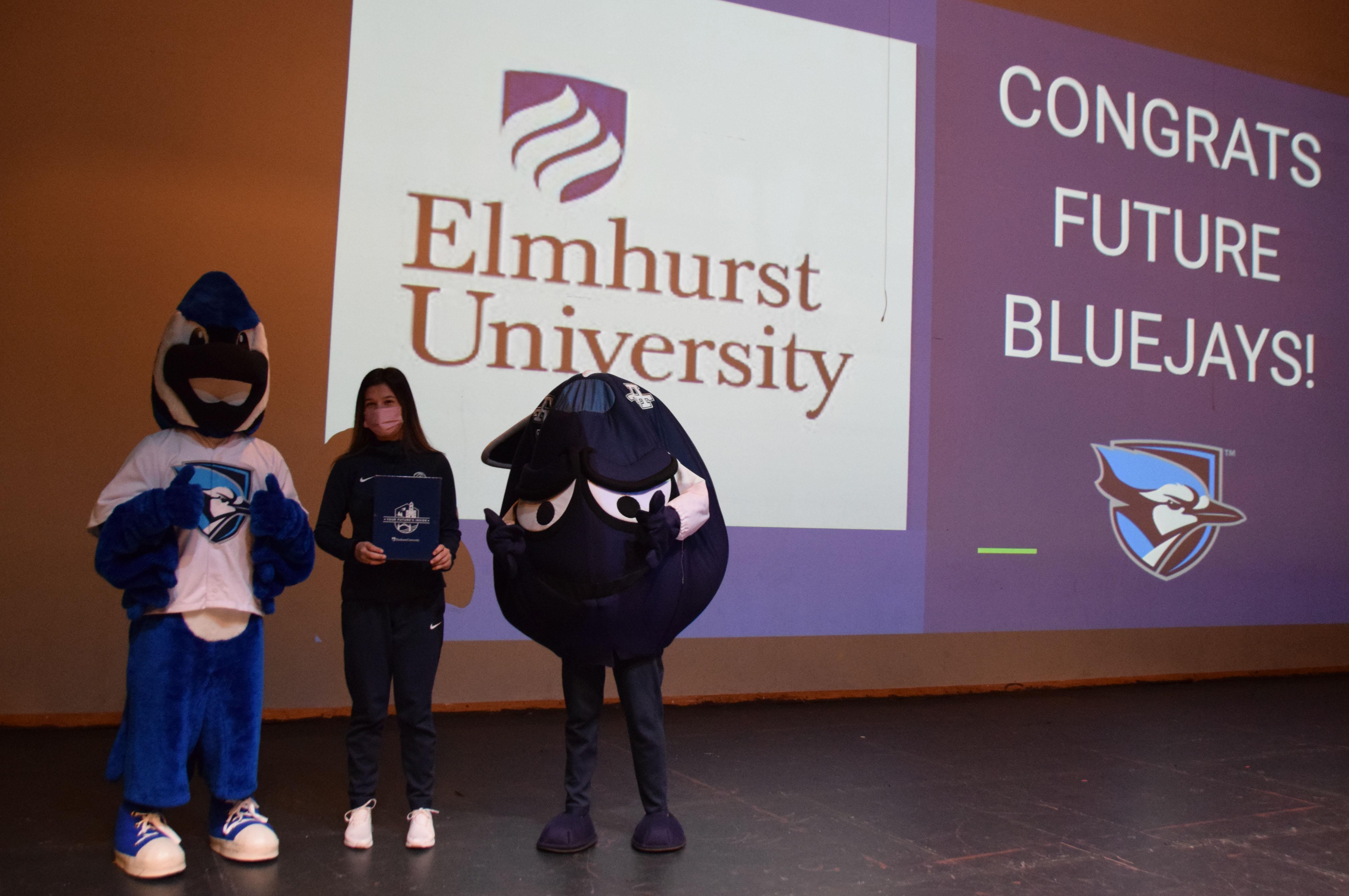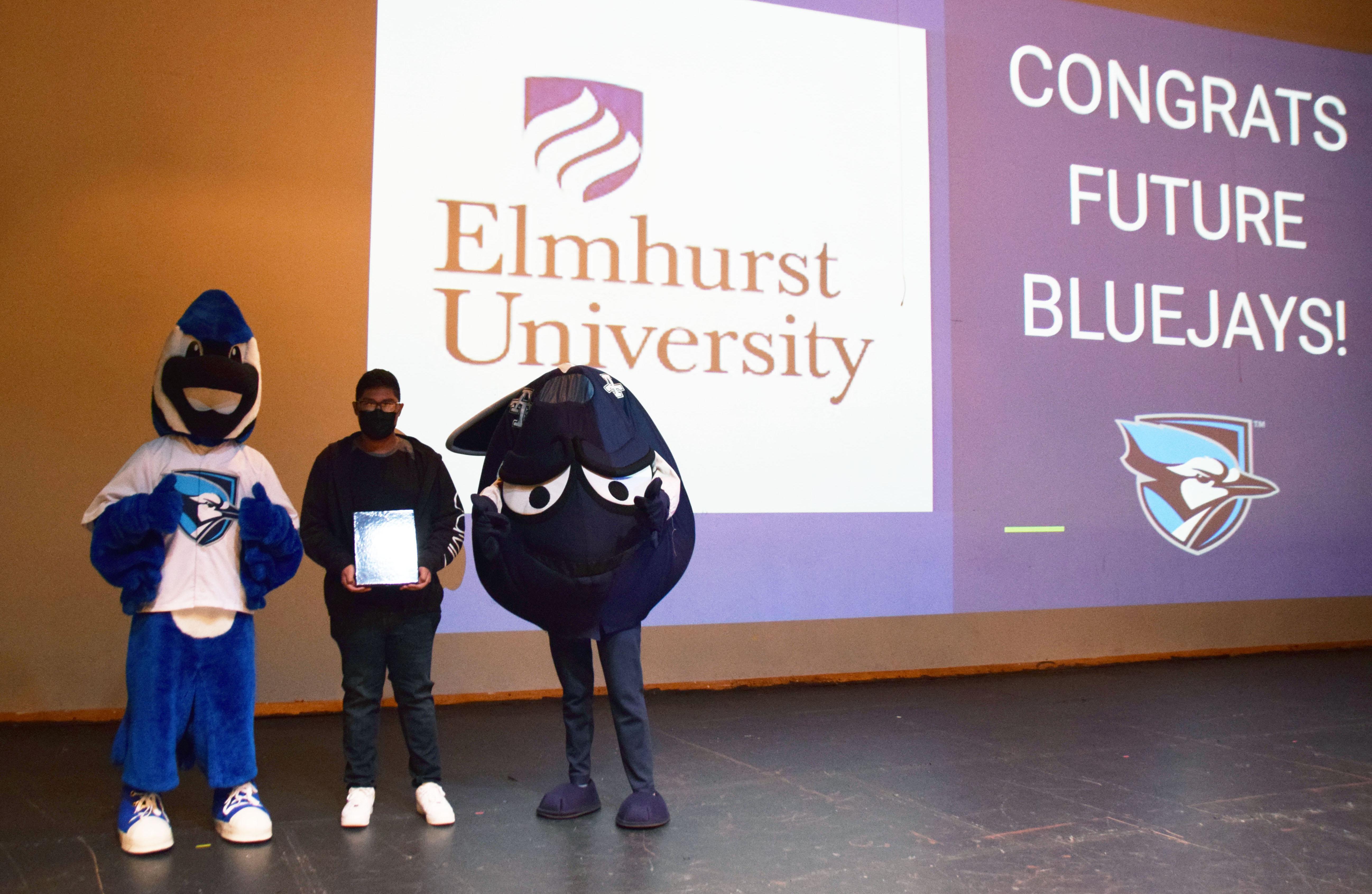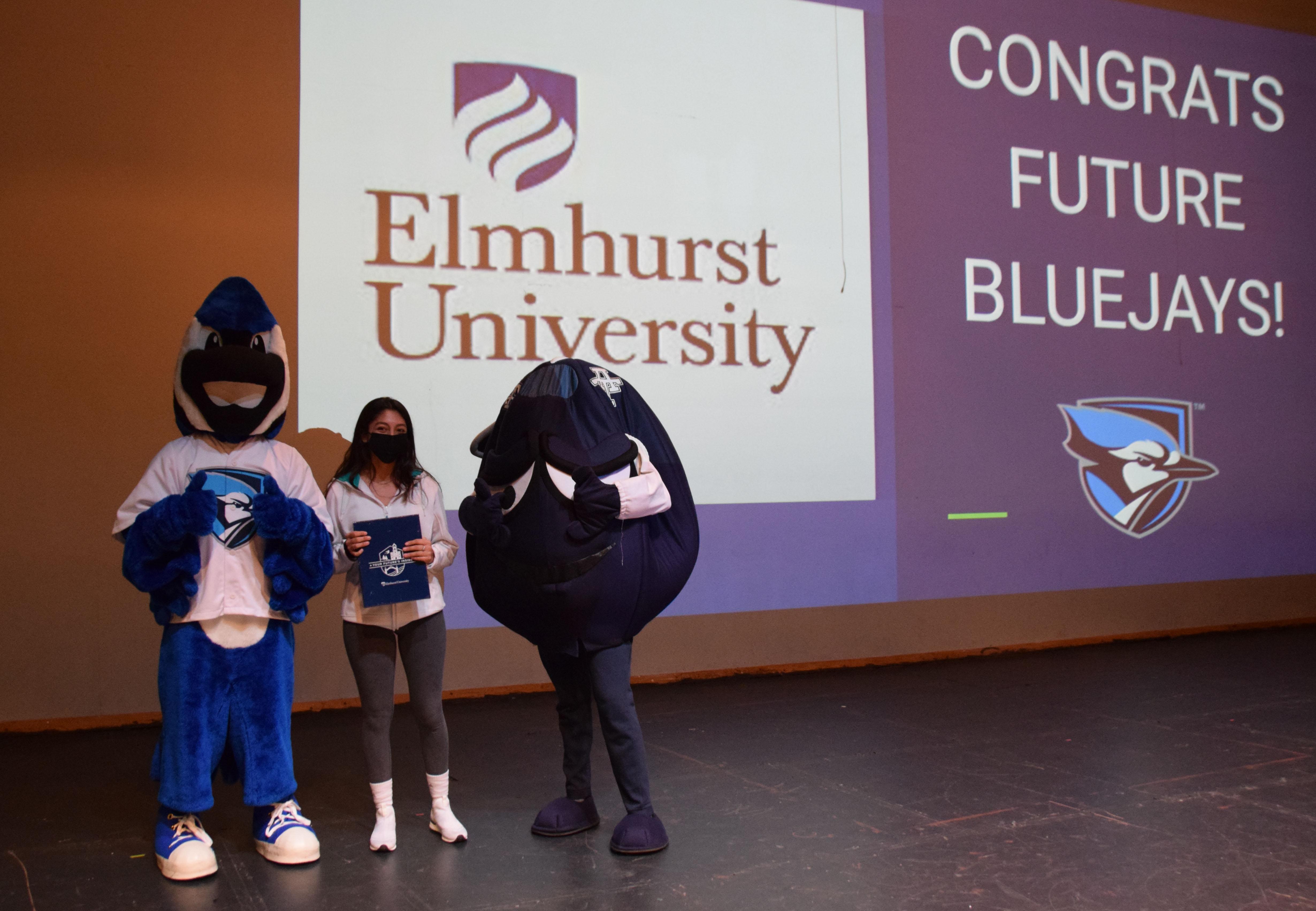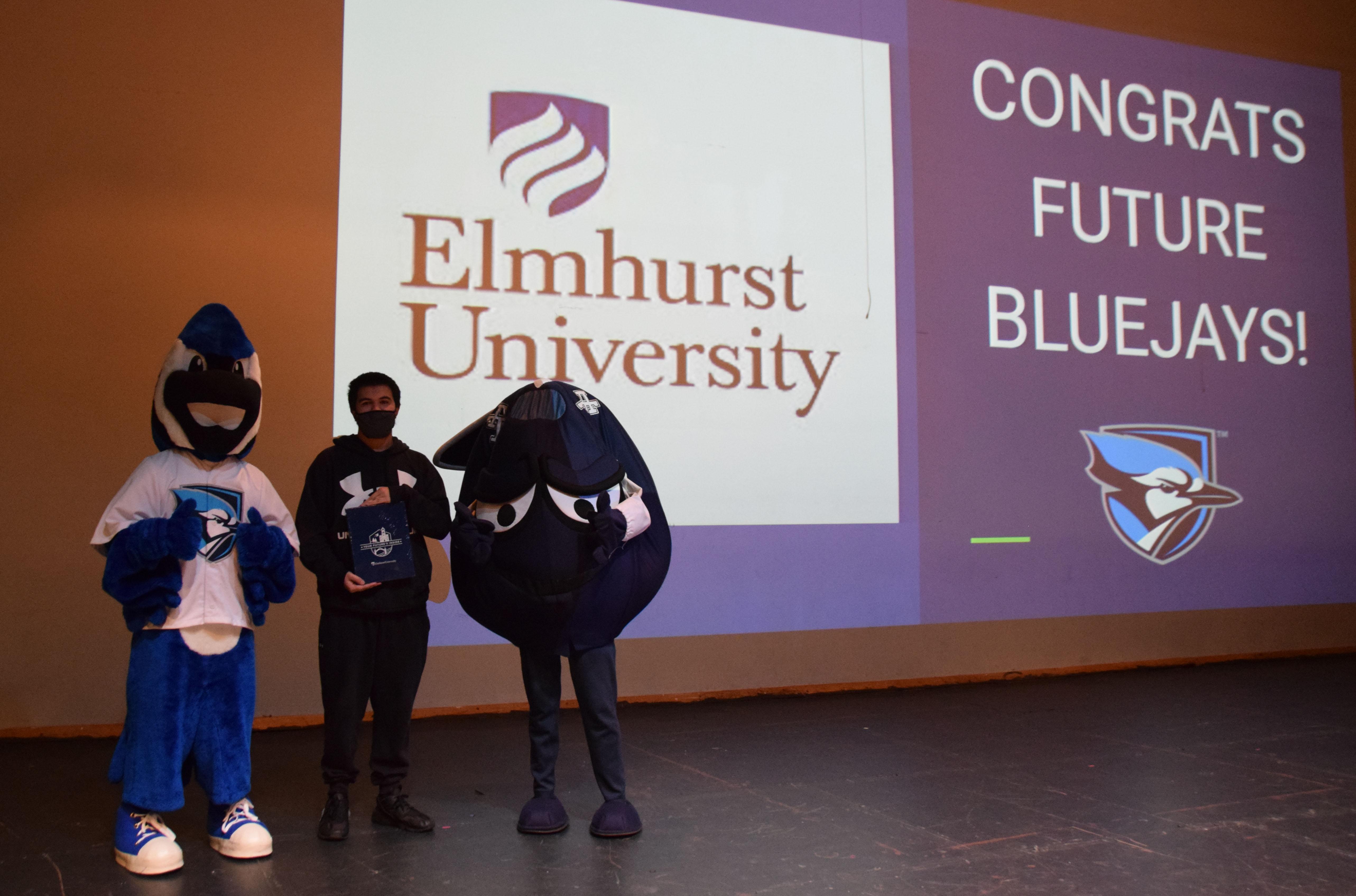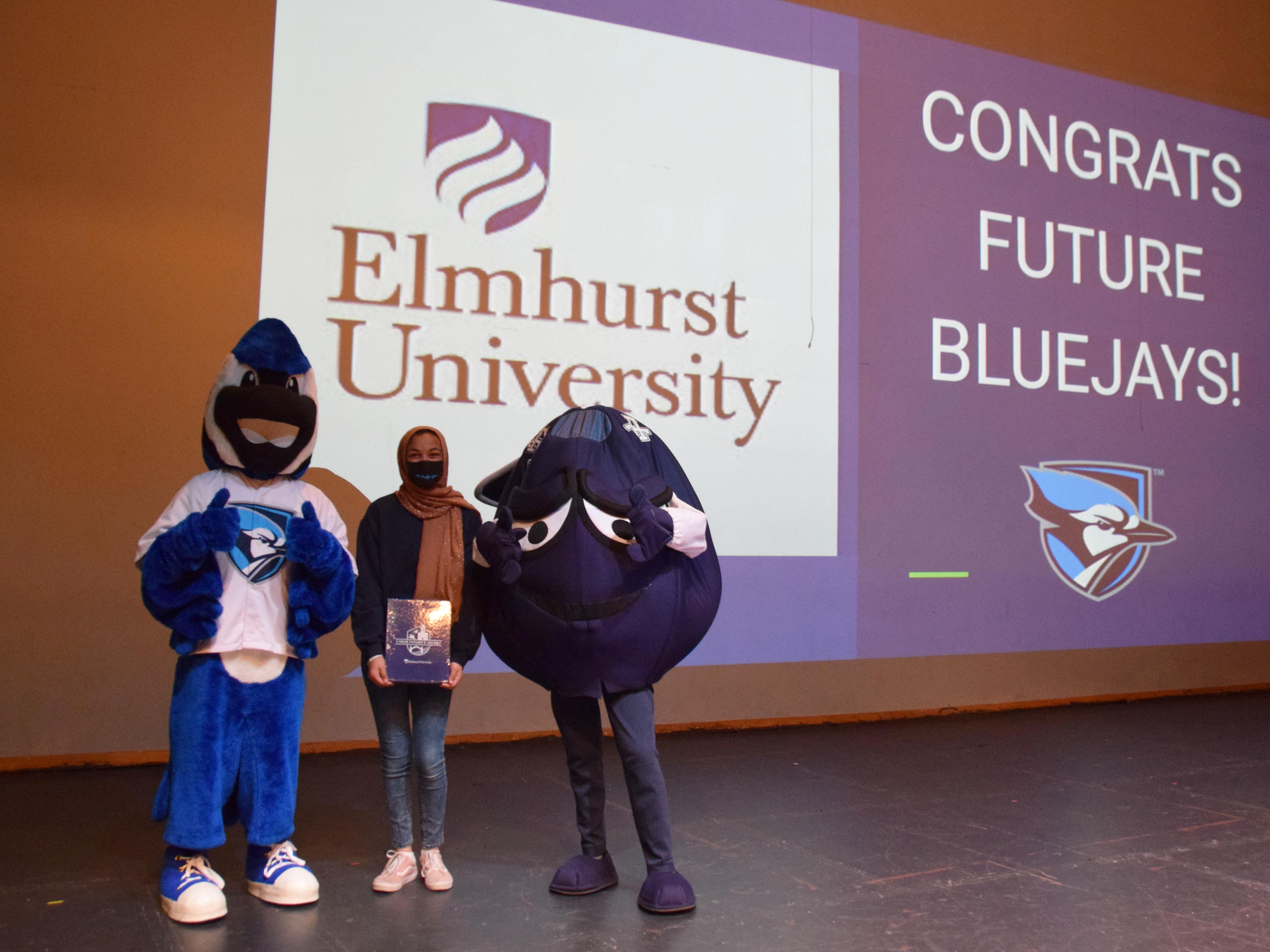 The students were surprised with the announcement and a visit from Elmhurst University Senior Director of First-Year and International Admission Christine Grenier, Associate Director of First-Year Admission Megan Wajda, Victor E. Bluejay (Elmhurst University’s mascot) and Bucky Blazer (Addison Trail’s mascot). Grenier, Wajda and Addison Trail Guidance Counselor Shane Cole congratulated the seniors on being admitted to the university through its Early Action program and encouraged them to continue working hard to pursue their goals. To watch the presentation, click on the video above. To view photos from the event, see the gallery below.