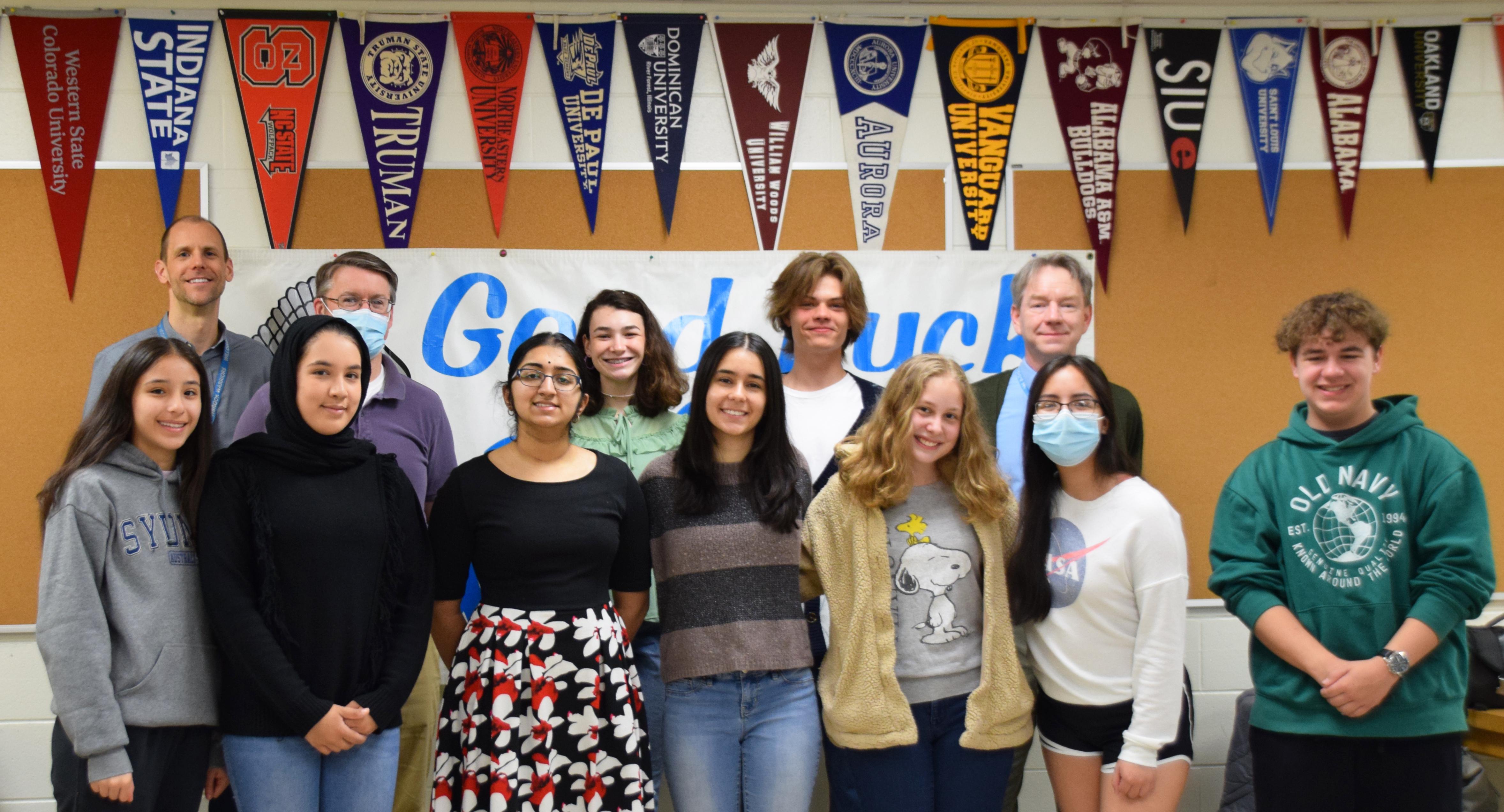 Pictured are (front row, from left) freshman Ruby Pina-Villegas, senior Naba Khan, junior Neeraja Kumar, sophomore Ariel Hoda, senior Emma Wrzeszcz, junior Lia Galindo, sophomore Jared Creech, (back row, from left) Science Olympiad adviser Dr. James Kedvesh, adviser John Fouser, sophomore Sophia Marino, freshman Caius Polivka (a member of the Junior Varsity Science Olympiad Team) and adviser Ben Fenske.