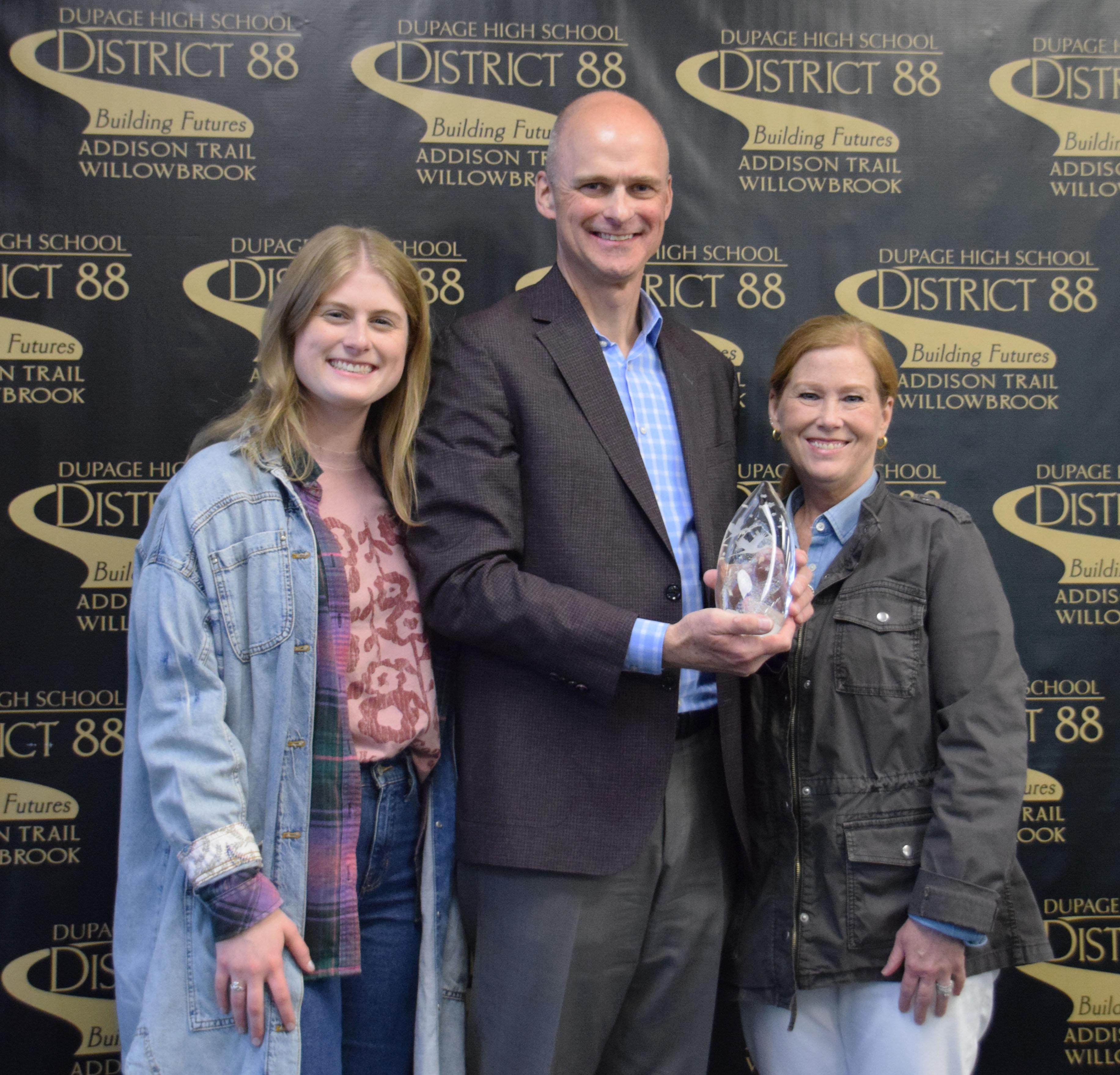 The Board presented Langton with four resolutions – from District 88, the Village of Addison, Sen. Don Harmon and the Illinois House of Representatives (Deb Conroy, Terra Costa Howard and Kathleen Willis). See the resolutions at https://dupage88.net/site/public/files/?item=6383. The Board and administration also commissioned a customized free-blown glass crystal sculpture for Langton, which was created by retired District 88 staff member Robert Lee Fritz.