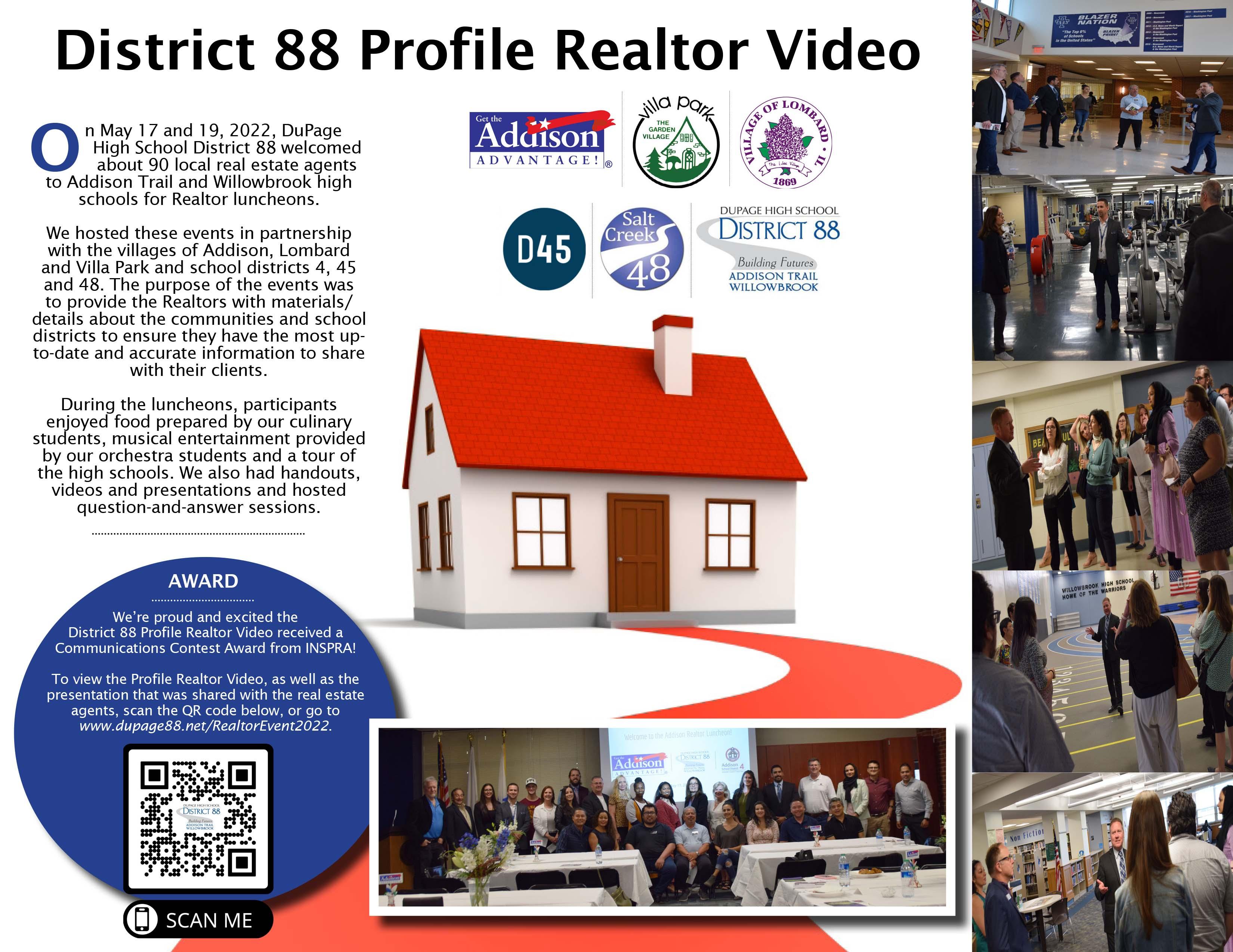The video was created for luncheons the district hosted in May 2022 for about 90 local real estate agents. The events were hosted in partnership with the villages of Addison, Lombard and Villa Park and school districts 4, 45 and 48. To view the “District 88 Profile Realtor Video,” as well as the presentations that were shared with the real estate agents, click on the videos and links below.