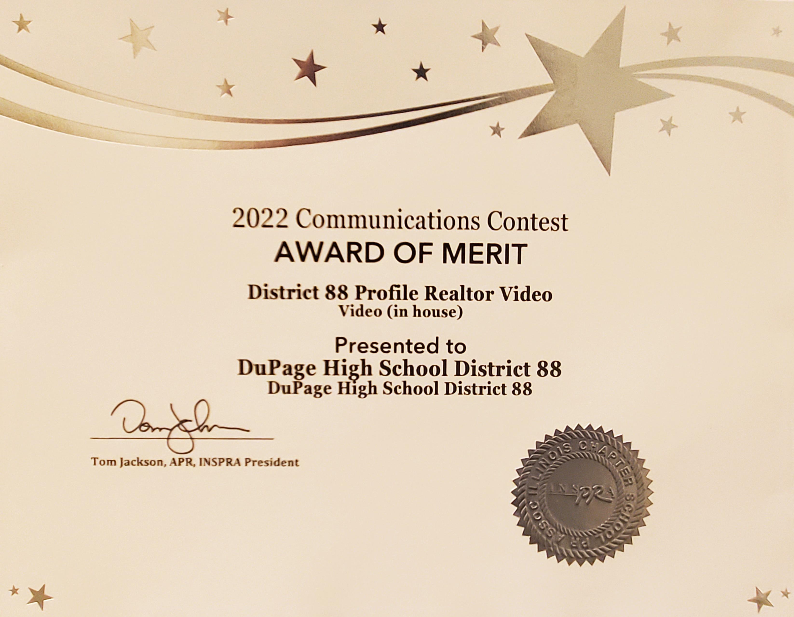 District 88 received an Award of Merit in the Video (in house) category for the “District 88 Profile Realtor Video.” The entry was judged by a panel of three communications professionals, based on standards of excellence.