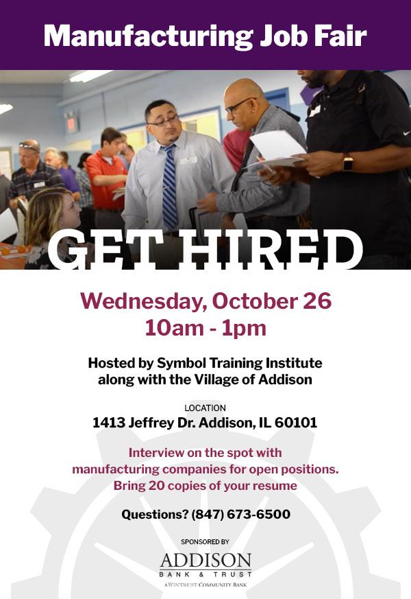 The event is being hosted by the Village of Addison and Symbol Training Institute and is sponsored by Addison Bank & Trust. The fair will take place from 10 a.m. to 1 p.m. on Oct. 26 at Symbol, 1413 Jeffrey Drive. Participants should bring 20 copies of their résumé, as they will have the opportunity to interview with manufacturing companies on the spot for open positions.