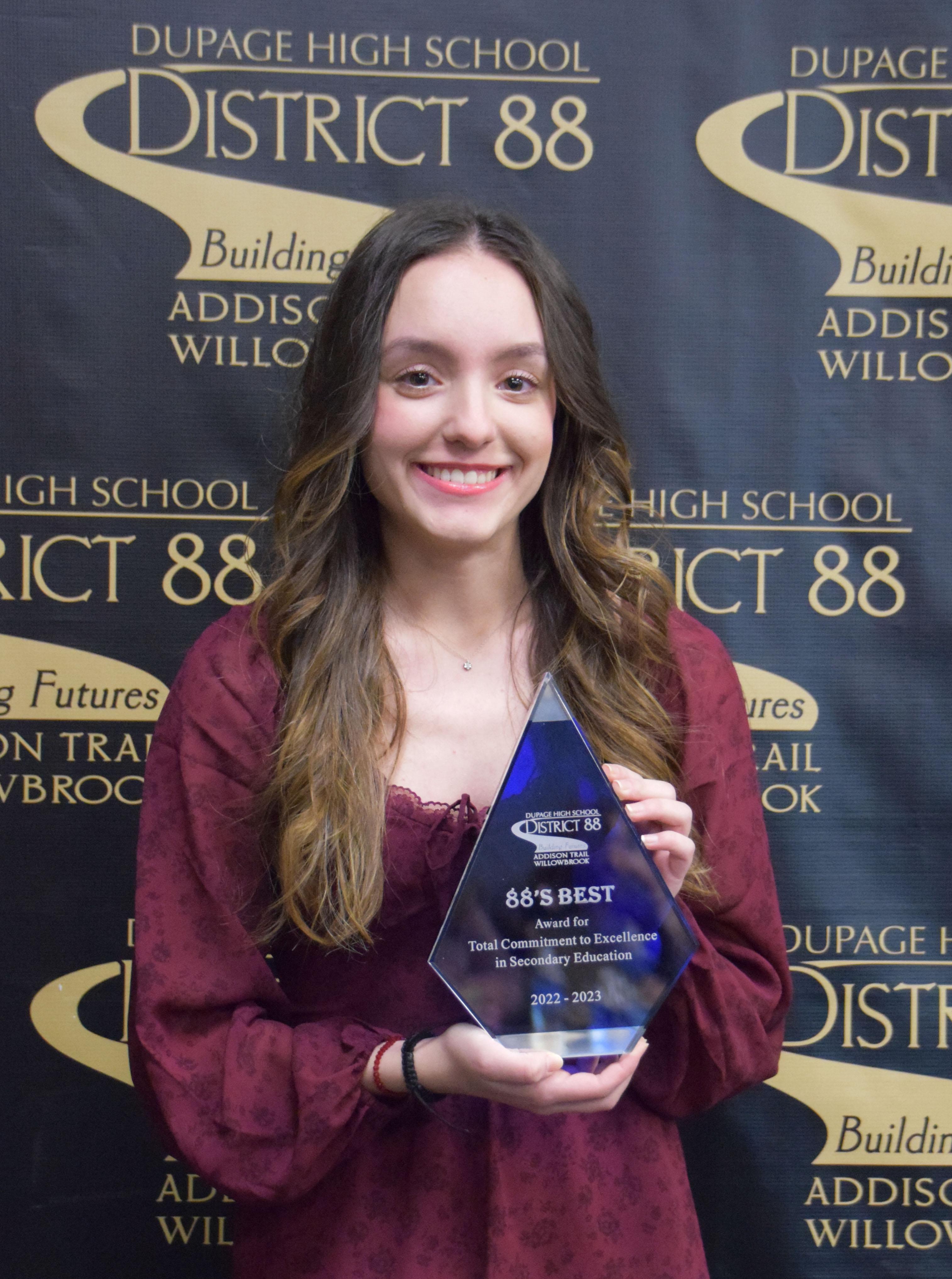 “Hoda embodies what District 88’s Best is all about. She has a long list of impressive accomplishments, both in the classroom and during extracurriculars. As one of her coaches for cross-country and track & field, I would like to share some of what she has achieved while running. In the past year, Hoda has done all of the following: broke 6 minutes in the mile, finished 11th at Regionals (which qualified her for Sectionals) and ran the fourth-fastest 3-mile time in Addison Trail history. These are all tremendous achievements, but it is Hoda’s attitude, work ethic, humility and sense of humor that truly set her apart and make her so deserving of this award.”