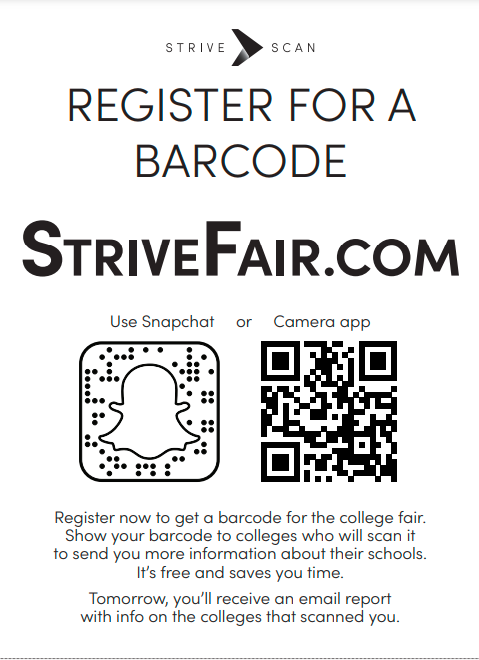 Students are encouraged to use StriveScan, an app that allows them to share their contact information quickly and easily with the post-secondary institutions in attendance. To register, scan the QR code above (at right).